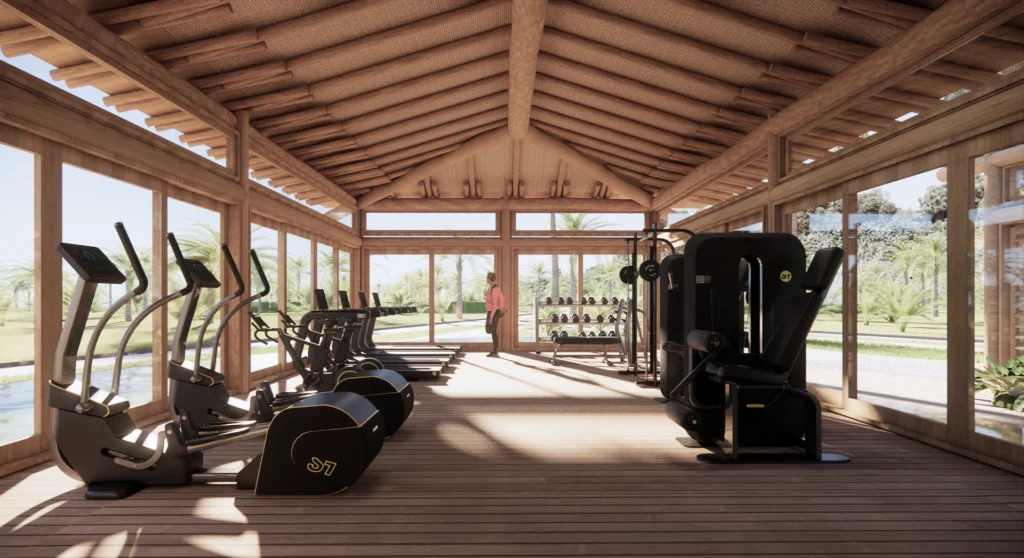 A academia integrada à natureza promove uma relação mais fluida entre corpo e paisagem, enquanto o espaço kids foi idealizado para oferecer liberdade e segurança em meio a um ambiente lúdico e acolhedor. A portaria com design contemporâneo, por sua vez, traduz o primeiro contato com o empreendimento, revelando desde a chegada o cuidado com a estética e a experiência do usuário.