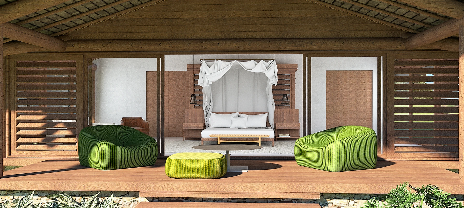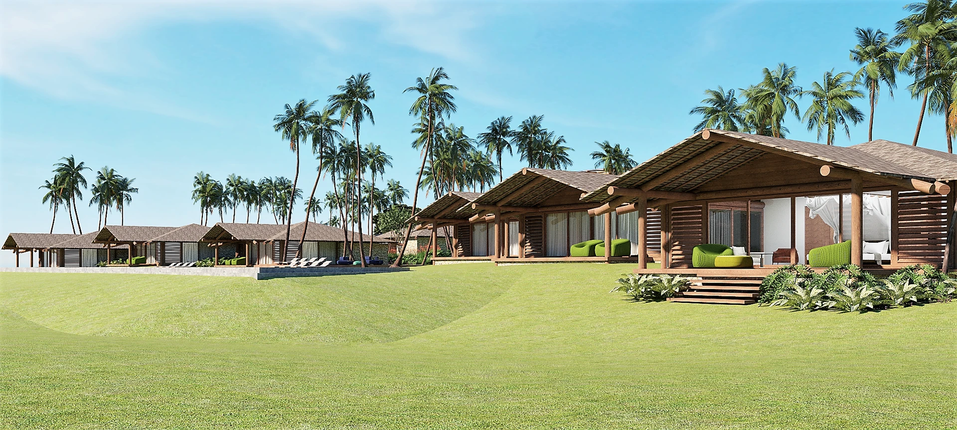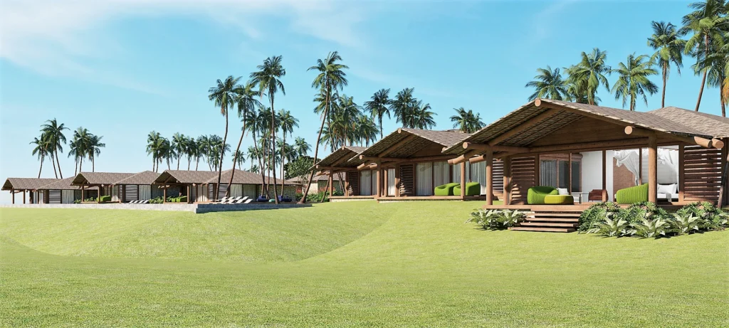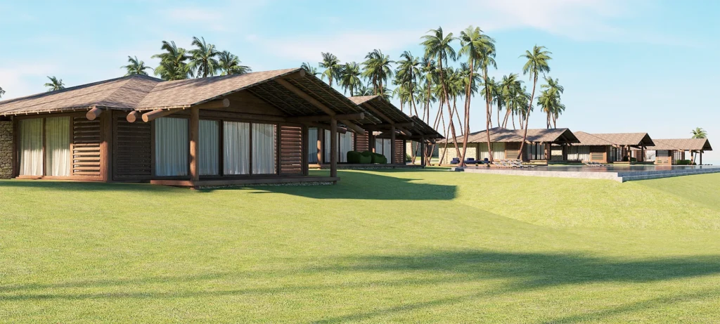 O Conceito: Hotelaria de Experiência O estudo explorou a criação de aproximadamente 20 suítes generosas, todas posicionadas estrategicamente frente ao mar. A topografia privilegiada de Guaiú — plana e pontuada por coqueirais — permitiu desenhar um hotel que se espalha suavemente pelo terreno, mantendo a vegetação baixa como protagonista da paisagem.