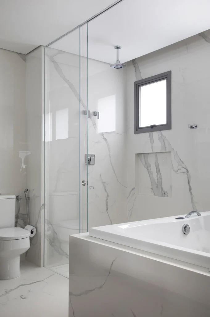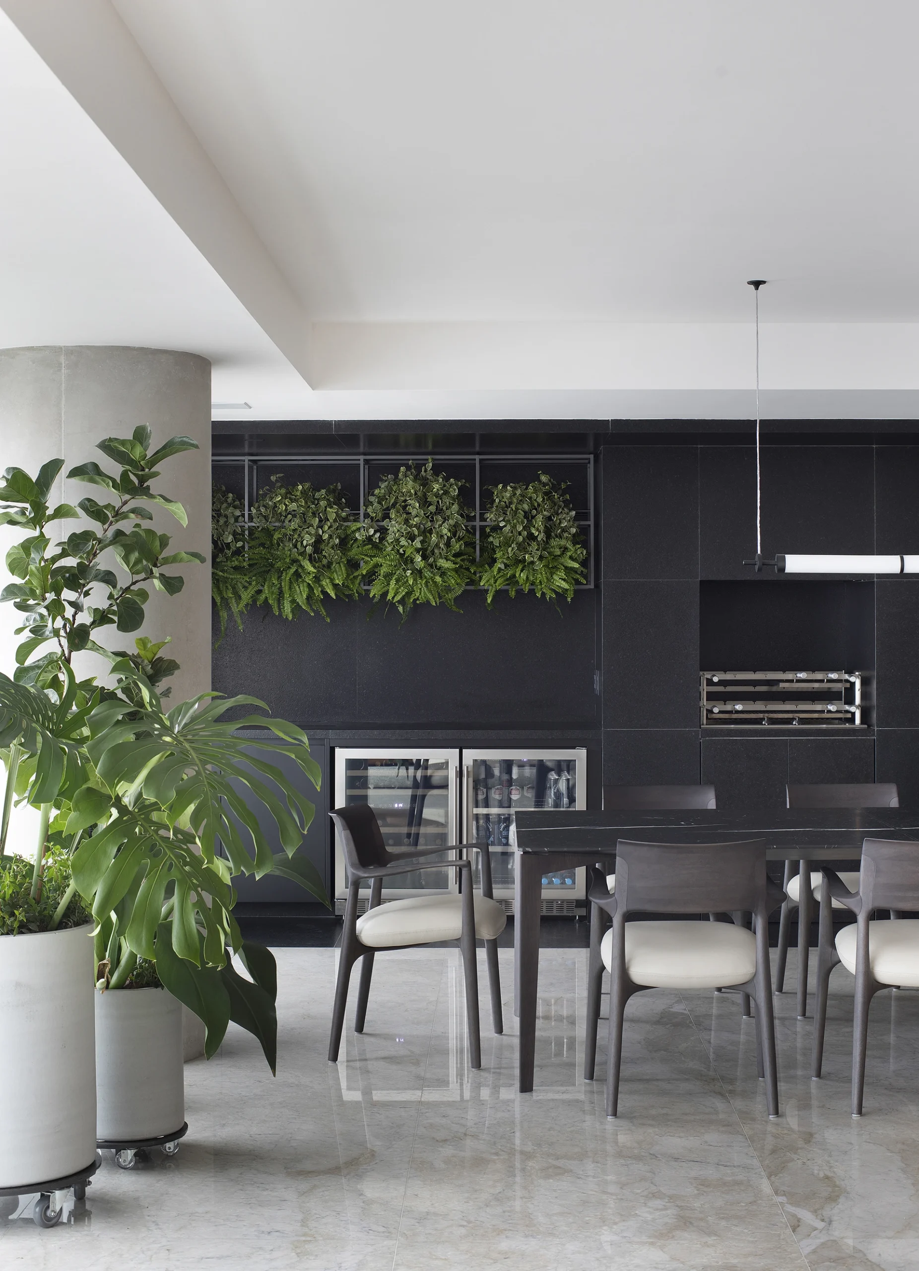O briefing apontava um desejo essencial: criar uma área social ampla, fluida e totalmente integrada, capaz de receber familiares e amigos com conforto. A resposta foi uma composição generosa onde sala de estar, home theater, sala de jantar, cozinha e churrasqueira se conectam sem barreiras, formando um único ambiente contínuo. O elemento-chave desse conjunto é o grande volume em mármore preto, que camufla a área da churrasqueira e se integra discretamente ao espaço, minimizando sua presença visual e valorizando a estética da sala de jantar.