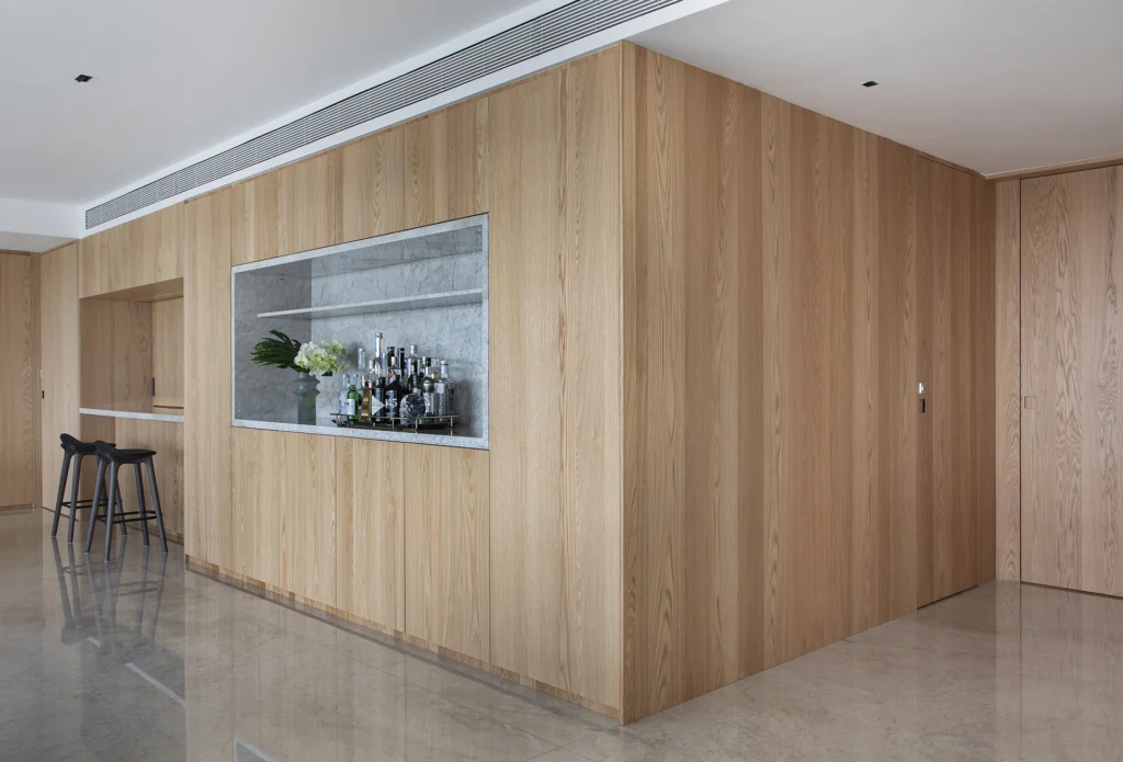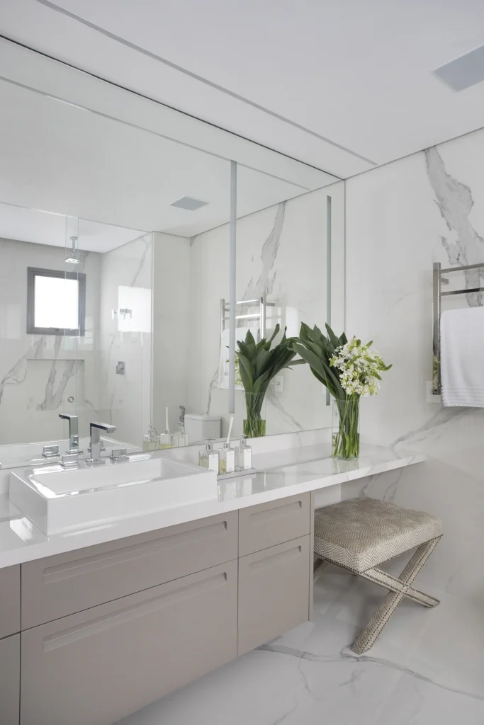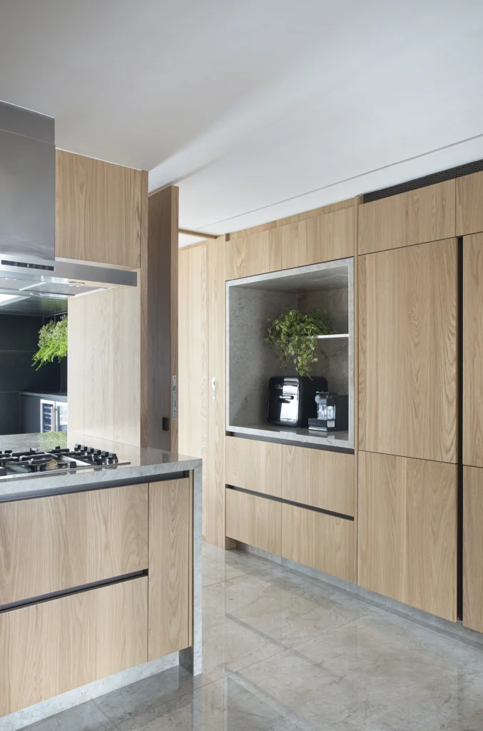 Apesar de ser uma reforma em um prédio novo, a transformação foi completa, com realocação estratégica dos pontos elétricos e hidráulicos. Materiais naturais definem a atmosfera: mármore Baccarat no piso da área social, painéis em madeira de reflorestamento, granito São Gabriel escovado na estrutura da churrasqueira e madeira de reflorestamento no piso da área íntima, que recebe paredes brancas e linguagem mais leve.