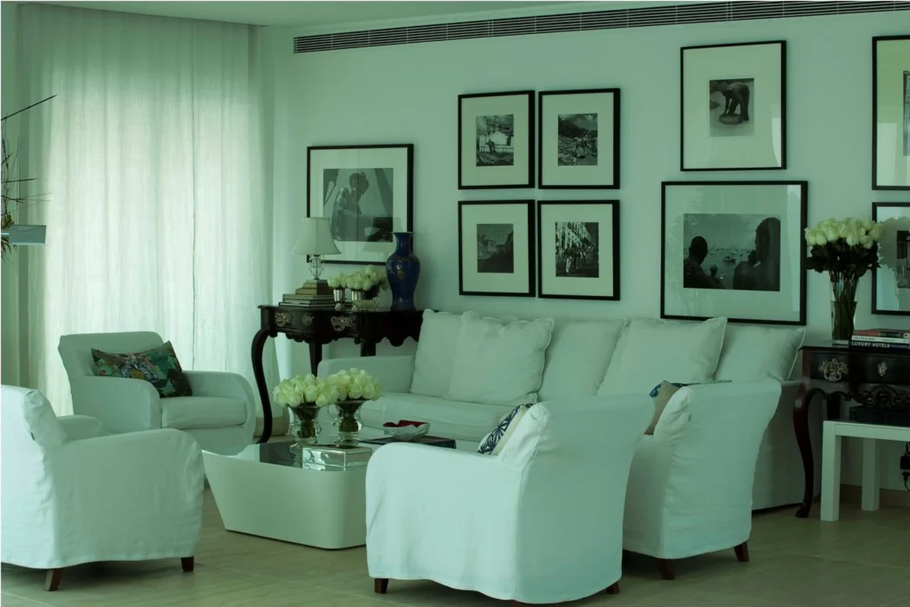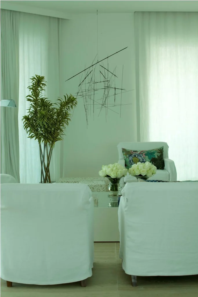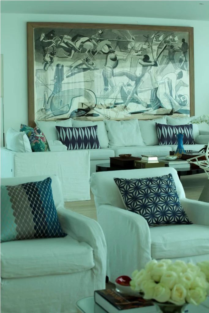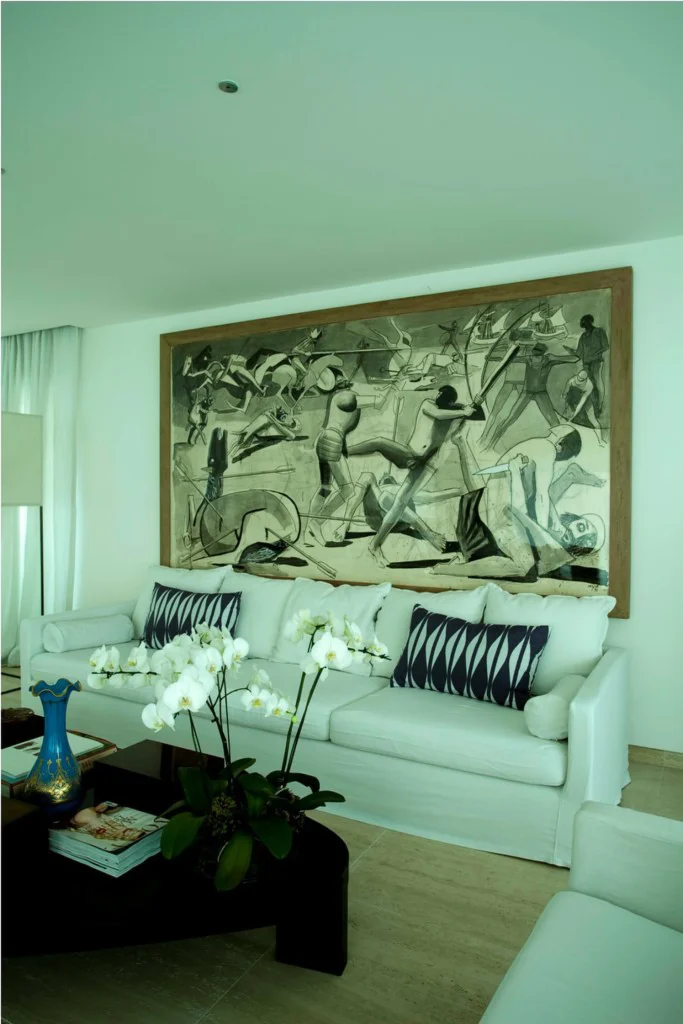 O projeto celebra a história da cliente ao integrar com maestria peças do século XIX a ícones do modernismo e da arte contemporânea. O living é pontuado por obras de peso, como a força geométrica da escultura de Knopp Ferro, o lirismo de uma tela de Candido Portinari e o olhar gráfico das fotografias de Mário Cravo.