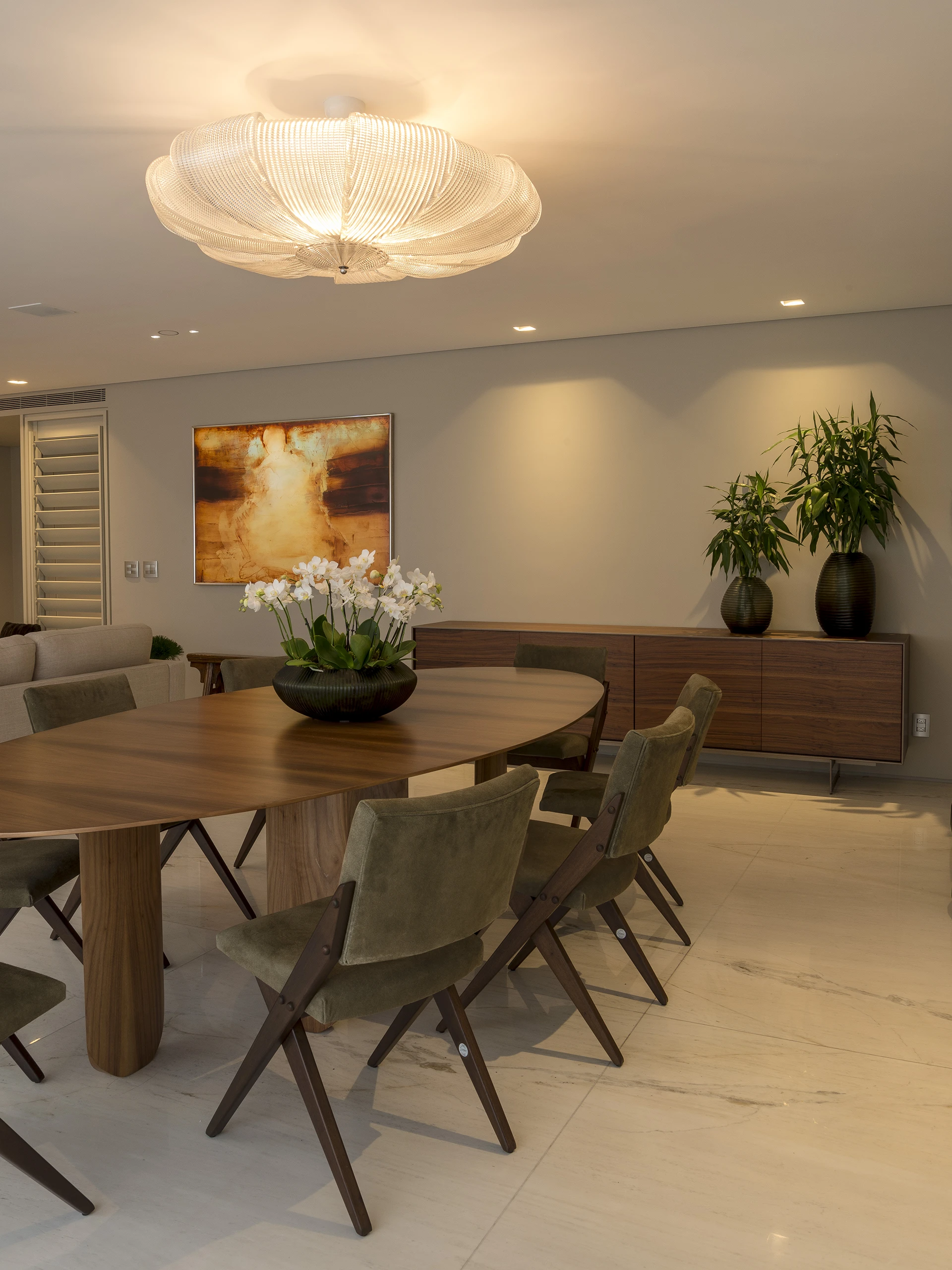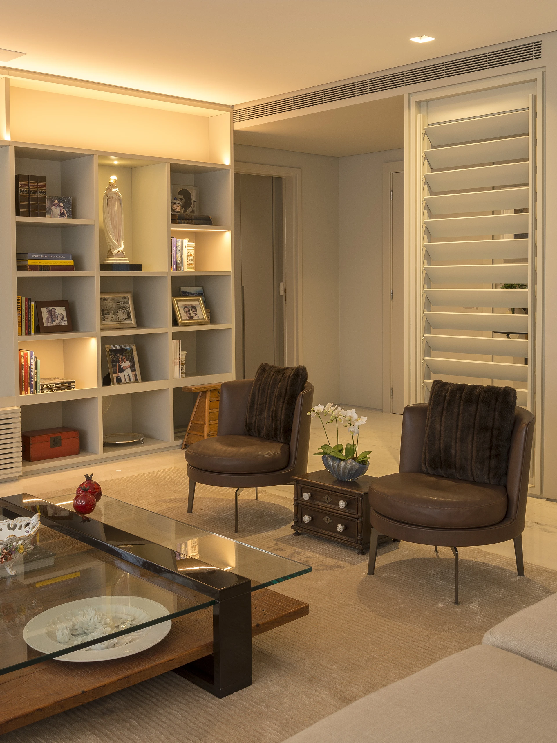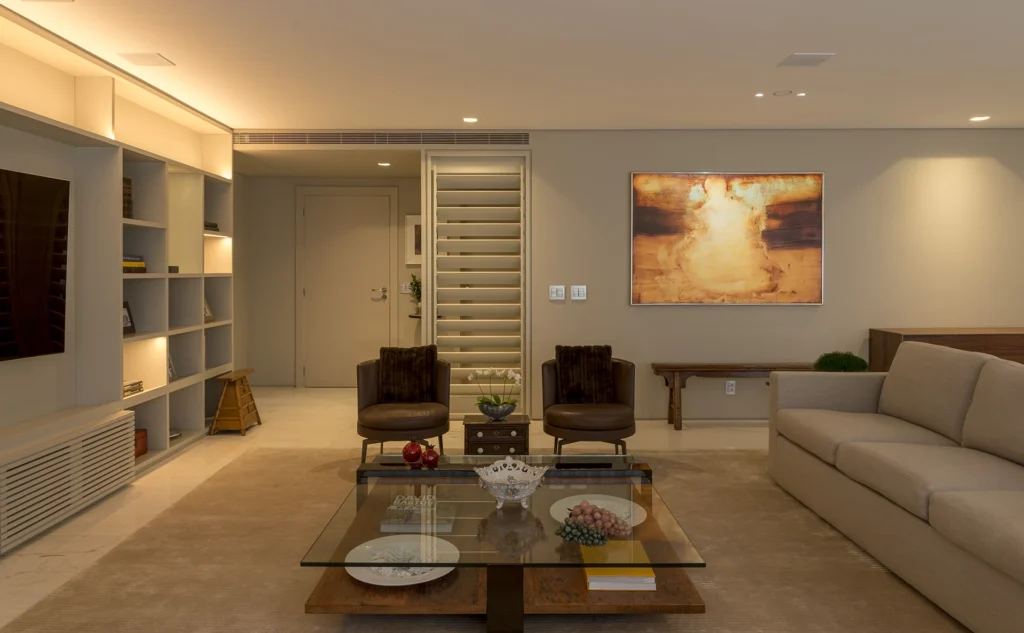 A composição final combina materiais neutros, marcenaria sob medida e mobiliário de design, reforçando o equilíbrio entre conforto e sofisticação — marca registrada do escritório. Cada escolha dialoga com a estética desejada pelo cliente, potencializada pela experiência arquitetônica de David Bastos.