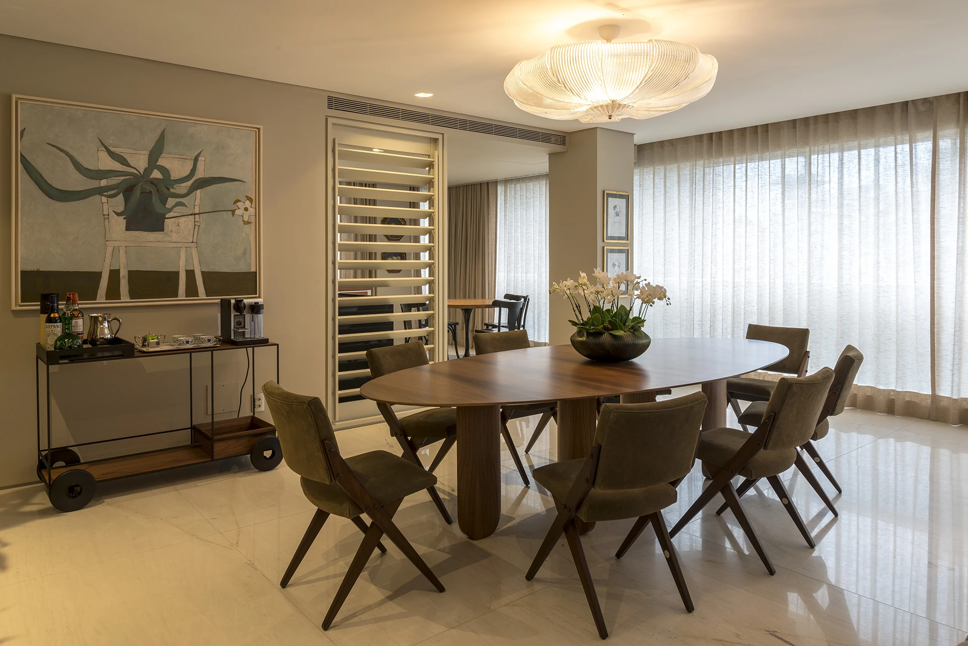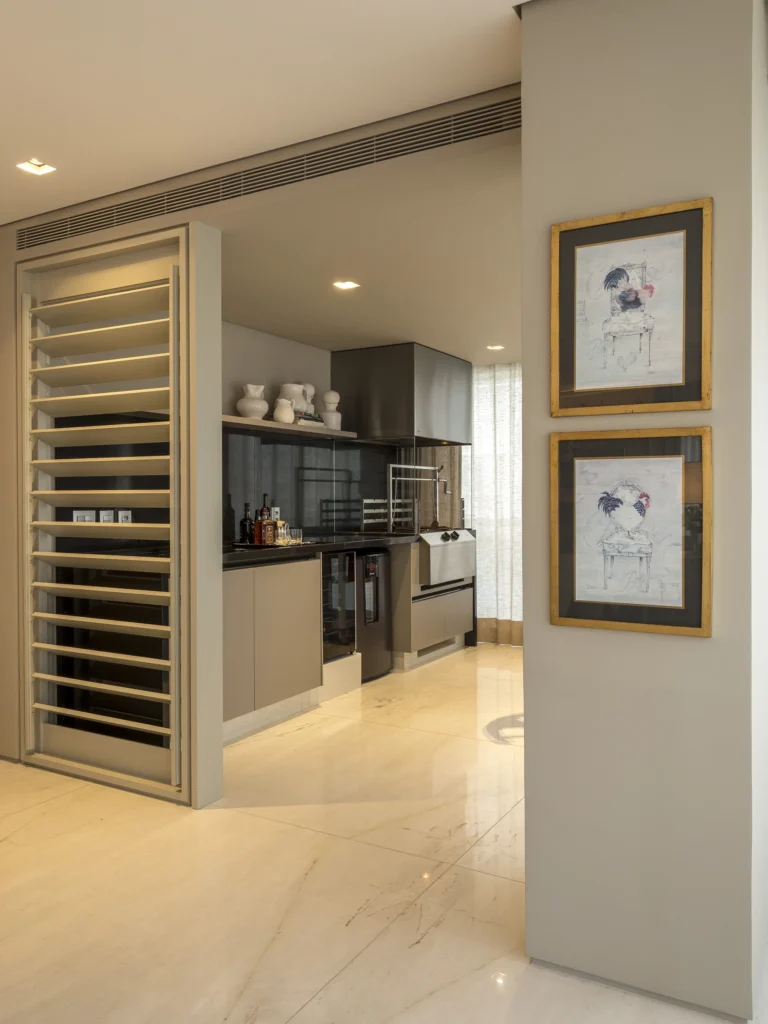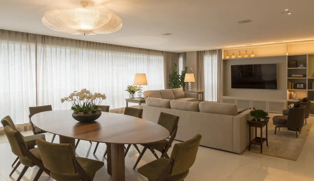 A antiga varanda, agora fechada, foi incorporada ao living e transformada em uma área gourmet com churrasqueira, ampliando a experiência social do apartamento. A integração entre estar, jantar e gourmet cria um espaço contínuo e fluido, atendendo ao desejo do cliente por ambientes amplos e acolhedores.