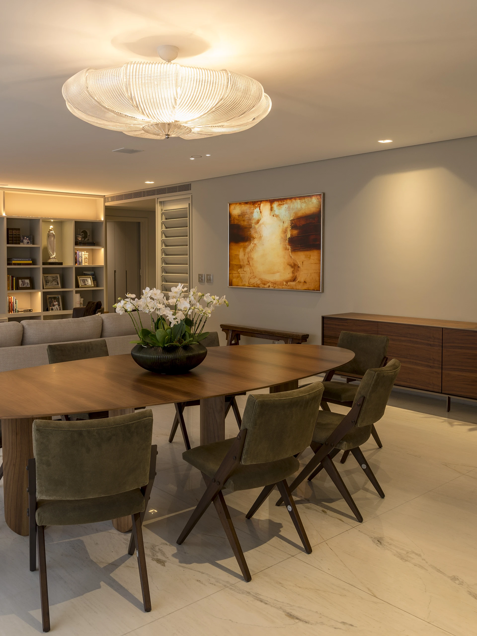 Neste apartamento no Jardins, o projeto assinado por David Bastos traduz a identidade do cliente em uma atmosfera leve, contemporânea e perfeitamente integrada. A paleta em tons de cinza claro estabelece serenidade, enquanto o piso em mármore Branco Paraná unifica os ambientes com elegância e luminosidade.