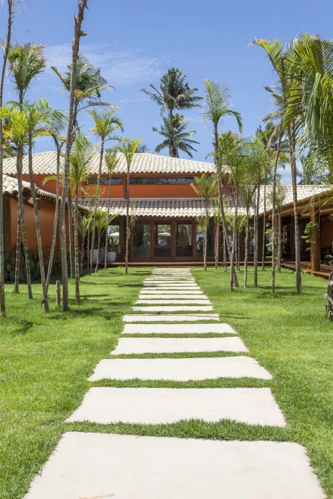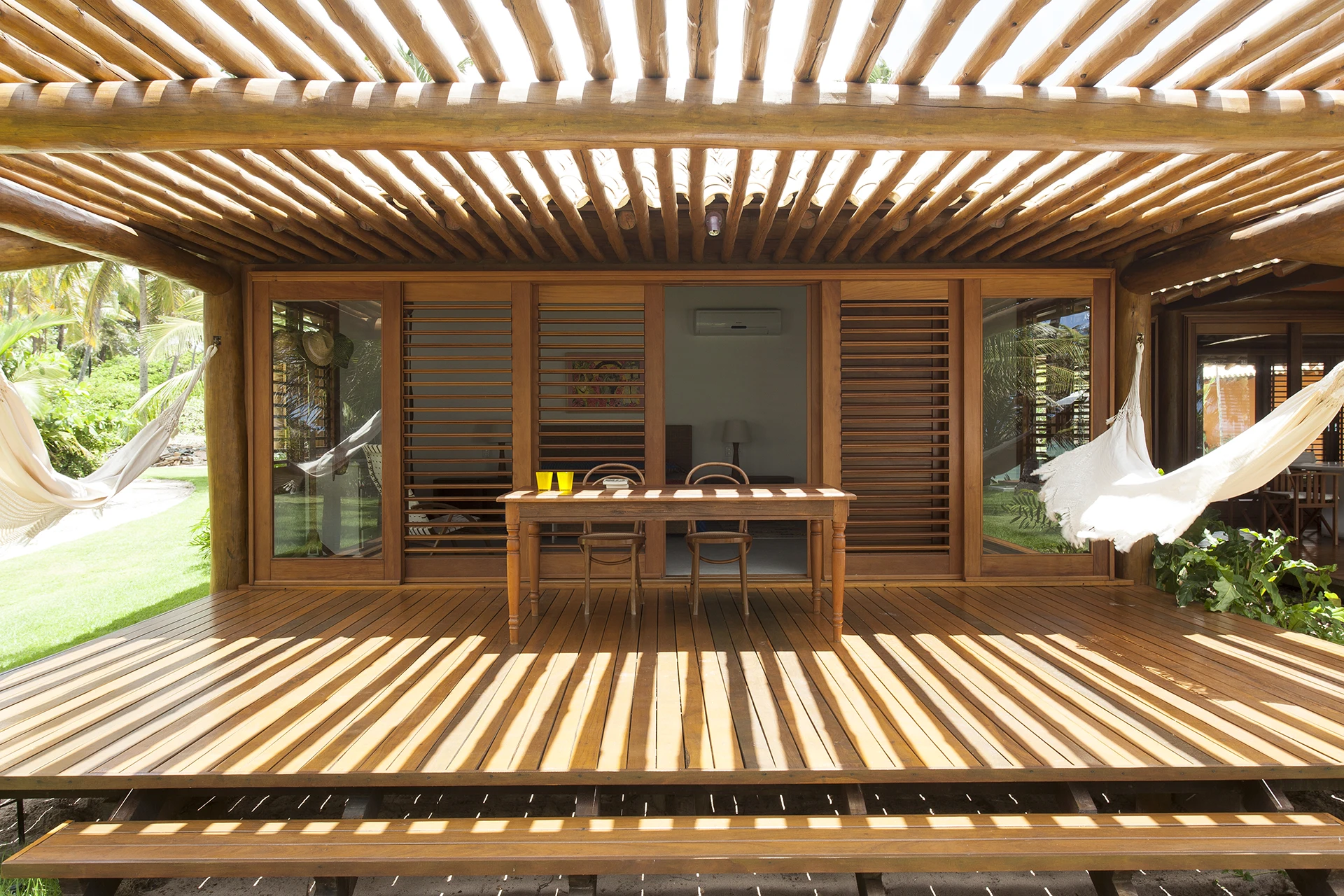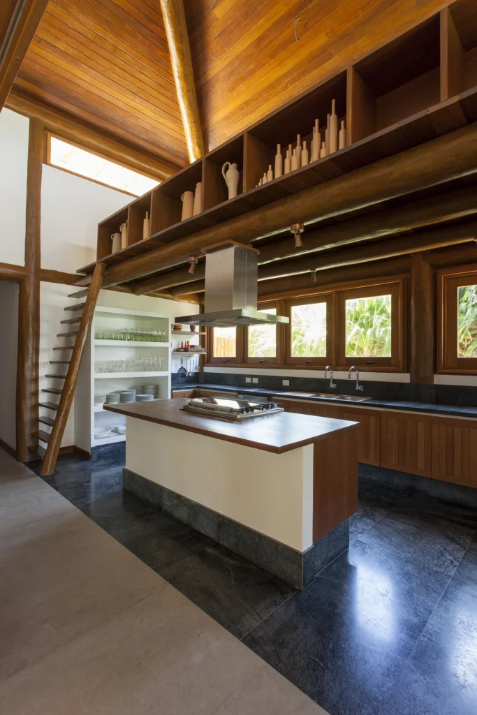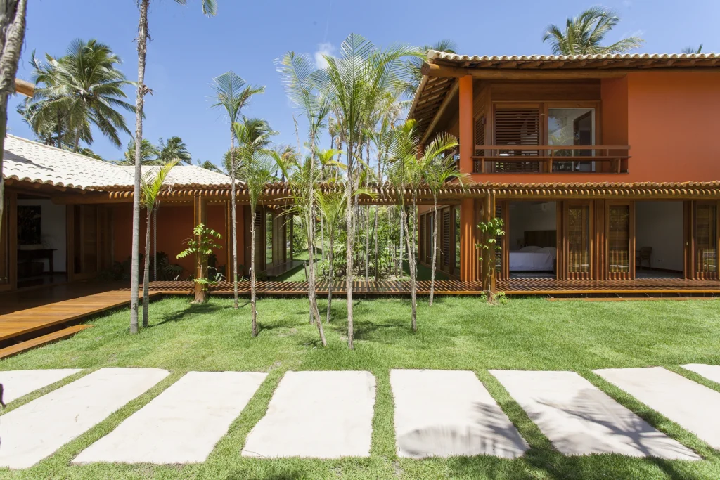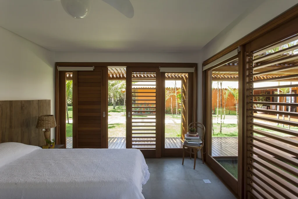 Localizada em Busca Vida, na Bahia, esta casa de praia combina estrutura de madeira, amplos panos de vidro, venezianas, tijolos aparentes e pisos de mármore em uma composição que exala leveza e acolhimento.