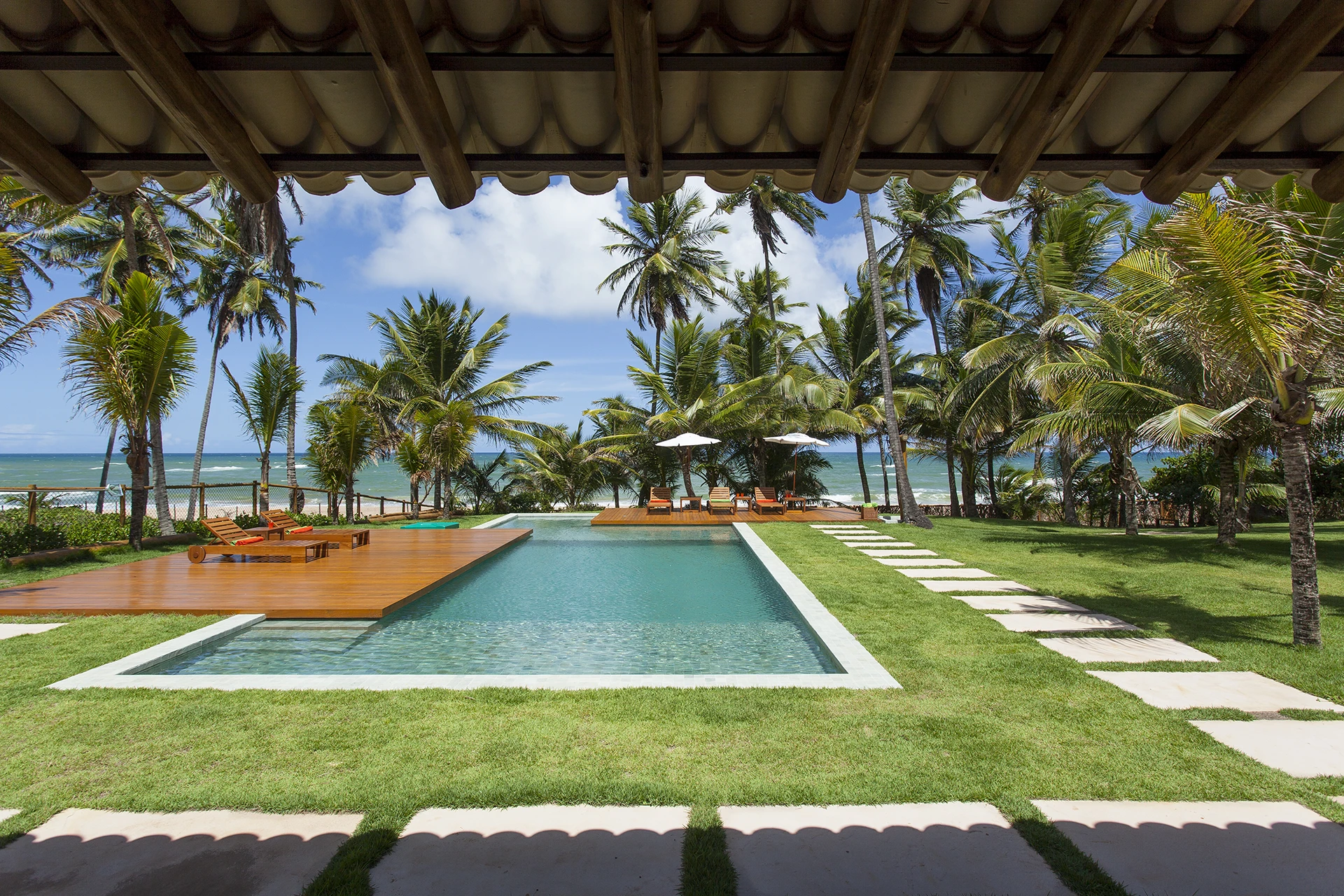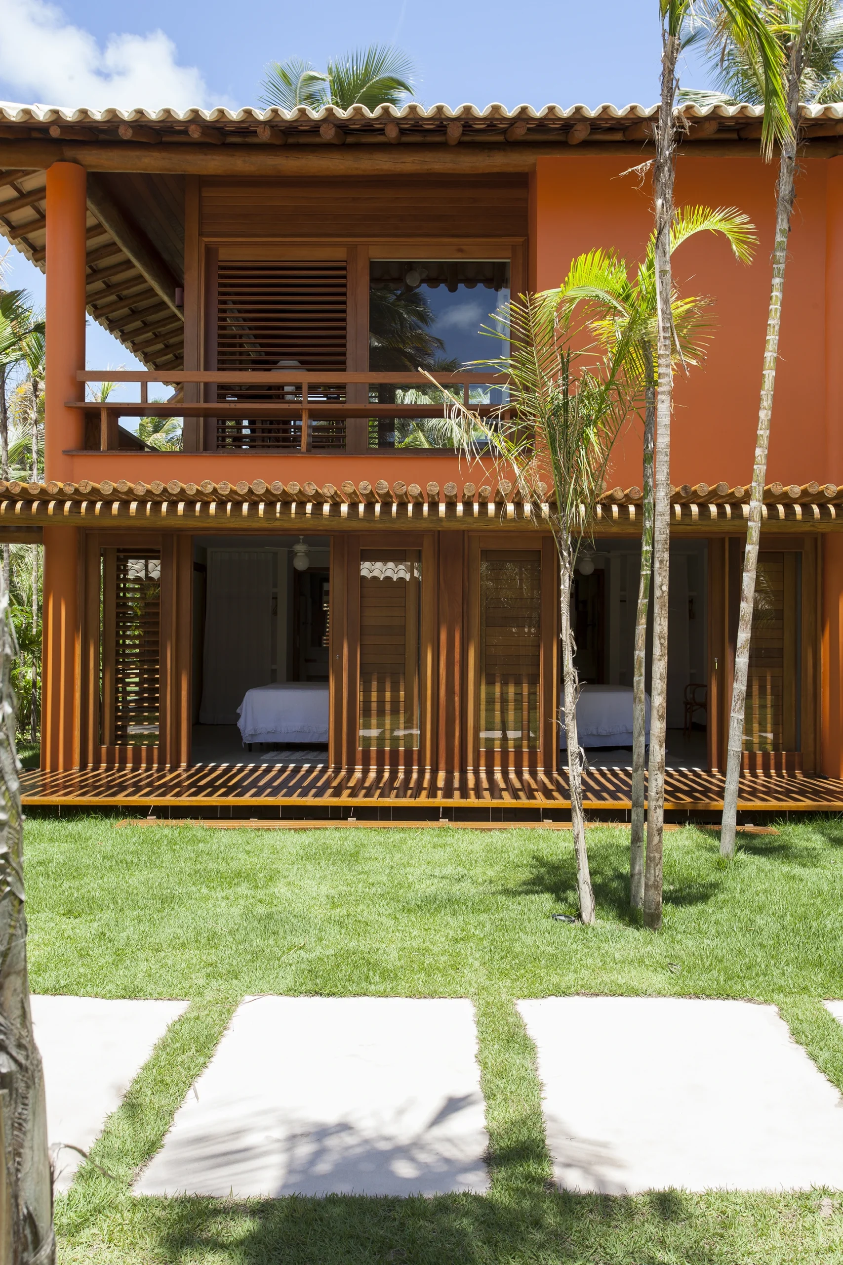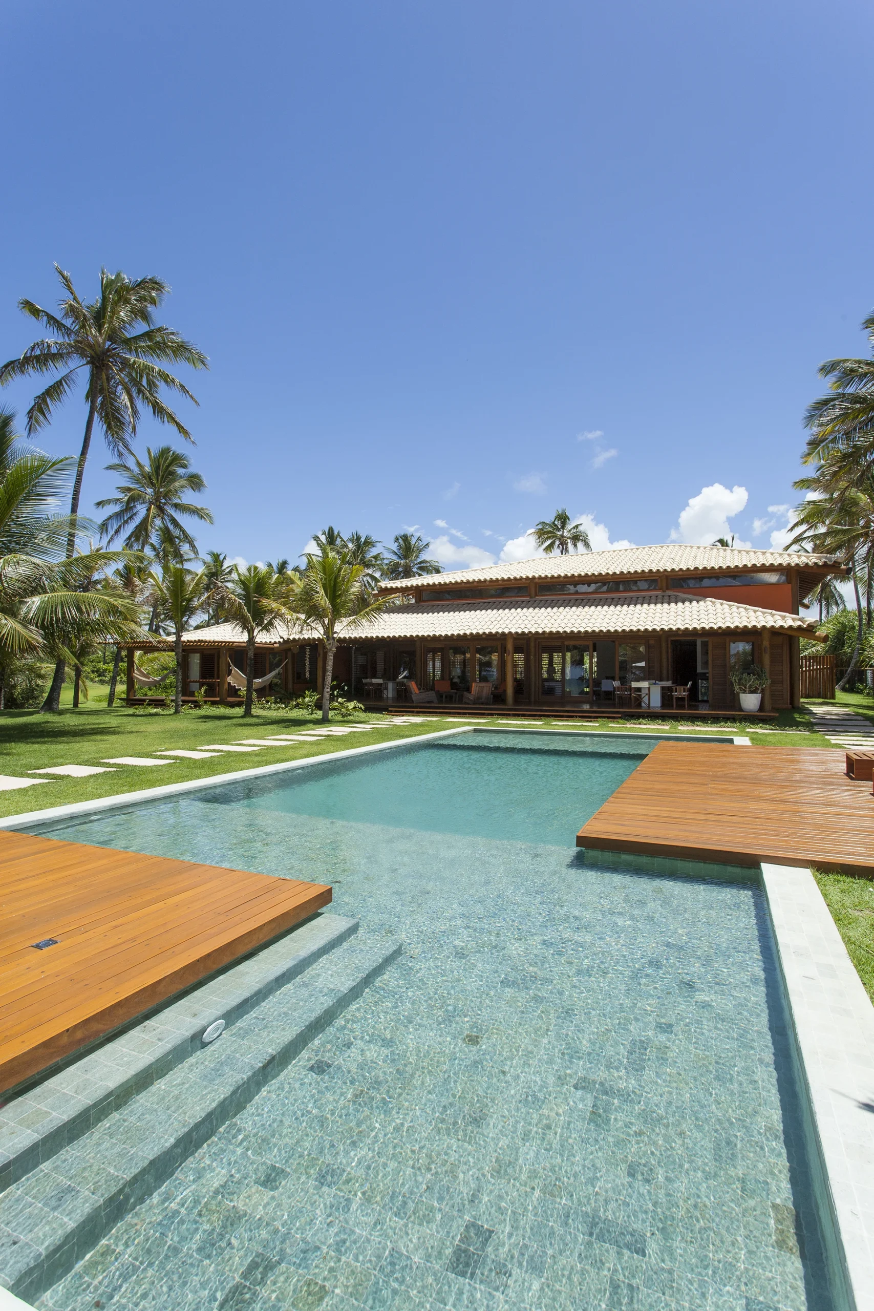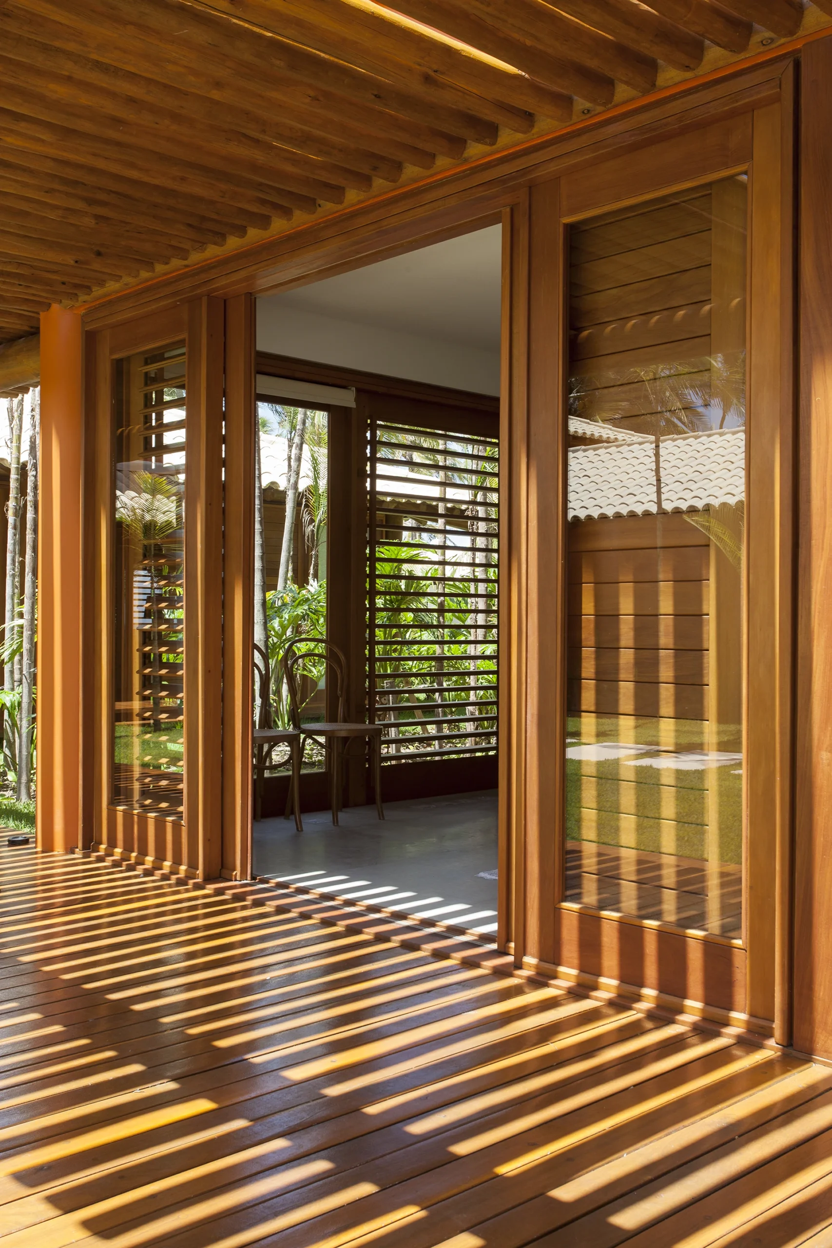 Localizada em Busca Vida, na Bahia, esta casa de praia combina estrutura de madeira, amplos panos de vidro, venezianas, tijolos aparentes e pisos de mármore em uma composição que exala leveza e acolhimento.