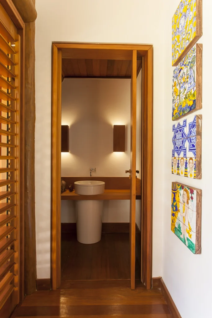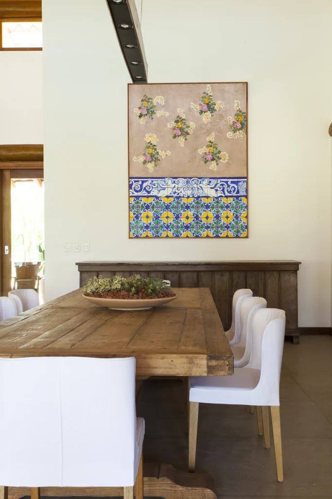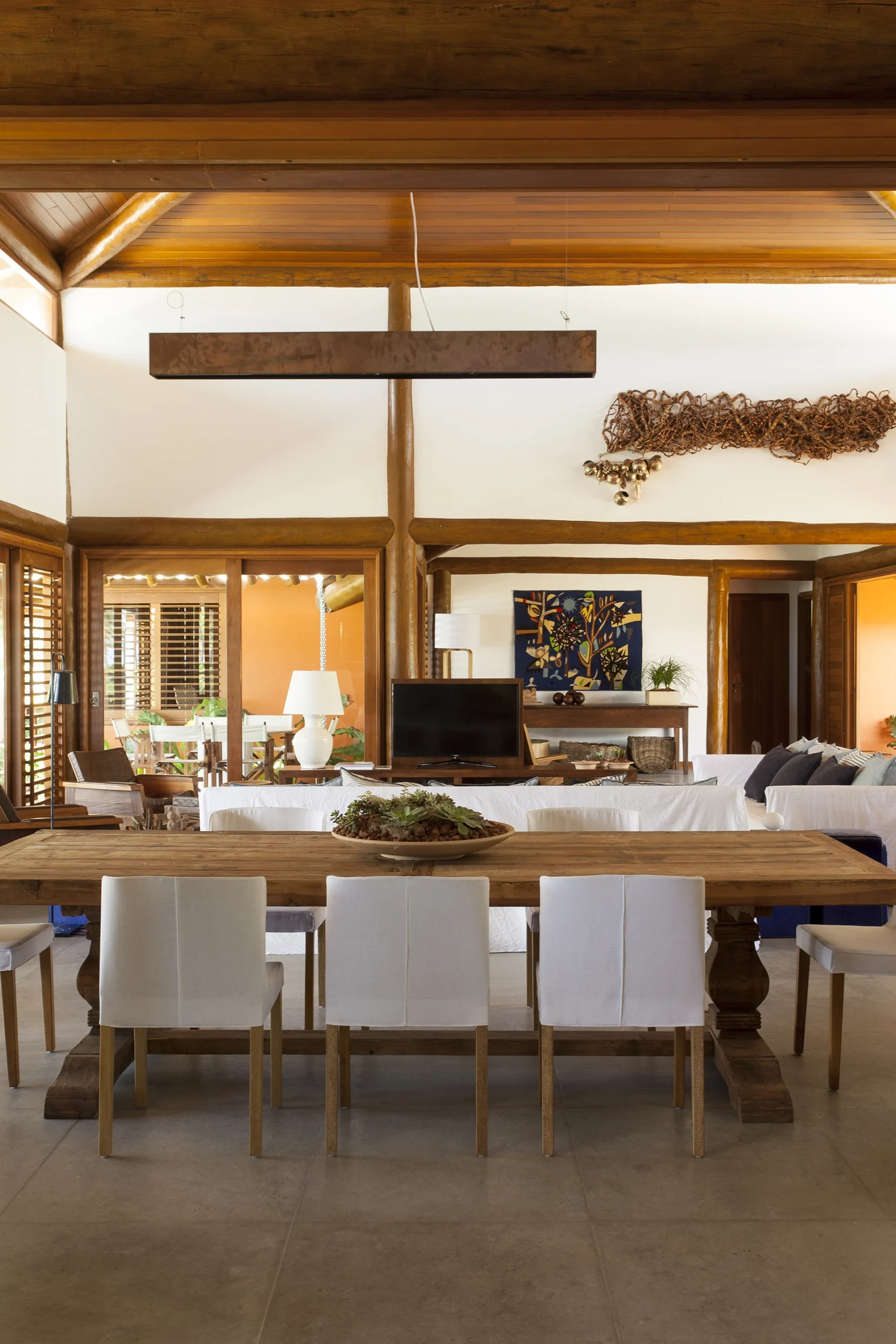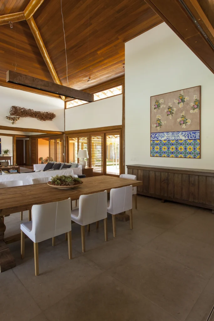 Apesar dos seus 852 m², o projeto concebido por David Bastos transmite a sensação de uma casa despretensiosa, onde a arquitetura se integra naturalmente à decoração de estilo rústico e à coleção de arte contemporânea cuidadosamente escolhida.