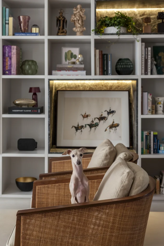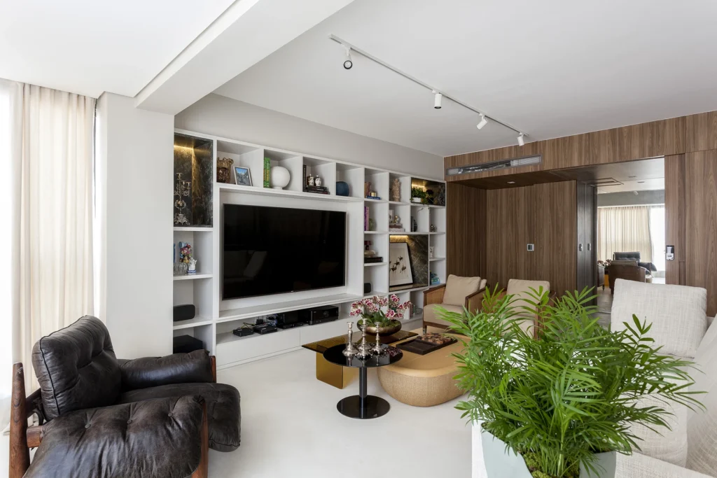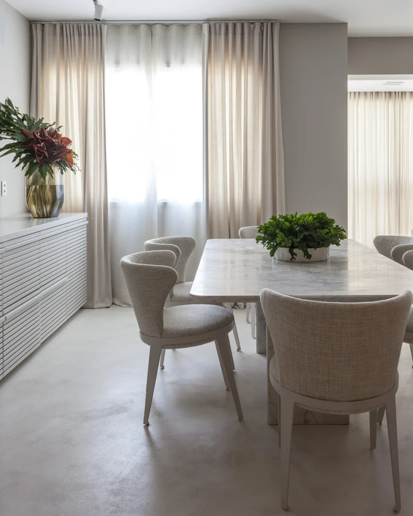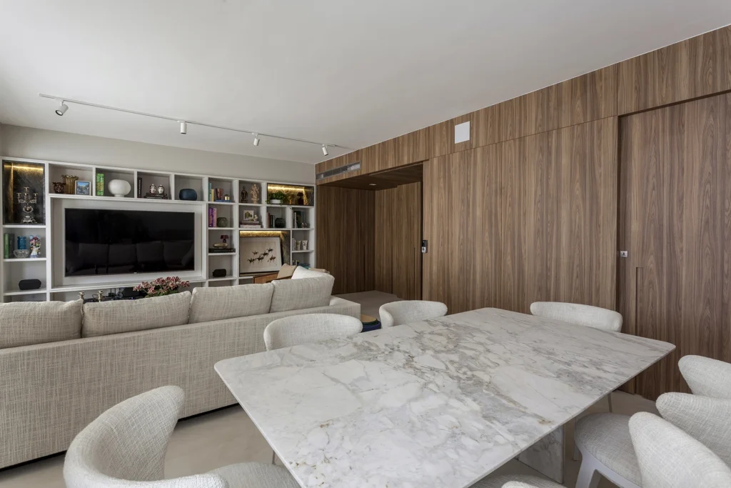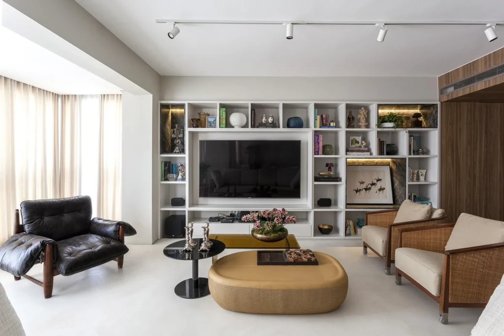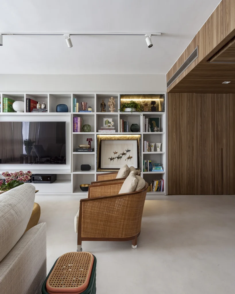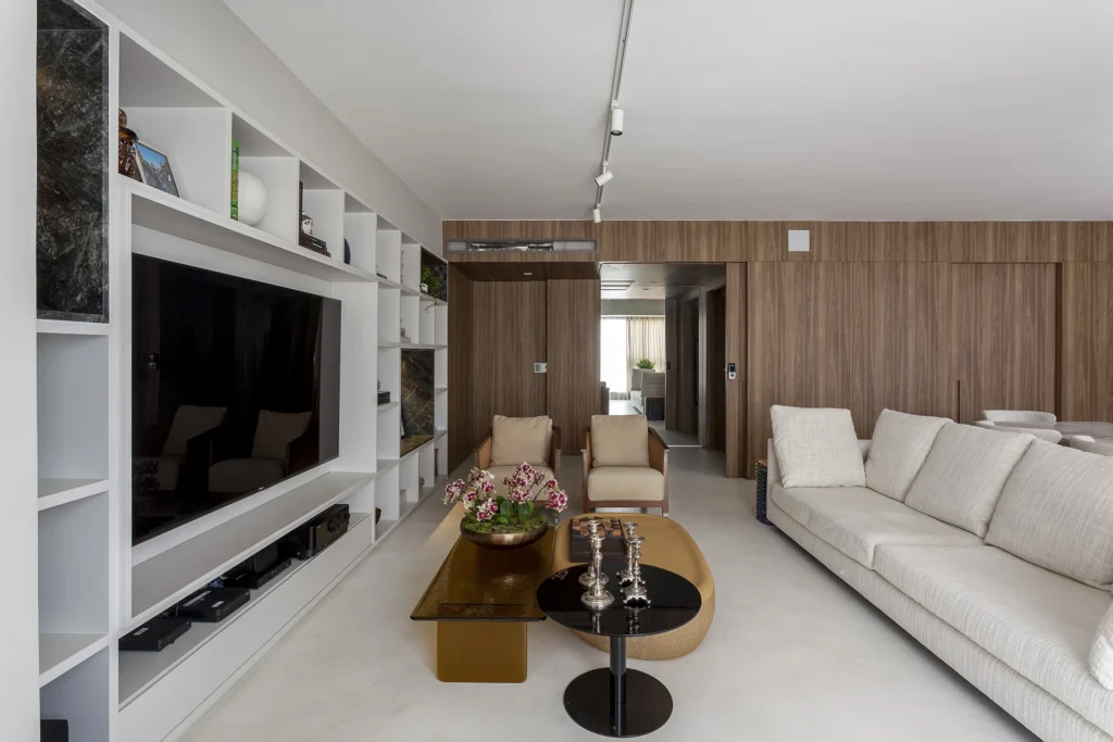 Na área social, o piso em cimento queimado confere unidade visual e contemporaneidade, dialogando com paredes claras que ampliam a sensação de espaço e luminosidade. O grande destaque do living é a estante da sala principal, desenhada com nichos em mármore, que funciona como elemento-chave do projeto e imprime identidade ao ambiente.