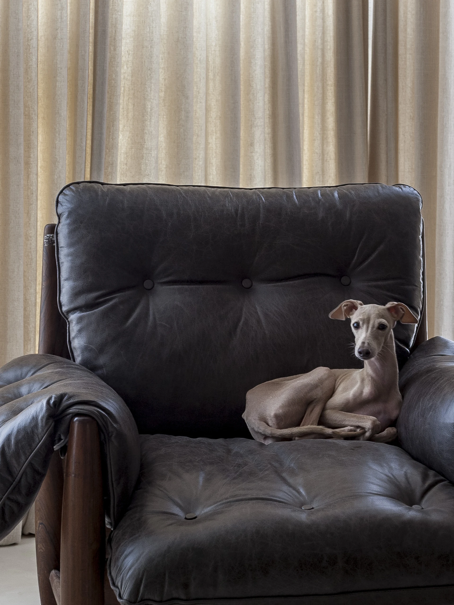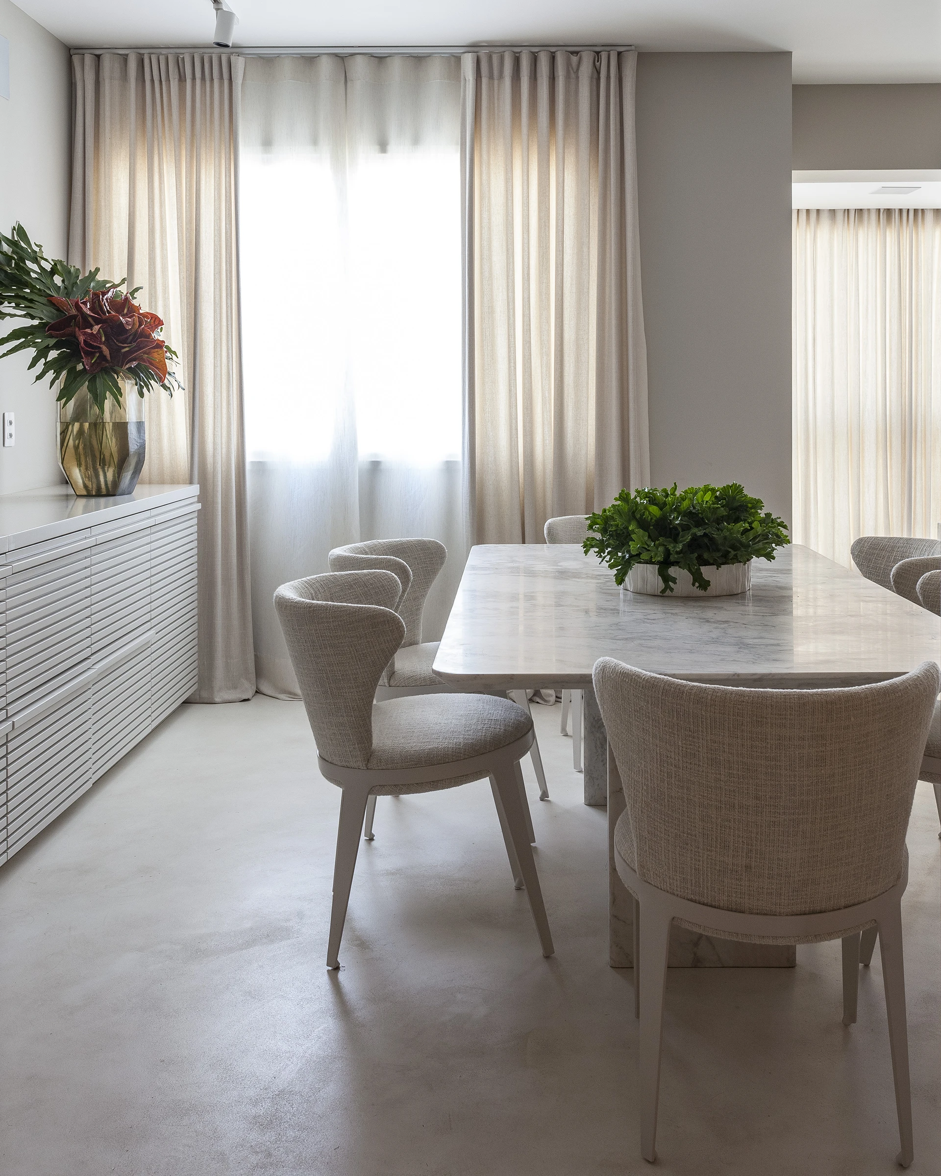 A curadoria de mobiliário combina peças contemporâneas e de design assinado, equilibrando conforto e sofisticação. O sofá é da Jocal, enquanto poltronas da Flexform, adquiridas na Casual Móveis, convivem com peças da Firma Casa, como o puff e as mesas de centro — entre elas, modelos assinados por Tom Dixon e Lucas Recchia. A mesa de jantar, da Galleria Della Pietra, e as cadeiras da Mula Preta reforçam o caráter autoral da área social. As cortinas da Uniflex completam o projeto com leveza e funcionalidade.