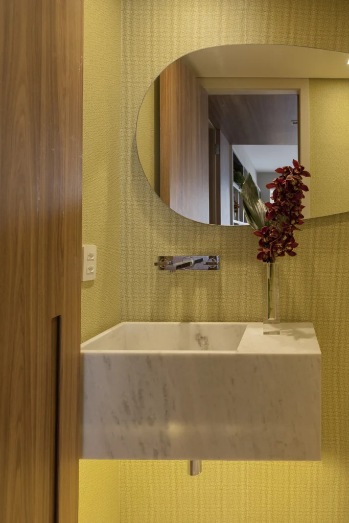 Nas áreas íntimas, o piso em madeira de reflorestamento introduz aconchego e conforto térmico, criando uma atmosfera mais acolhedora para os espaços de descanso, sem romper com a linguagem clean adotada no restante do apartamento. O lavabo se destaca pelo revestimento em palha natural, trazendo textura e um contraste sutil com o restante da proposta.