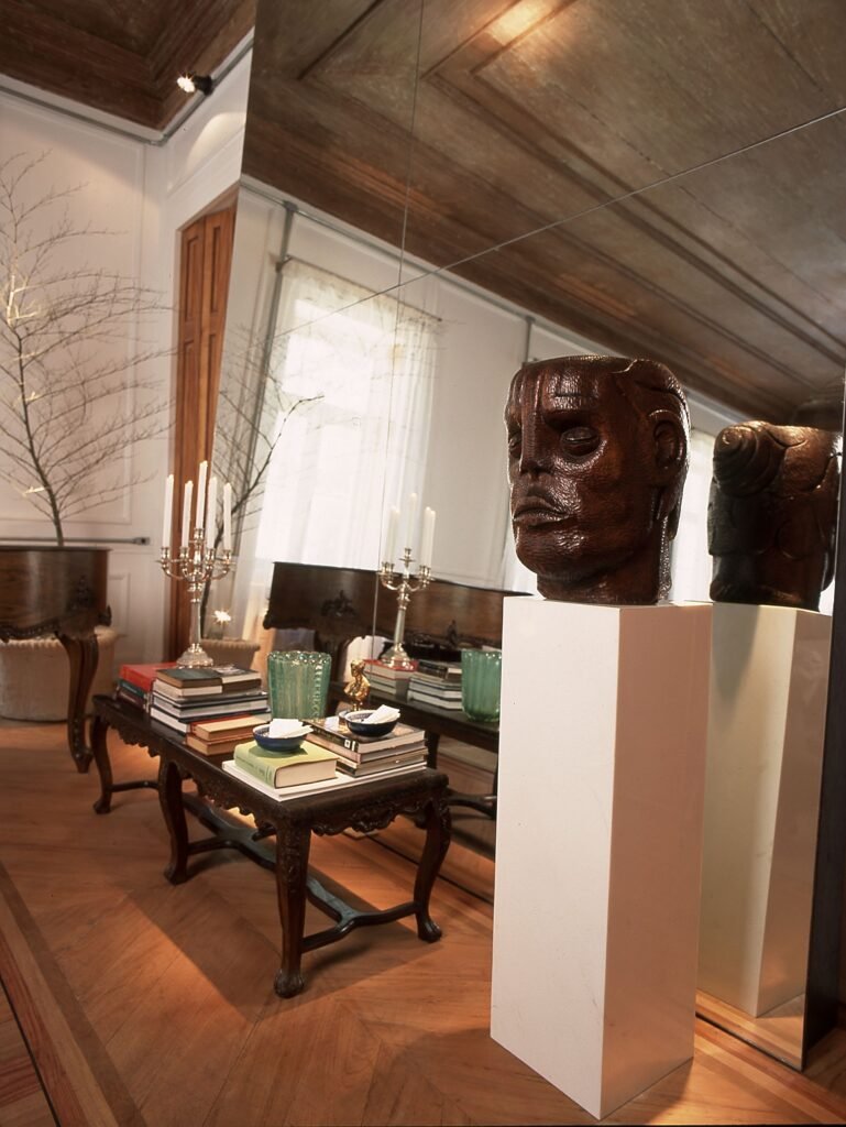 A presença de obras de arte de grande relevância reforça o caráter sofisticado do living, como a escultura de uma cabeça assinada por Mário Cravo, que se destaca como ponto focal e confere densidade cultural ao ambiente.