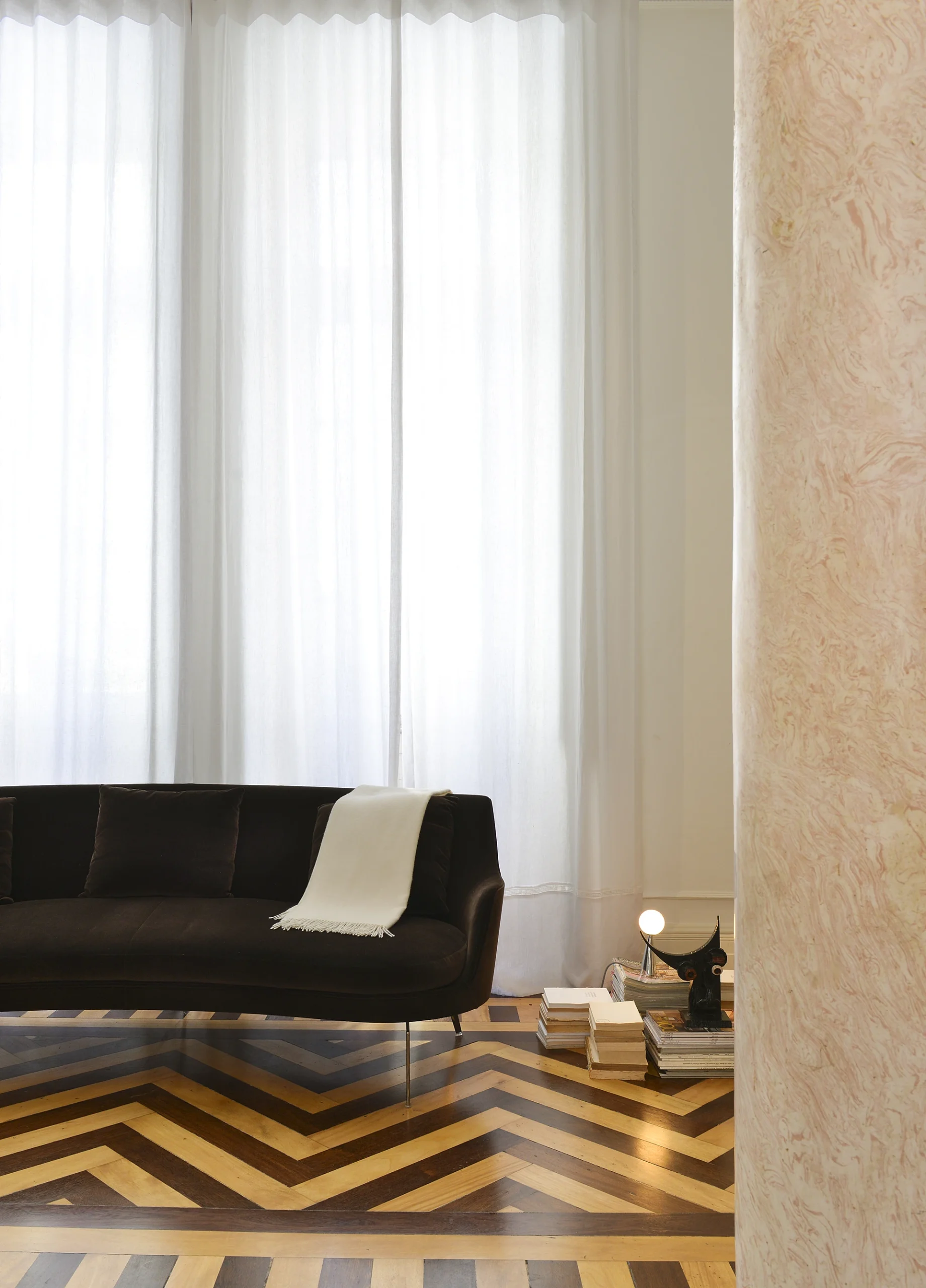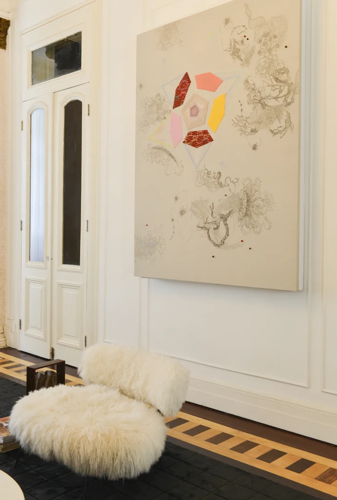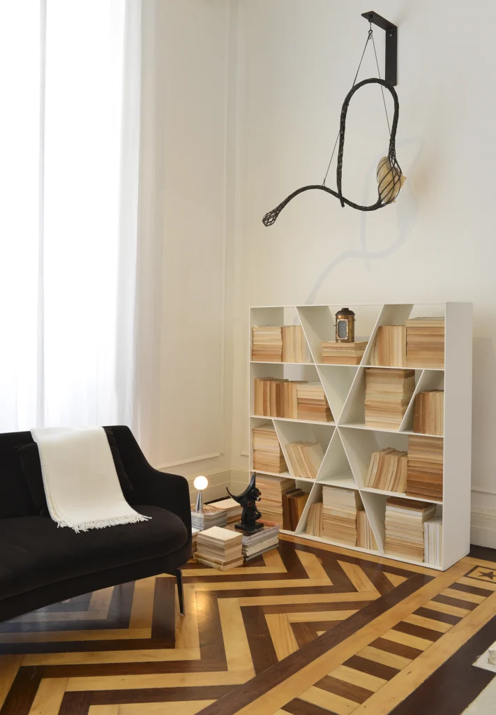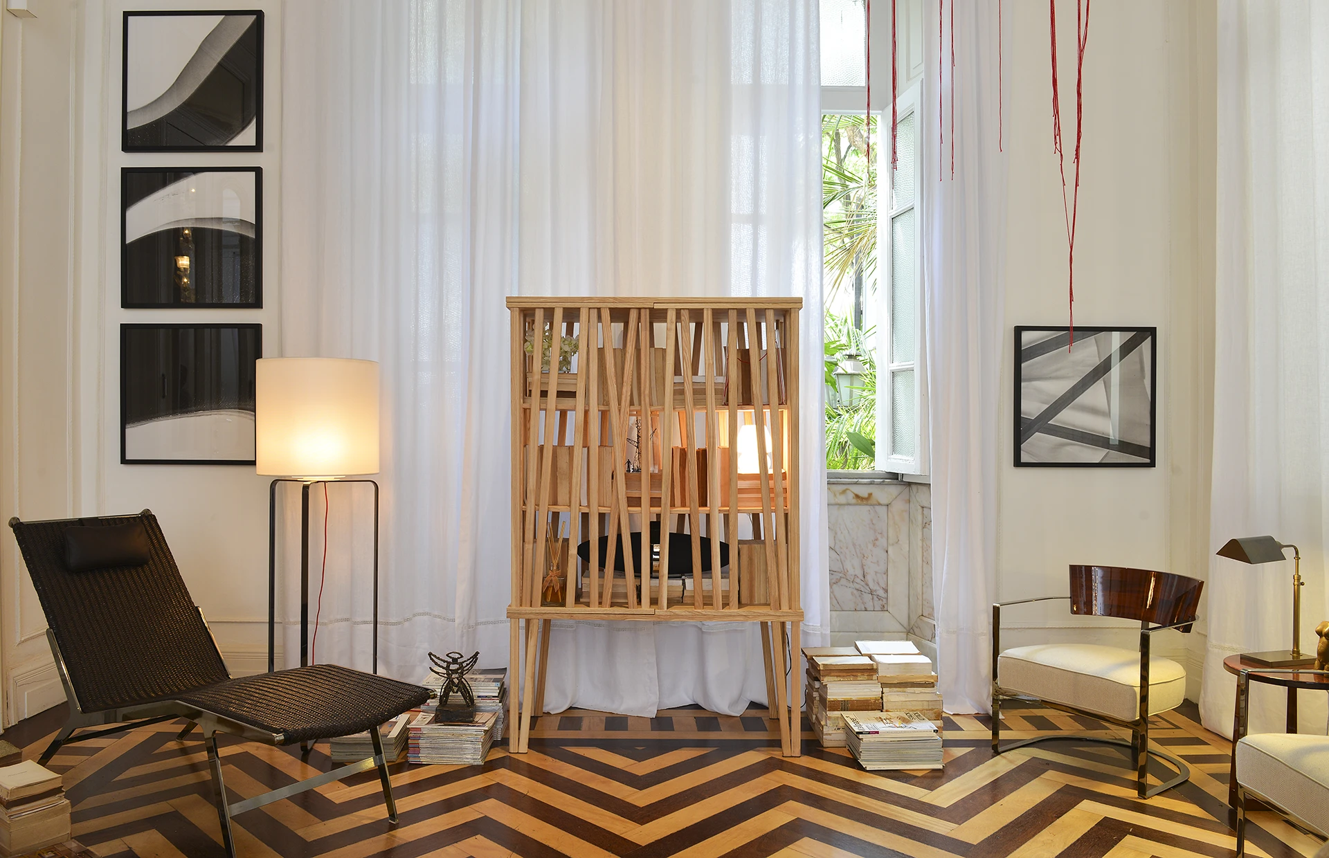 O Studio Blanche é um exercício de equilíbrio sensorial. O ponto de partida foi o uso de cores claras, criando um cenário “total white” que não apenas amplia o olhar, mas serve como tela para uma rica sobreposição de materiais. O toque natural do linho nas cortinas, a geometria marcante do piso em marchetaria e a transparência lúdica do mobiliário — como o icônico armário Mikado — criam uma profundidade visual que convida ao toque e ao acolhimento.