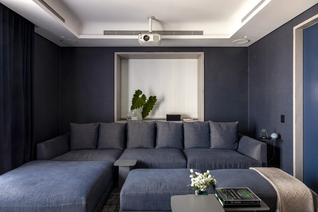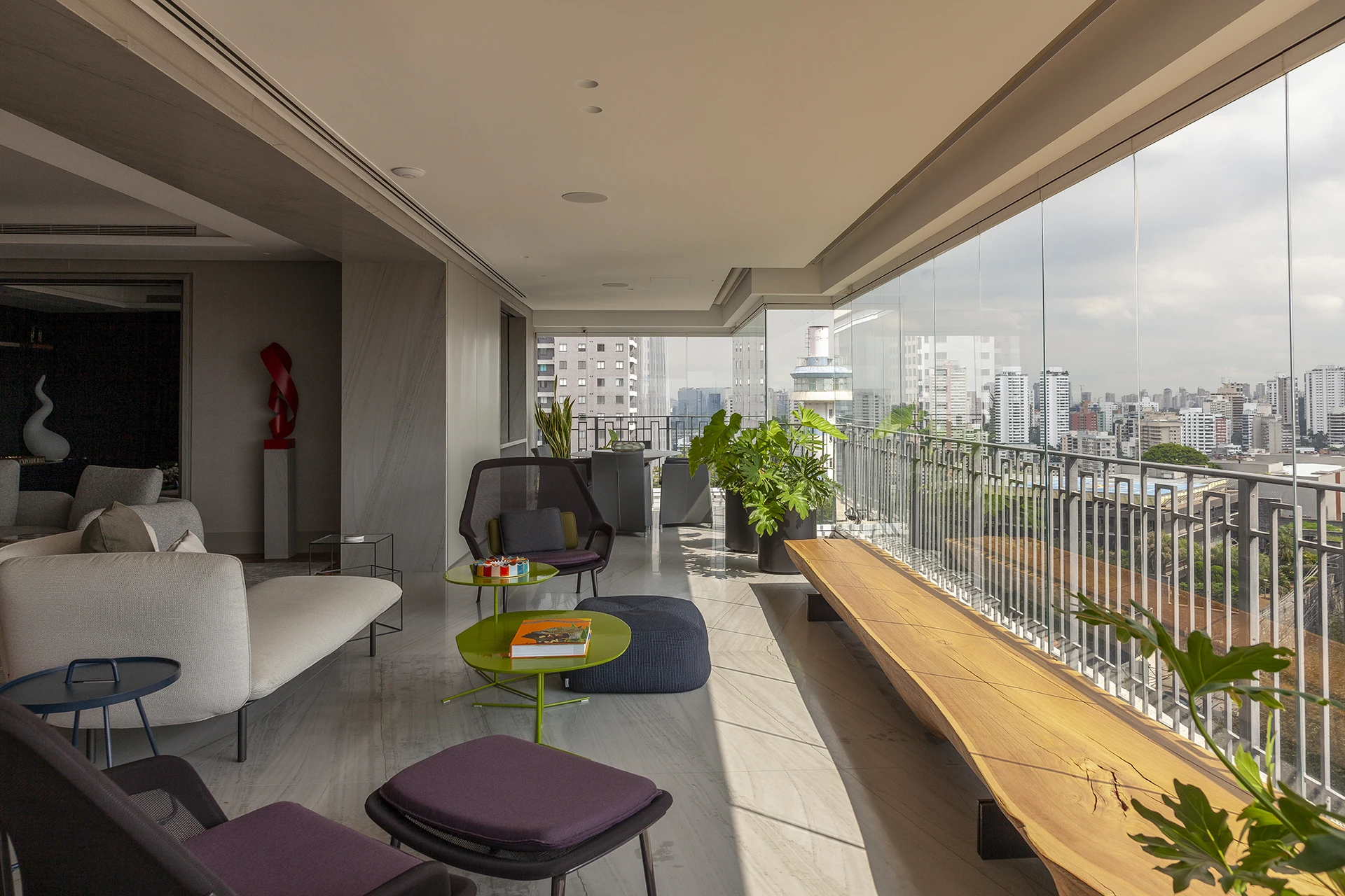 A área social foi totalmente integrada, unindo sala de estar, jantar e varanda em um único ambiente contínuo, ampliado e banhado por luz natural. Essa configuração reforça a sensação de generosidade espacial e favorece tanto o convívio cotidiano quanto os momentos de receber. Em contraste, a sala de TV foi pensada como um espaço mais intimista, com possibilidade de blackout total, garantindo conforto visual e acústico.