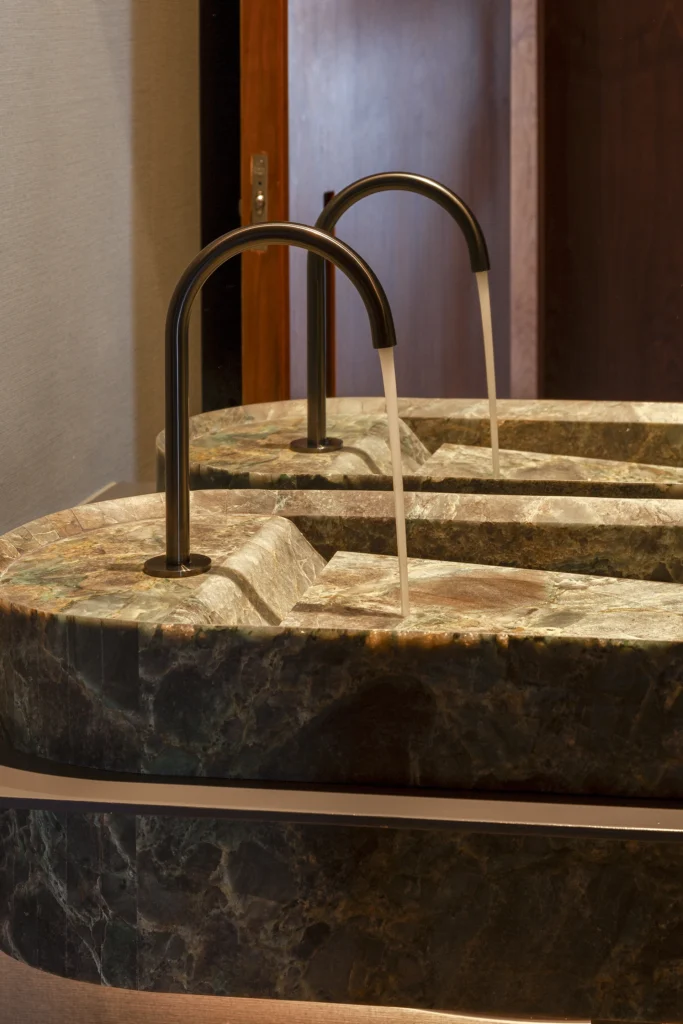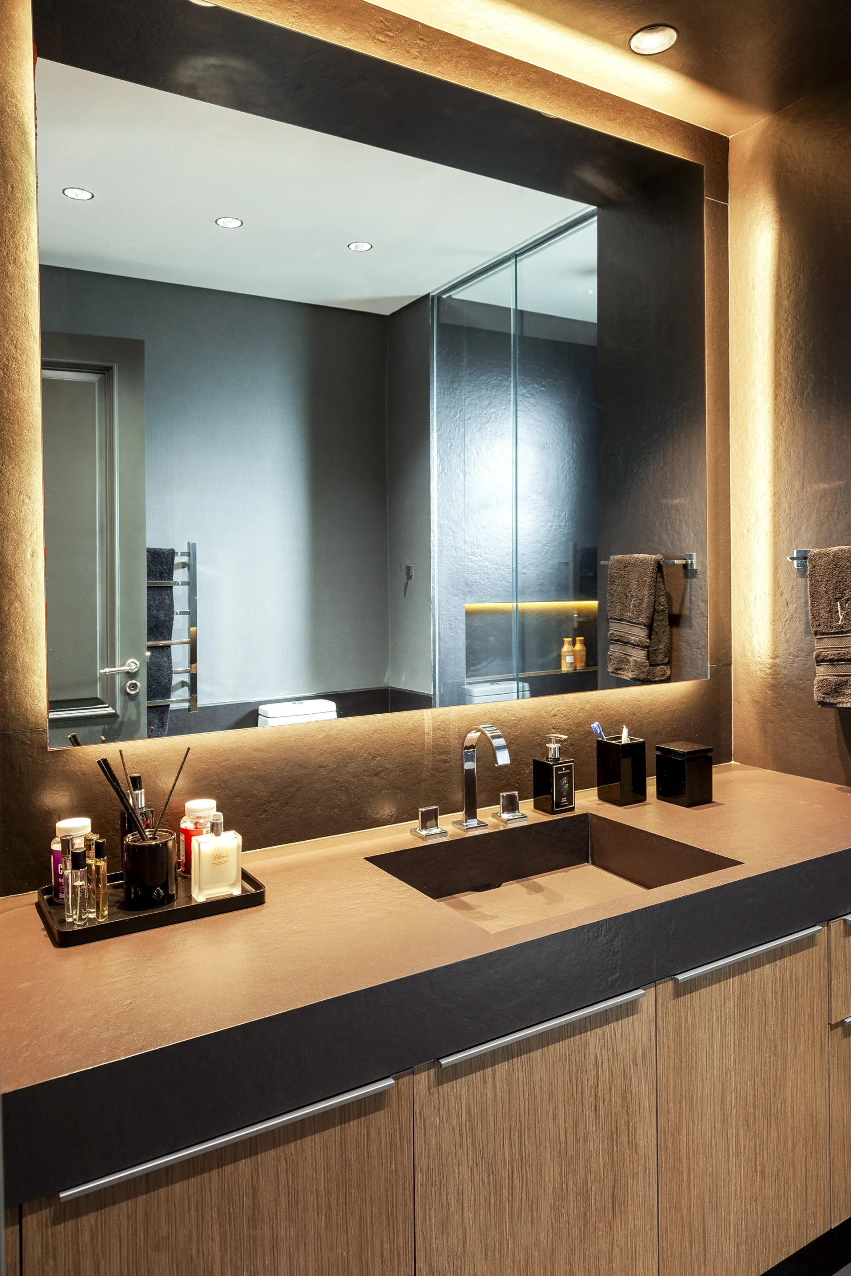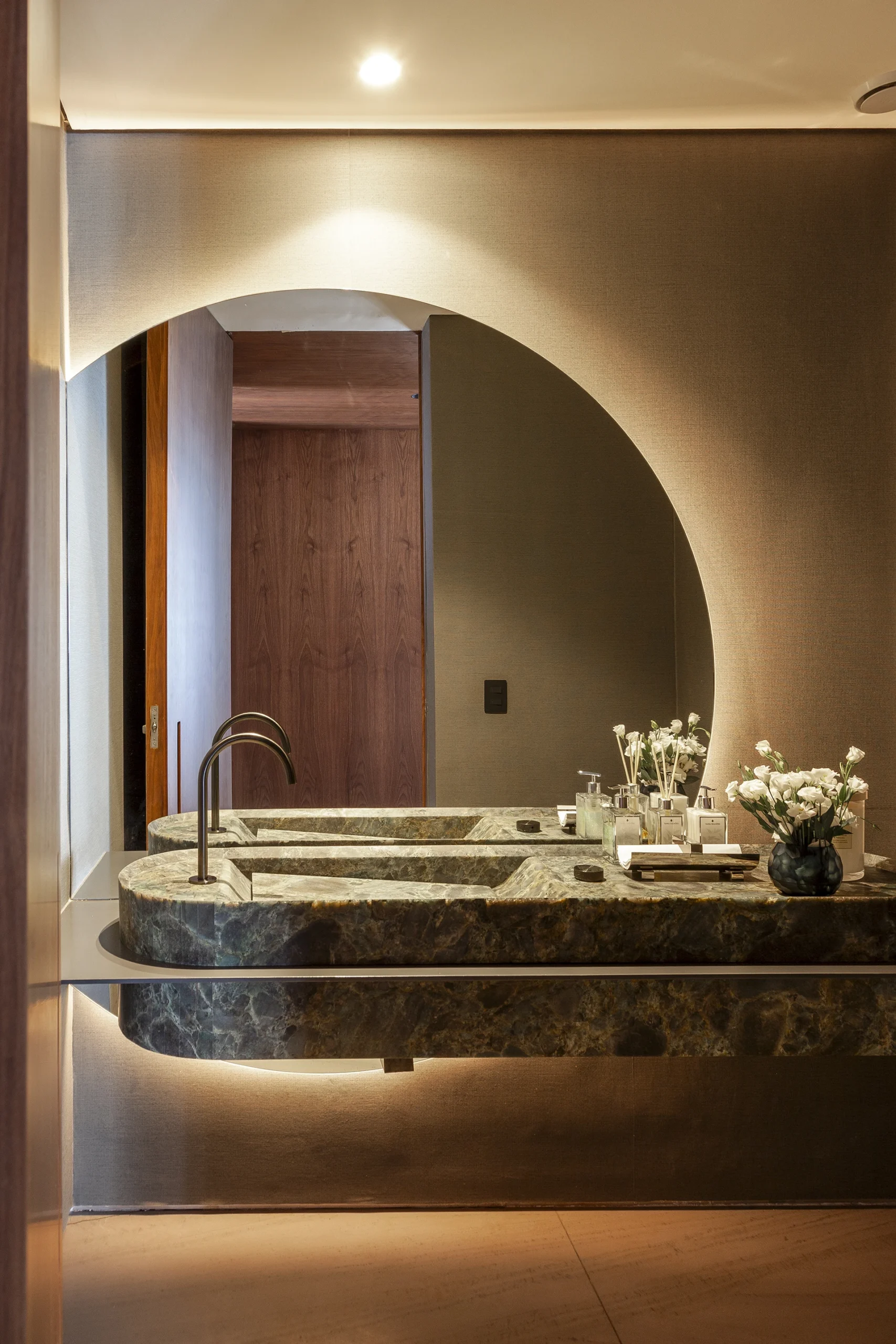 Embora as paredes adotem uma paleta de tons neutros, a personalidade do projeto se revela na curadoria do mobiliário e dos objetos, cuidadosamente escolhidos para criar identidade e caráter aos ambientes. No lavabo, essa atenção aos detalhes se materializa na pia, totalmente esculpida e desenhada exclusivamente para o projeto — um trabalho artesanal que reforça o cuidado com cada elemento.
