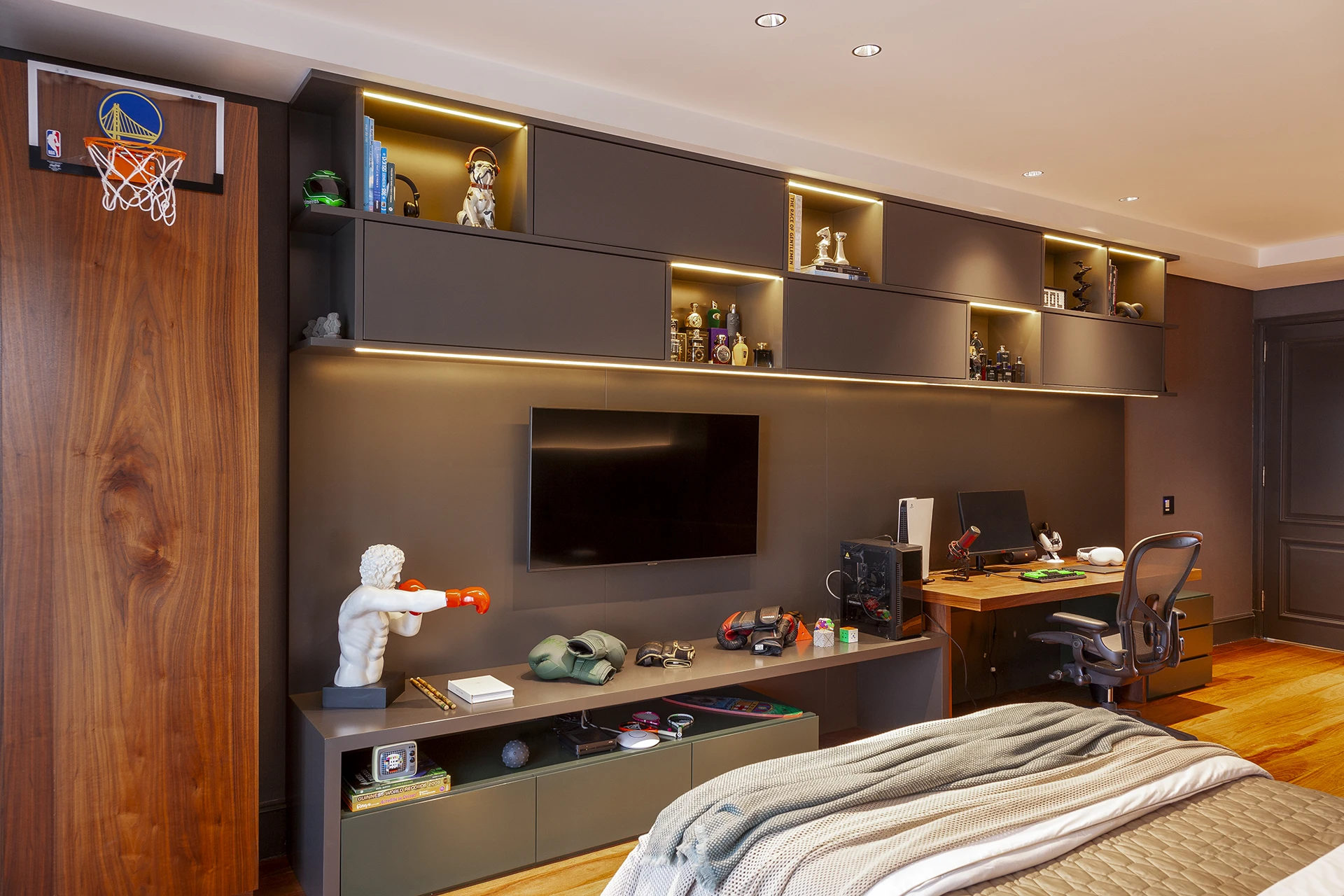 Na área íntima, o quarto da filha se destaca pelo envolvimento direto da moradora no processo criativo. Ela própria desenhou o que desejava para o espaço e participou ativamente da escolha dos objetos e luminárias, resultando em um ambiente autêntico, afetivo e cheio de significado.