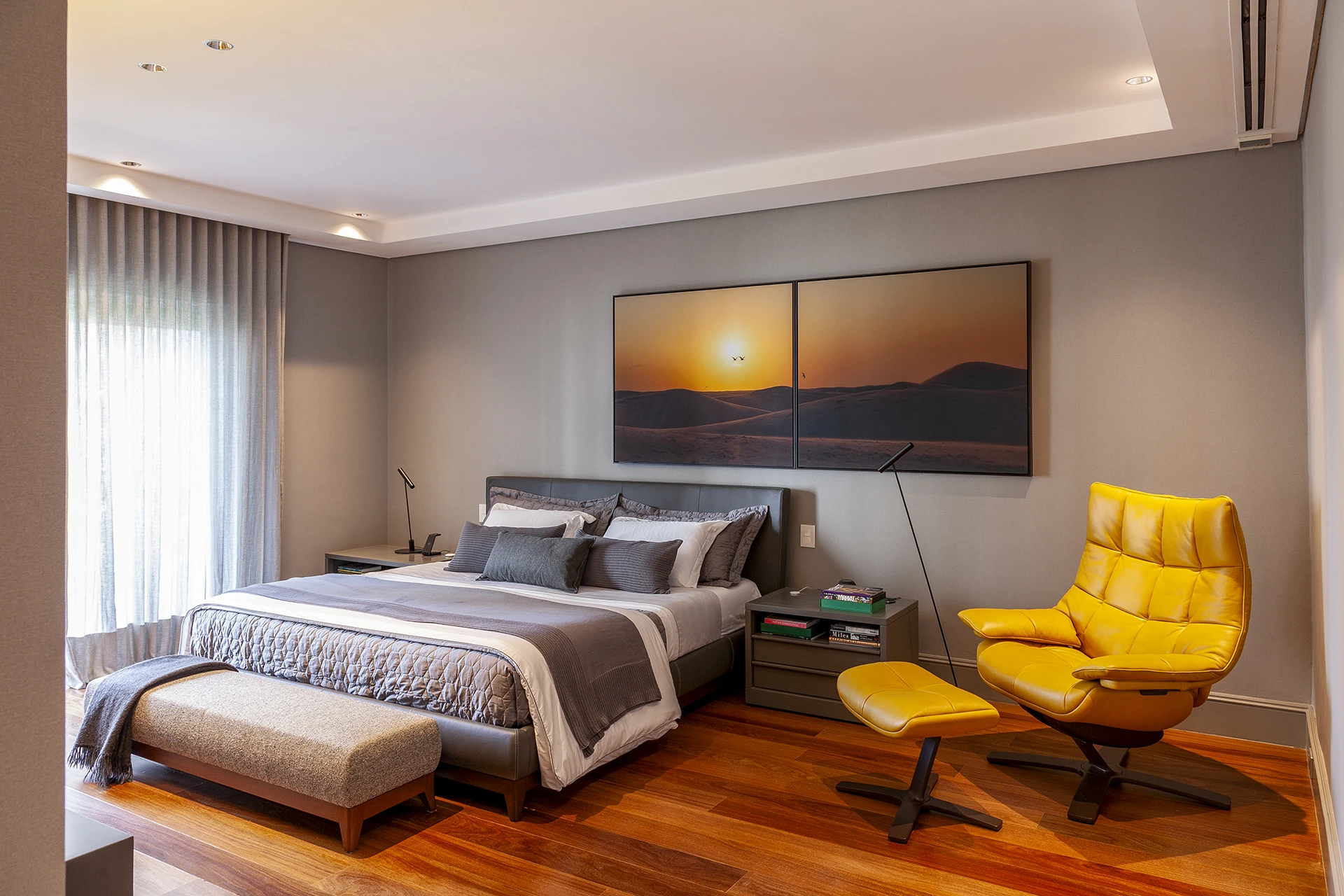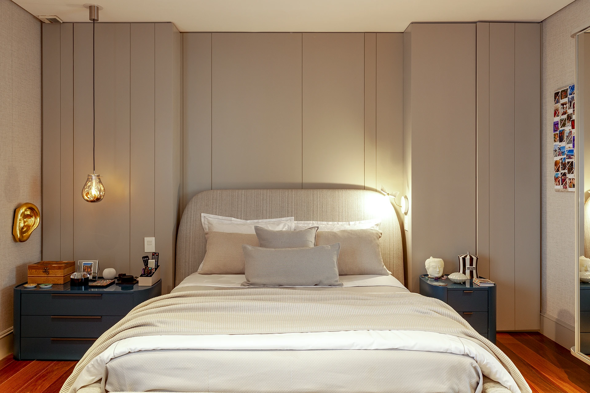 Para a suíte do casal, dois dormitórios foram integrados, permitindo a criação de um closet generoso e um banho master mais amplo, alinhados ao desejo de conforto e funcionalidade. O resultado é um projeto contemporâneo, pensado sob medida para seus moradores, onde arquitetura e interiores se articulam com coerência, sensibilidade e identidade.