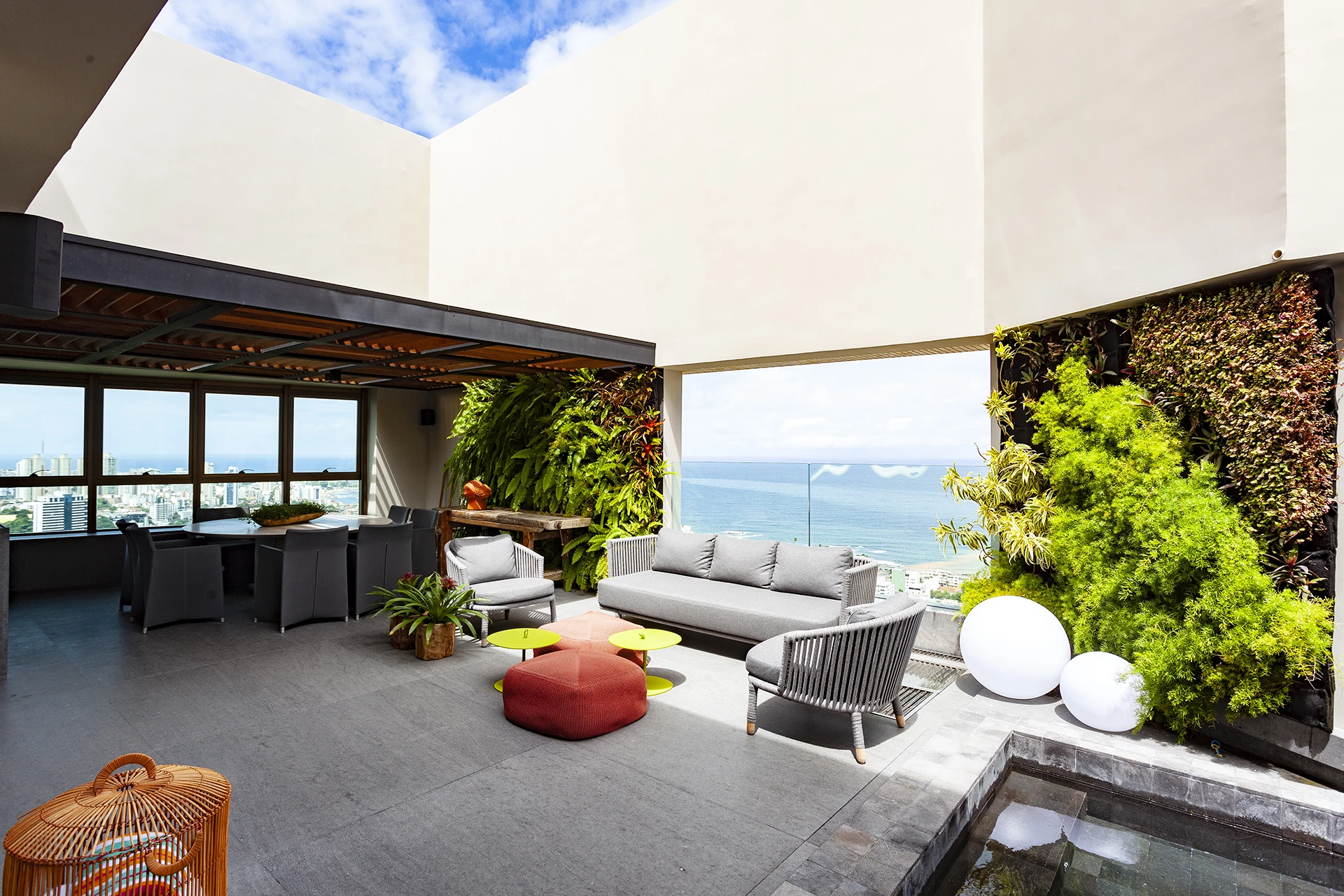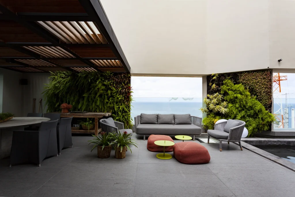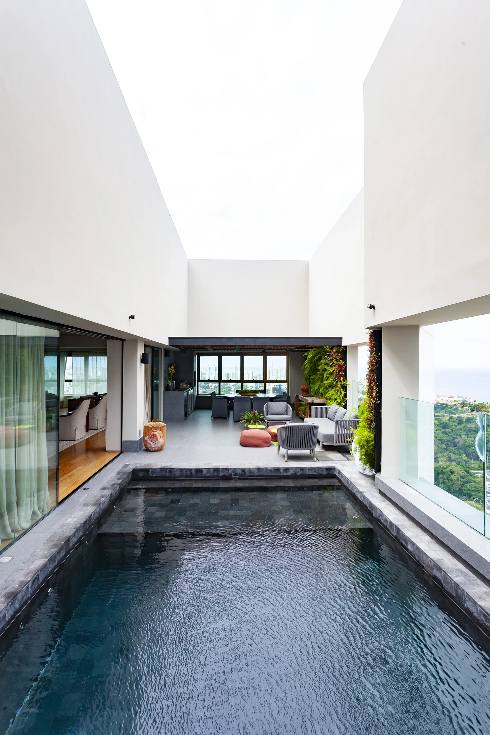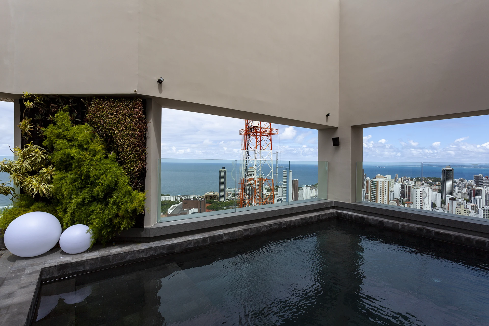 oi pelas mãos de David Bastos que dois apartamentos de cobertura, no bairro de São Lázaro, uniram-se para dar origem a uma ampla penthouse, concebida como base perfeita para desfrutar do clima quente de Salvador e das extensas vistas para o céu e o mar. Pensado para uma família que valoriza a vida ao ar livre, o projeto prioriza a integração com o exterior, coroada pela criação de uma piscina no terraço descoberto. Implantada de forma sutil, a piscina não se projeta sobre a paisagem: o piso ao redor foi parcialmente elevado, garantindo continuidade visual e leveza ao conjunto.