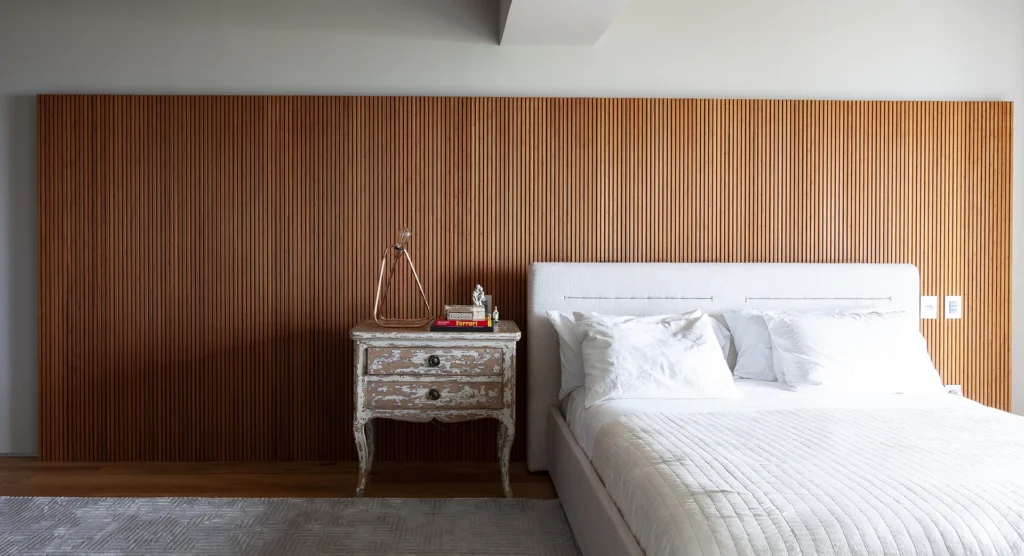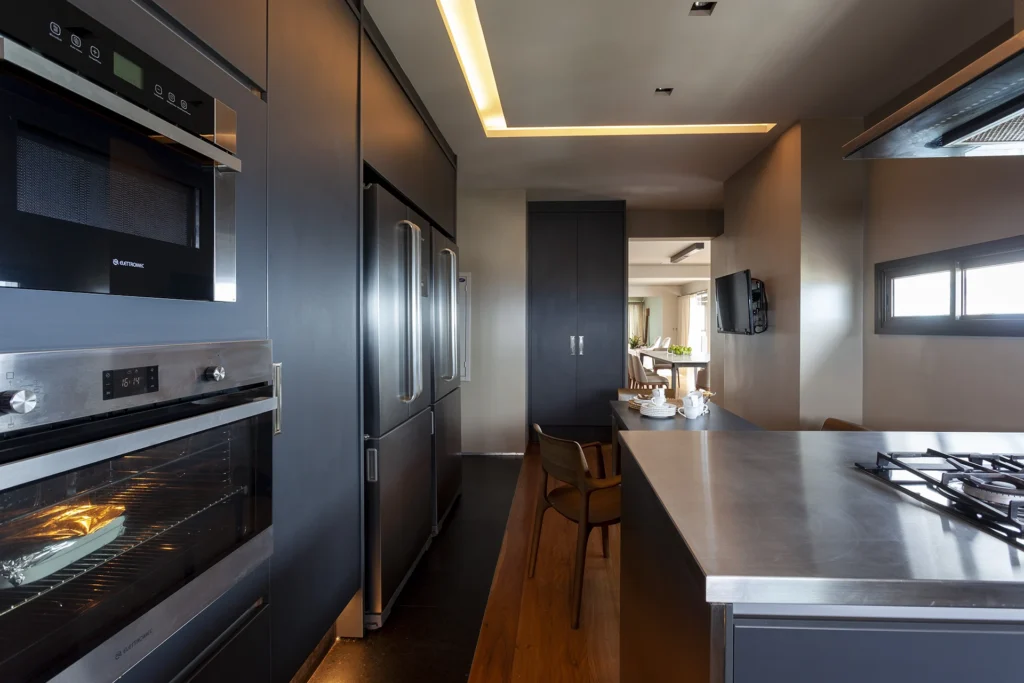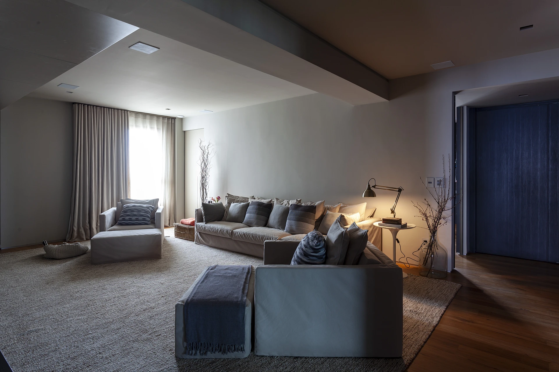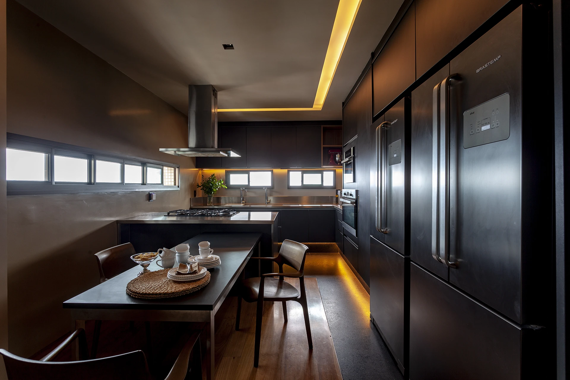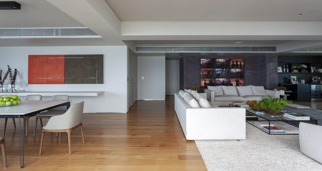 Ao lado, o novo espaço gourmet organiza-se sob um pergolado de abertura regulável, permitindo controlar a incidência solar e adaptar o ambiente às diferentes horas do dia. A ideia de unidade e uniformidade se estende aos interiores, redesenhados em um único nível. O pé-direito baixo levou à supressão do forro, revelando ora as vigas aparentes, ora trechos rebaixados para a passagem do ar-condicionado. De forma precisa, o layout dos ambientes acompanha esse grid estrutural, reforçando a coerência do projeto.