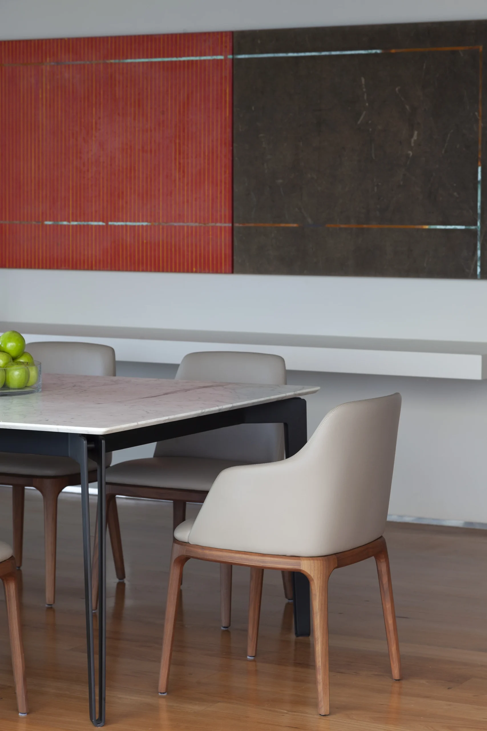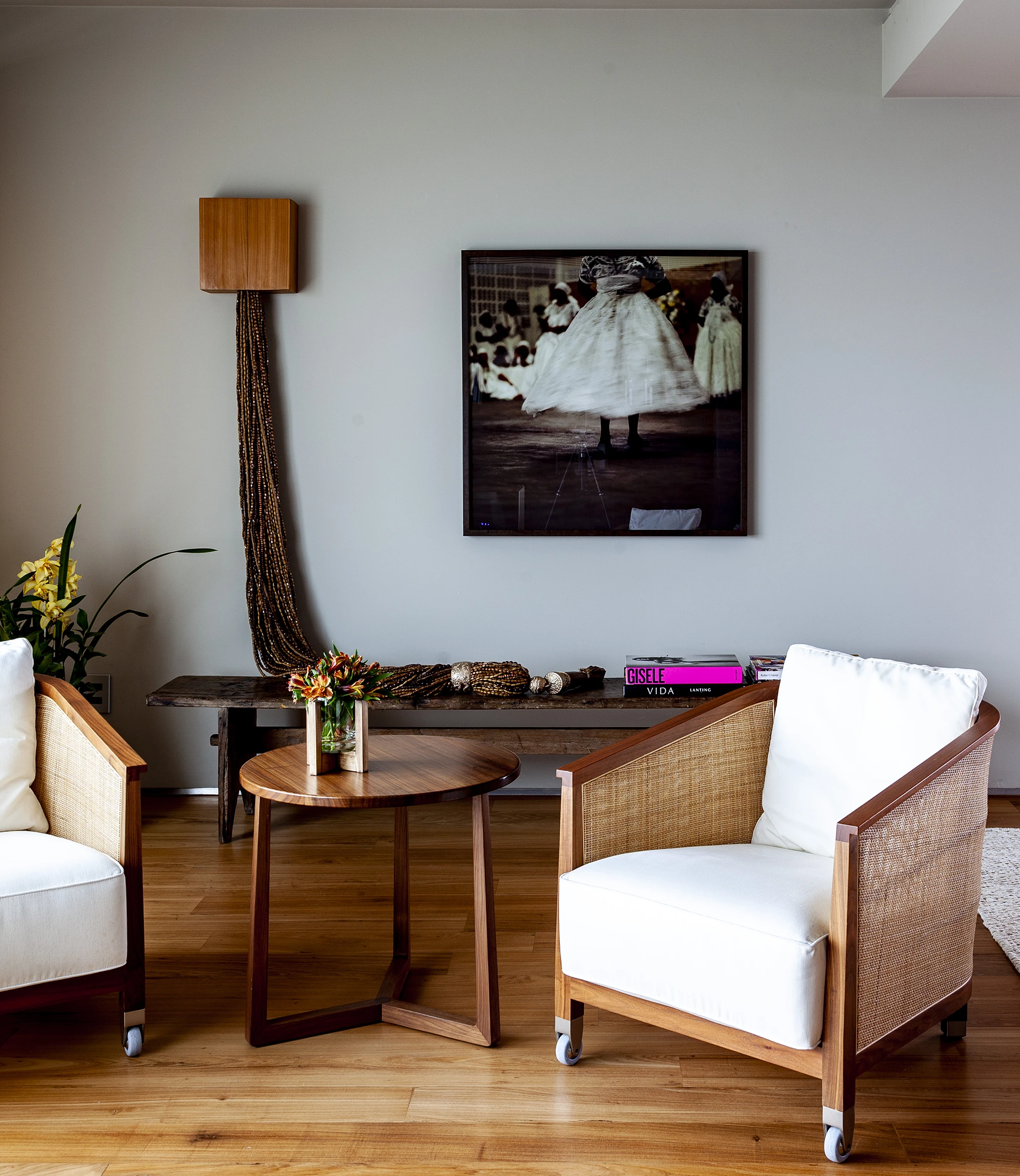 O piso carrega um valor afetivo singular: a peroba de demolição que reveste grande parte dos espaços foi reaproveitada dos antigos estábulos da fazenda da família. O mobiliário italiano finaliza o conjunto com sofisticação, destacando-se as cadeiras de madeira curva e fibra natural, que equilibram elegância e descontração, em sintonia com o espírito do lugar.