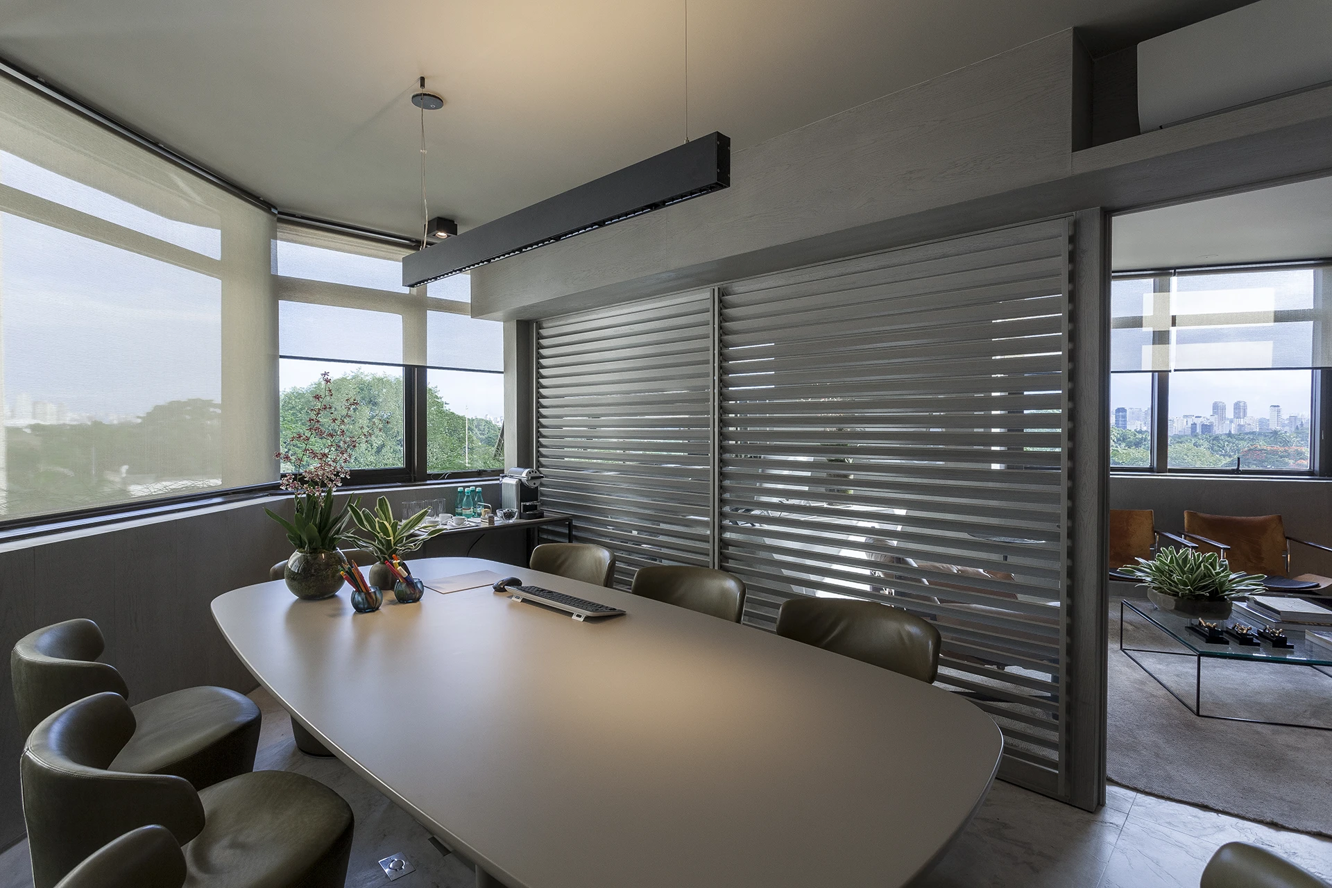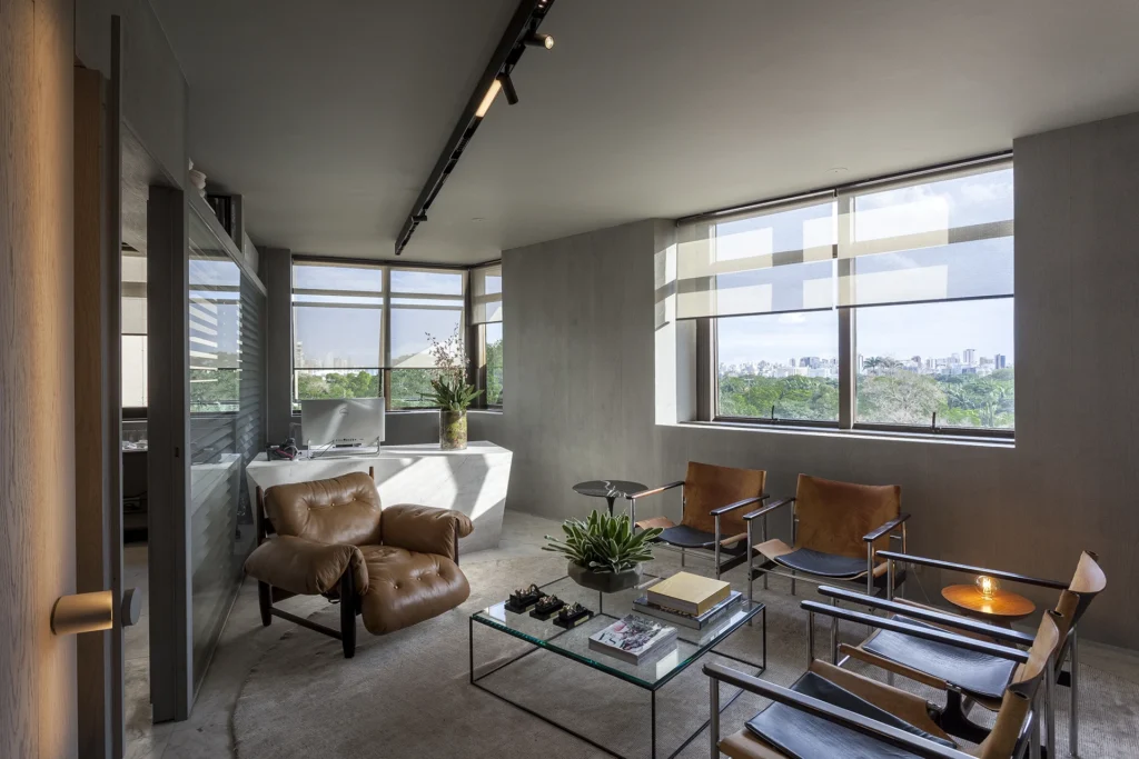 Na sala de reuniões, o mobiliário assinado pela B&B Italia — mesa e cadeiras comercializadas pela Casual Móveis — estabelece um ambiente sofisticado e funcional, complementado pelo carrinho de apoio desenhado e produzido pela Demuner, reforçando o caráter autoral e customizado do projeto.