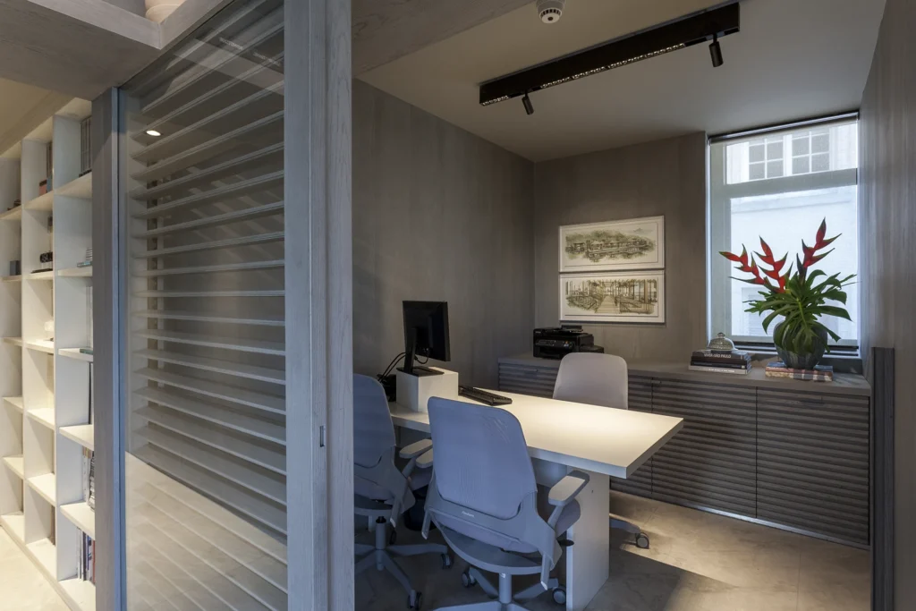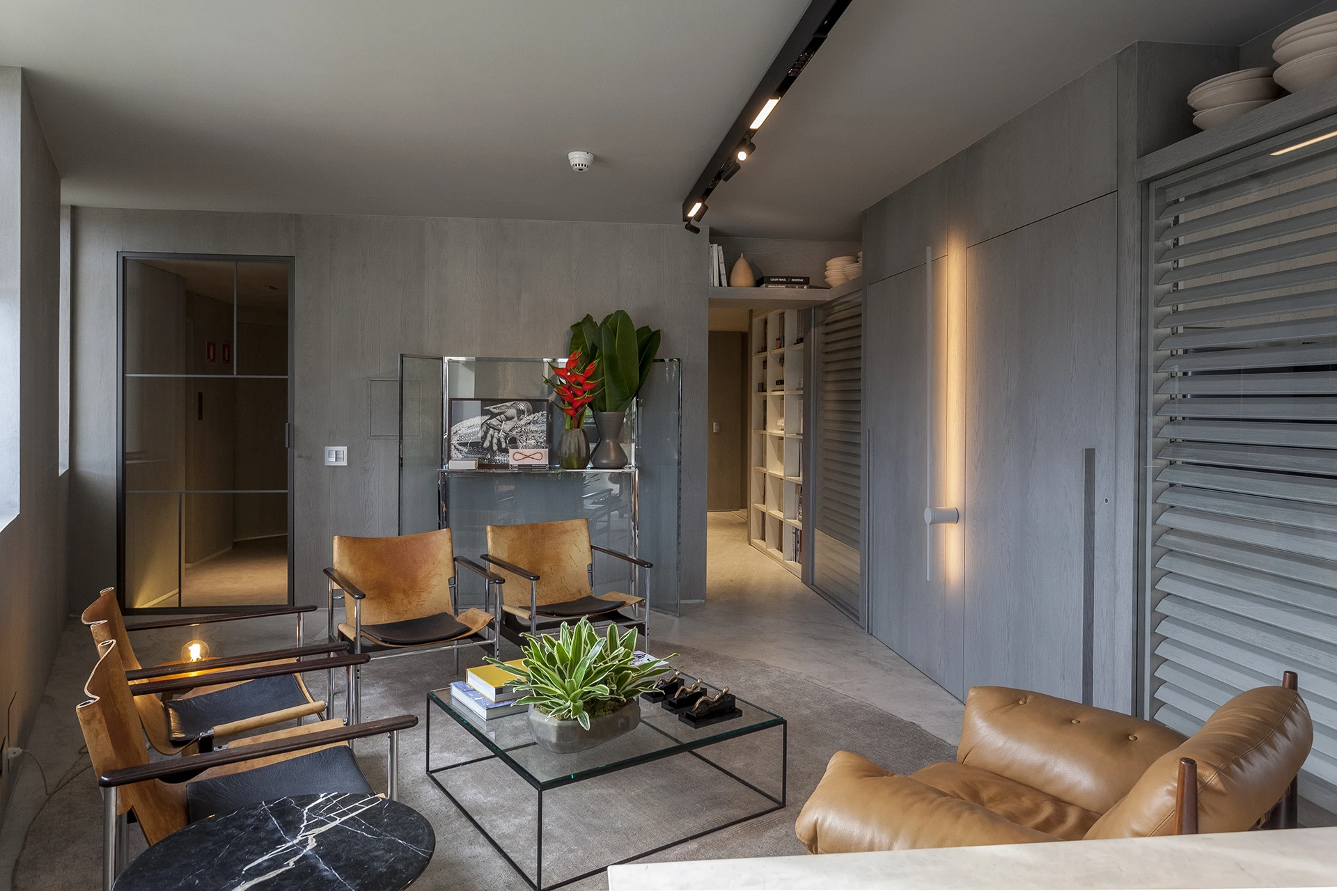 As áreas de recepção e reunião são integralmente revestidas com folha natural de madeira no tom de cinza, executada pela Demuner Marcenaria, material que se estende às portas e aos paletões, também da Demuner. Esses elementos abraçam as superfícies envidraçadas, garantindo privacidade sem comprometer a transparência e a entrada de luz natural — um equilíbrio recorrente na linguagem do escritório.