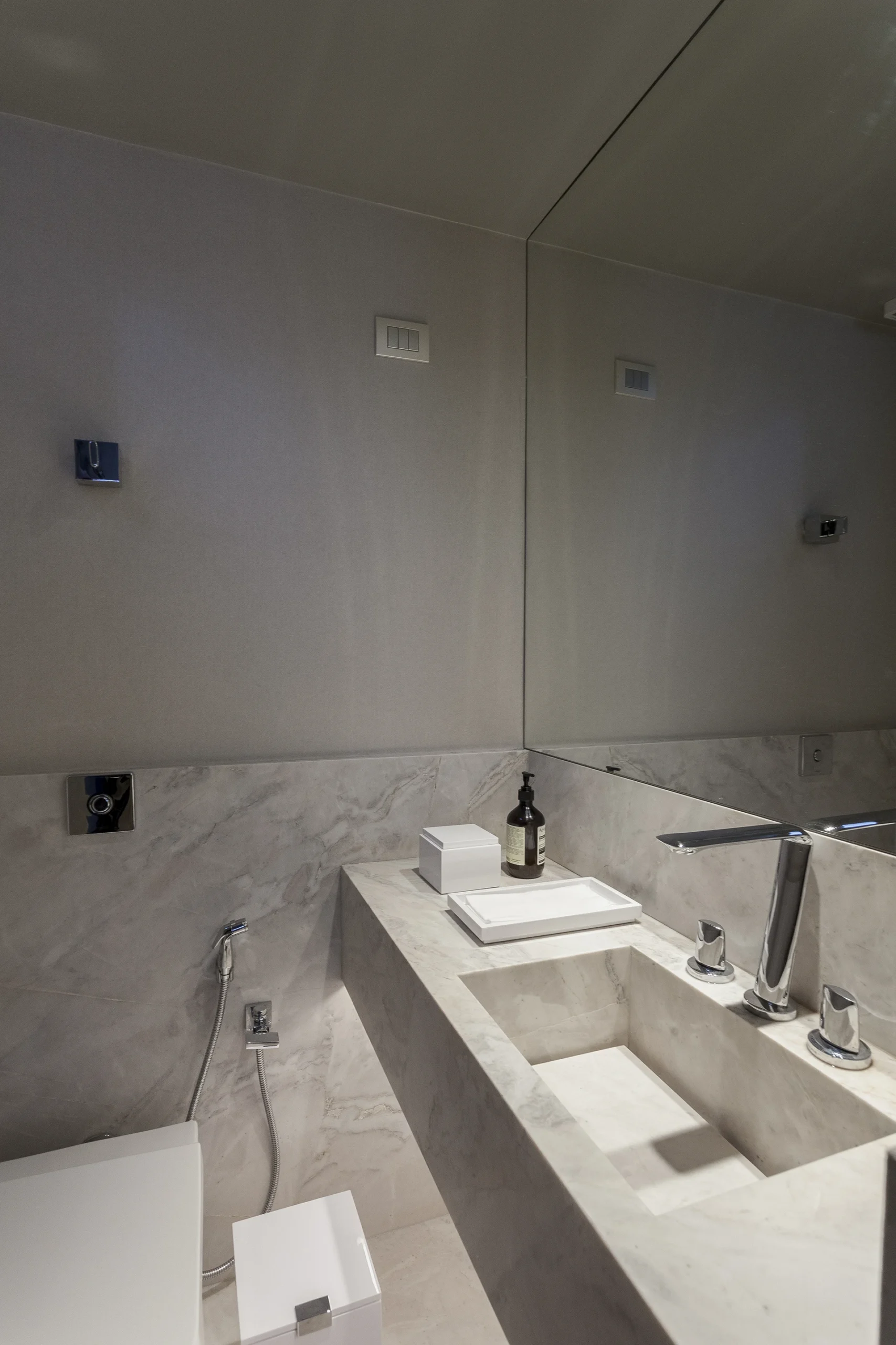 O piso em mármore Branco Paraná, fornecido pela Galleria de La Pietra, percorre todos os ambientes, conferindo unidade, luminosidade e um caráter atemporal ao conjunto. As louças e metais da Deca, adquiridos na Unikitchen, reforçam o cuidado com os detalhes e a especificação de alto padrão.