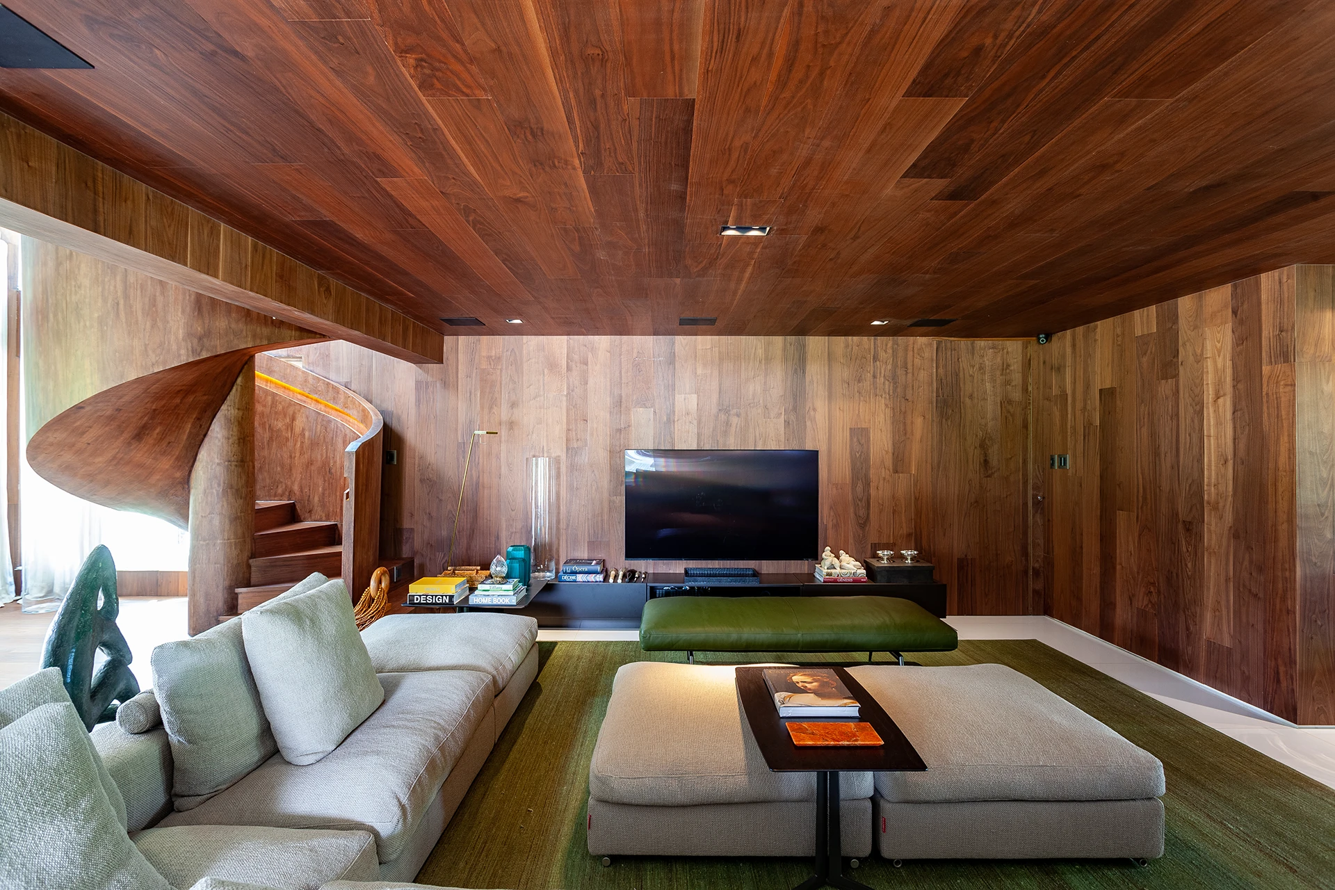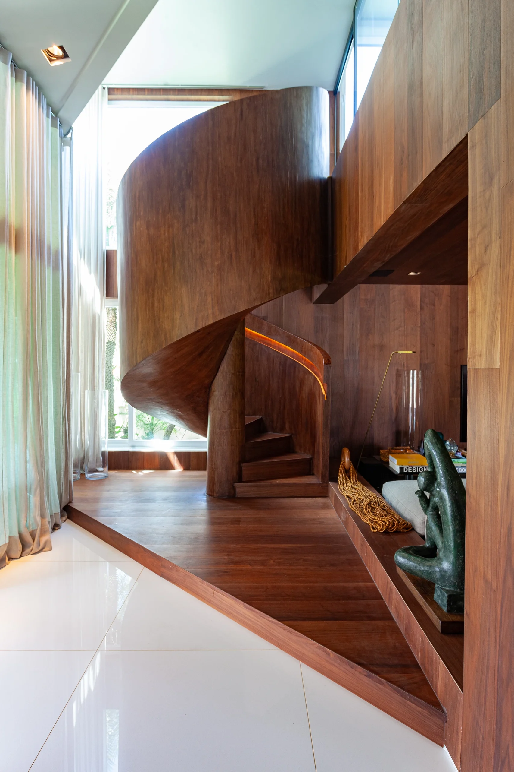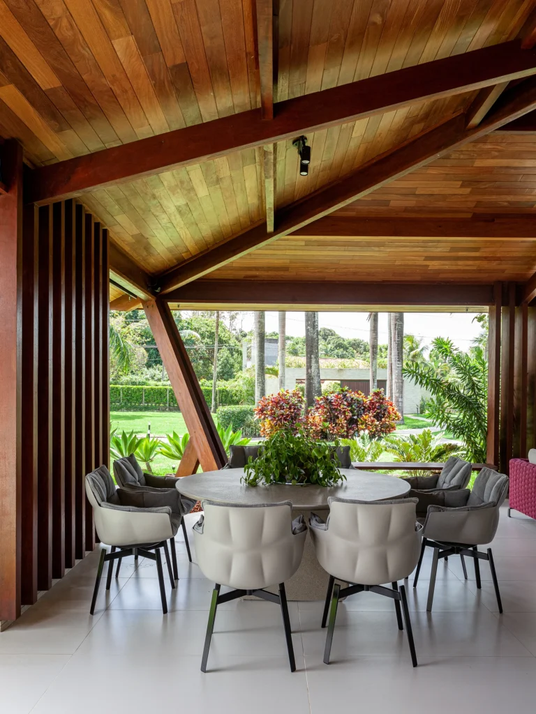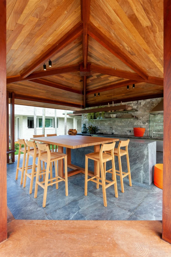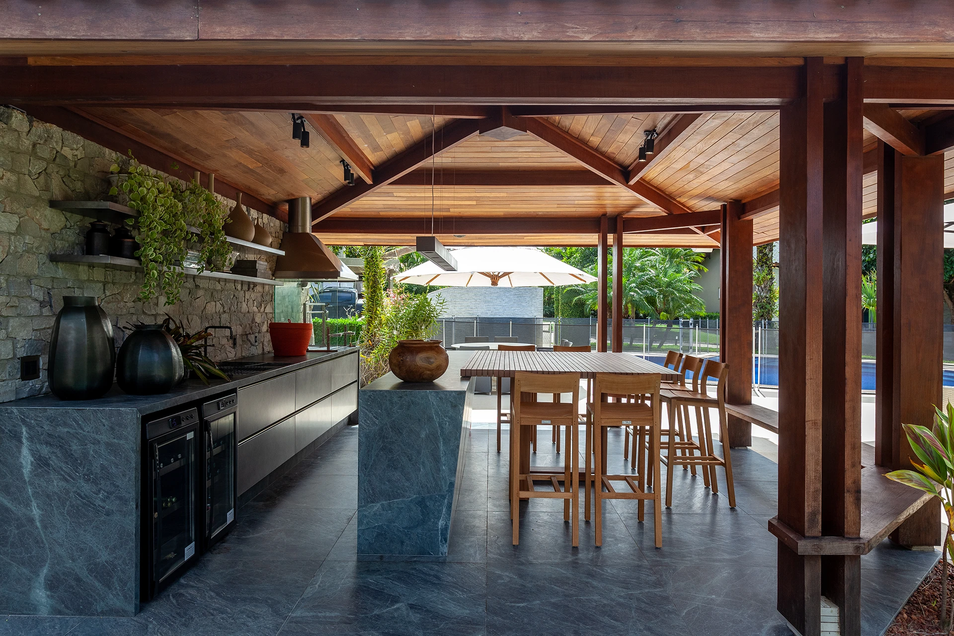 A inspiração para o projeto veio da necessidade de transformar a estética da casa, que antes era “branca e fria”, em um espaço que convidasse ao aconchego. Materiais nobres, como madeira natural e pedras brutas, foram utilizados para criar um diálogo harmonioso com a natureza ao redor.