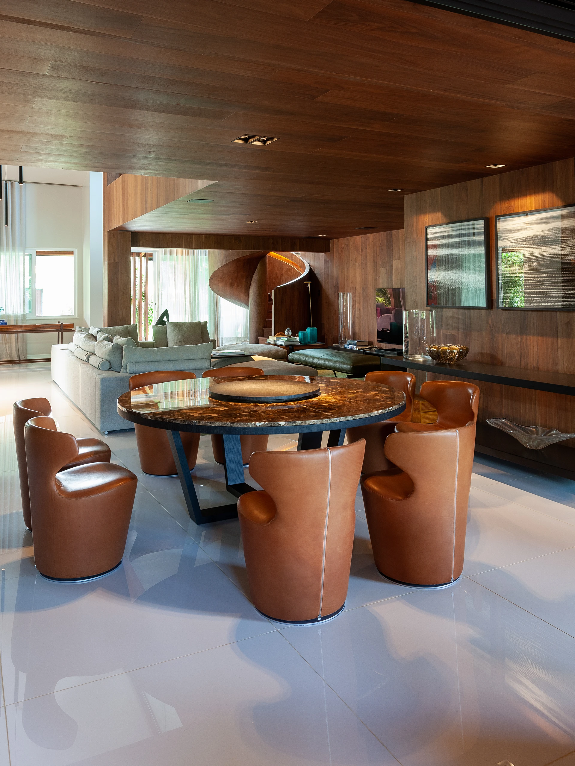 O desafio foi alinhar a nova linguagem da casa com a estrutura existente, resultando em um lar que é ao mesmo tempo sofisticado e funcional.