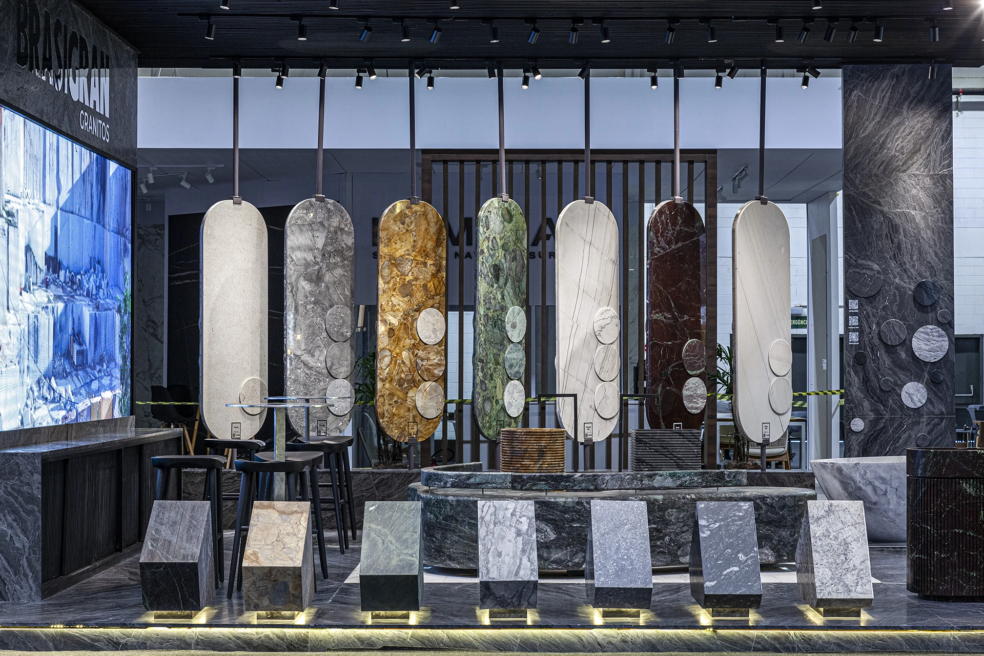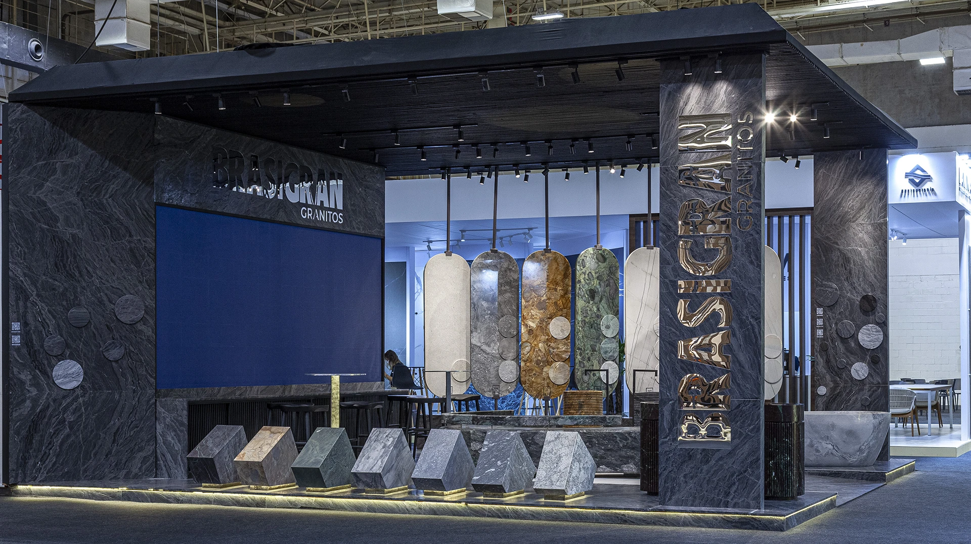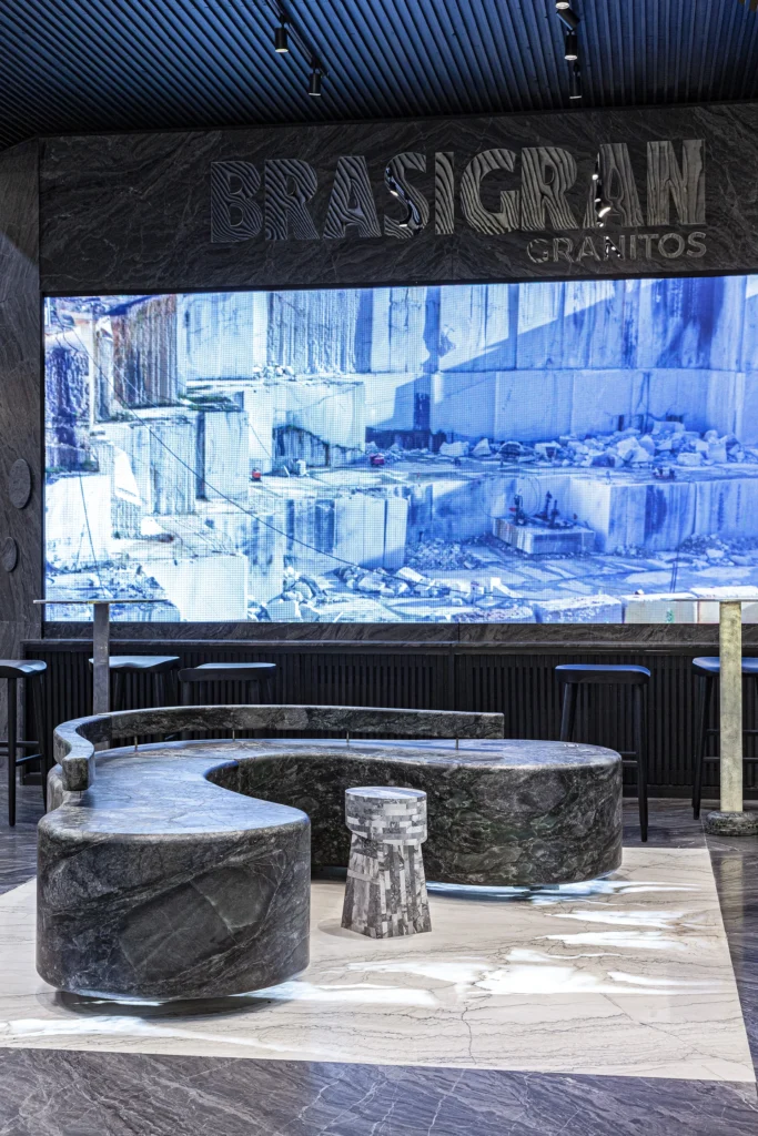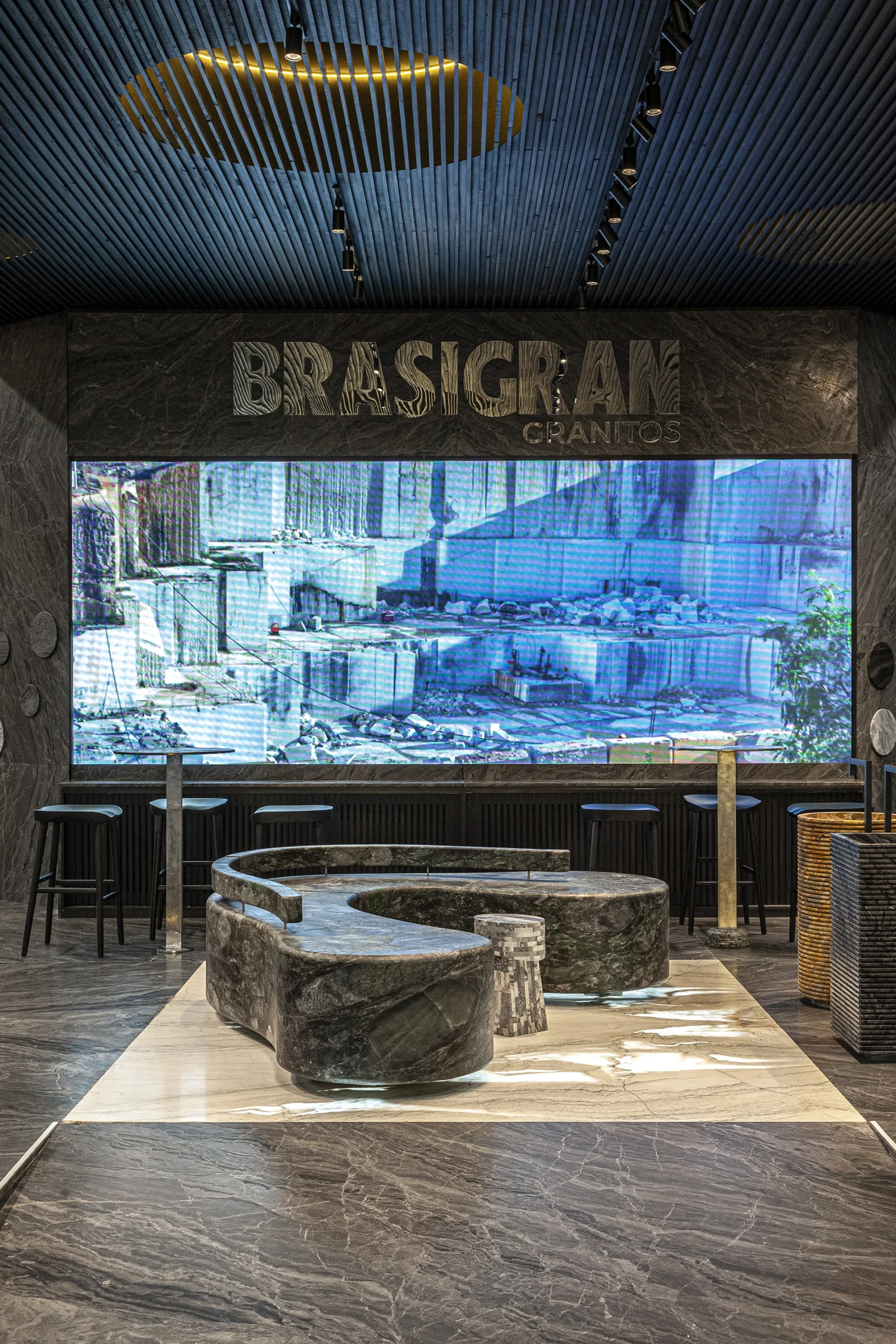 No estande da Brasigran na Expo Revestir 2022, o arquiteto David Bastos apresentou uma leitura contemporânea da rocha natural, explorando o material como forma, volume e expressão de design. Em um espaço de 56 m², blocos de mármore e quartzito foram reinterpretados por meio de tecnologia de escultura 3D, resultando em peças únicas — como a banheira oval e o banco maciço — moldadas sem emendas e com alto rigor técnico.