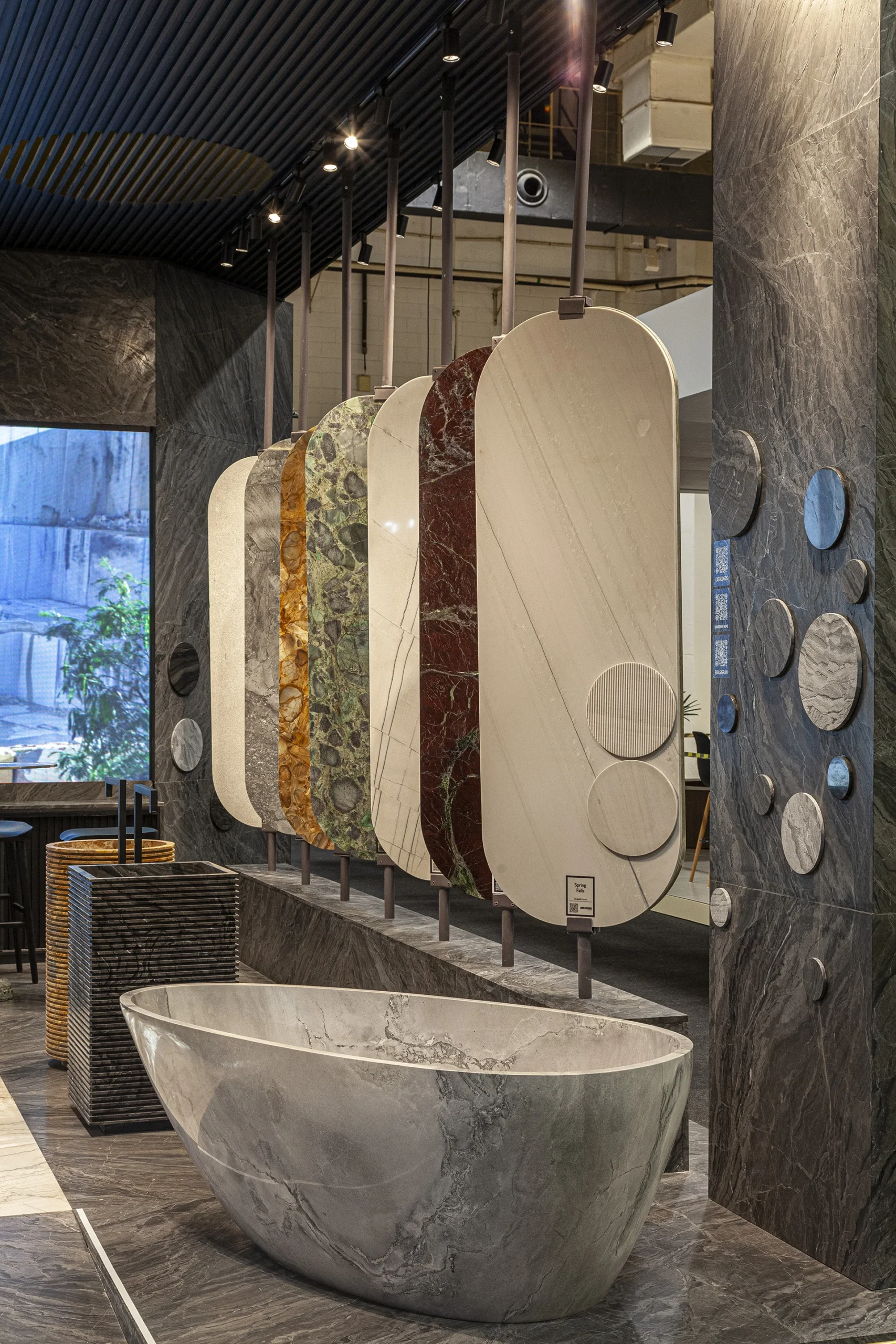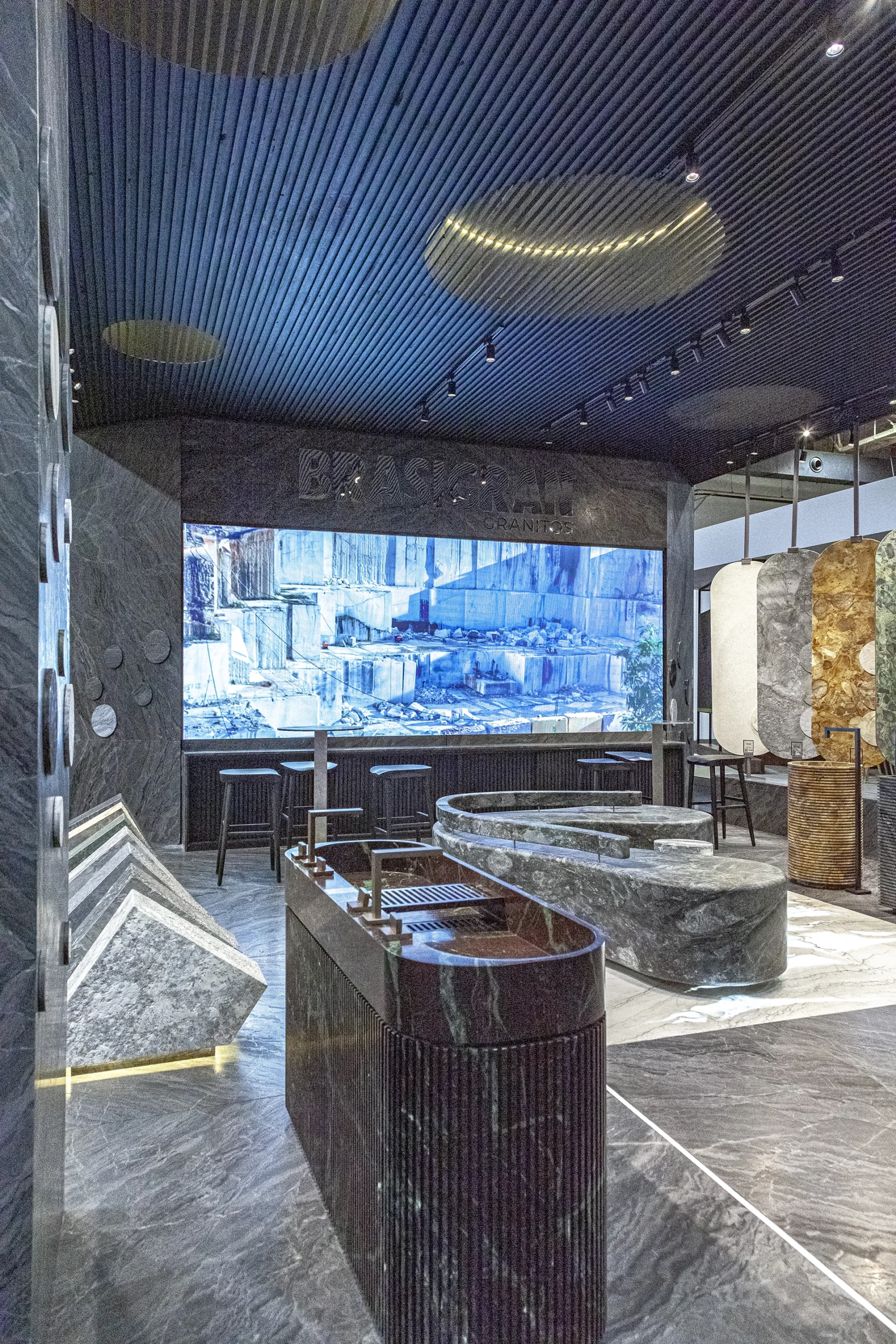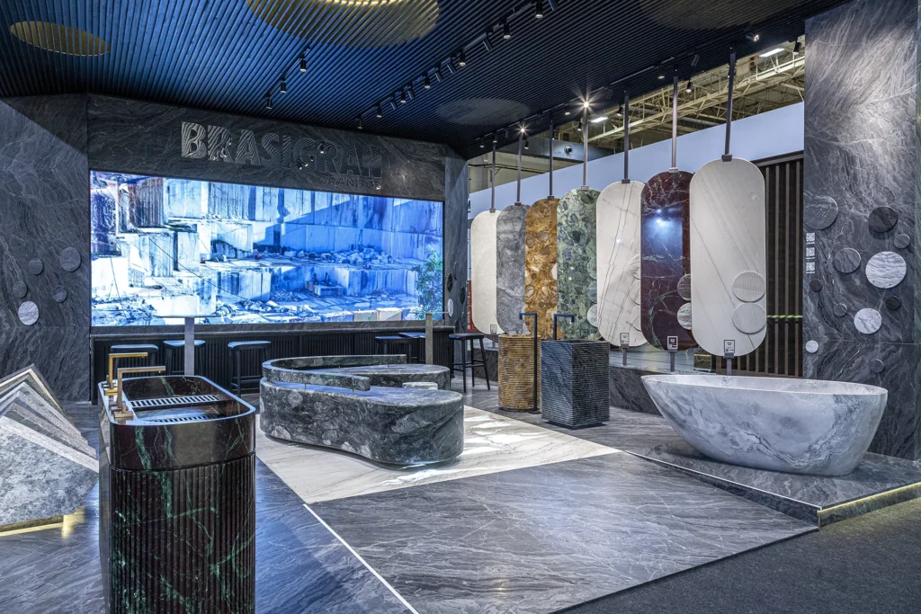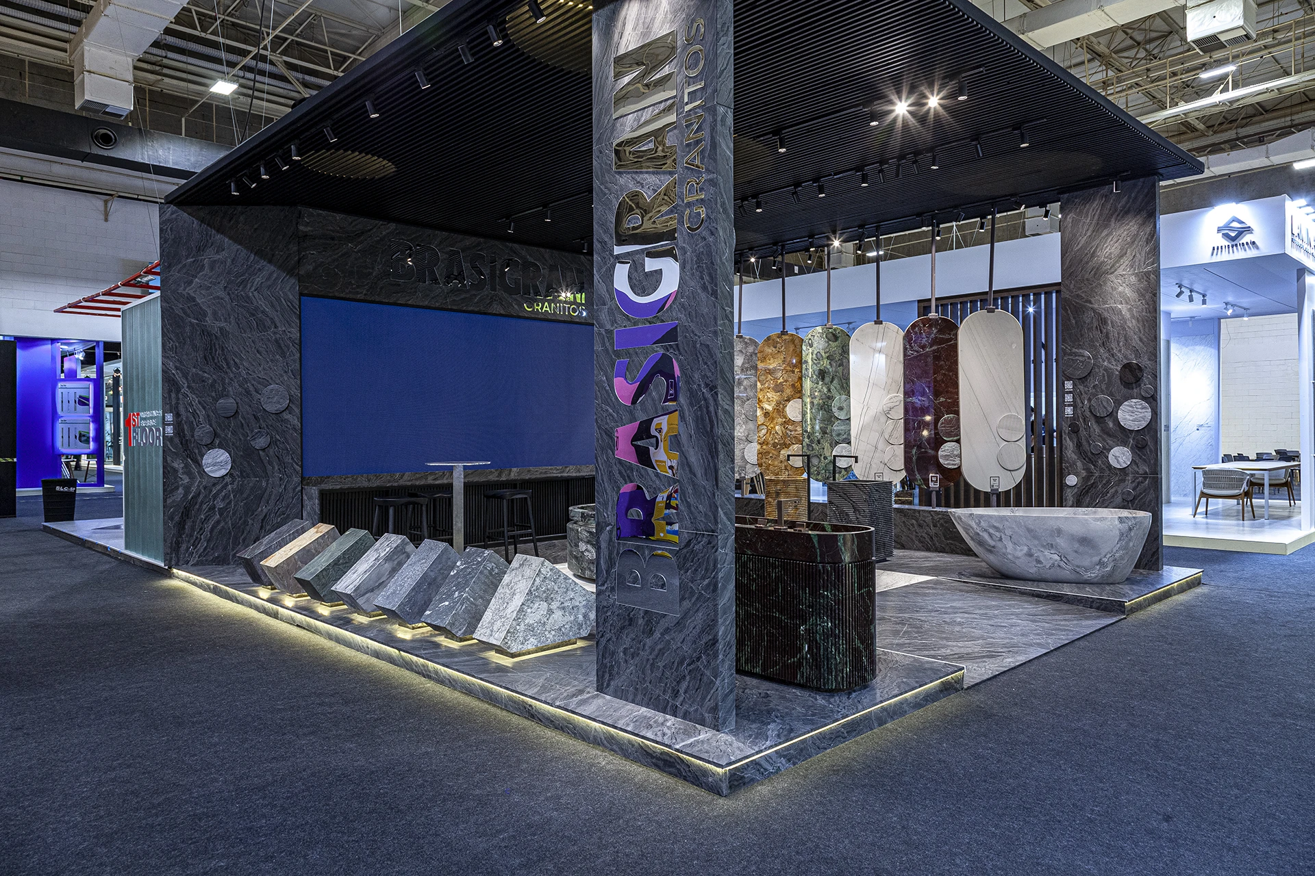 No estande da Brasigran na Expo Revestir 2022, o arquiteto David Bastos apresentou uma leitura contemporânea da rocha natural, explorando o material como forma, volume e expressão de design. Em um espaço de 56 m², blocos de mármore e quartzito foram reinterpretados por meio de tecnologia de escultura 3D, resultando em peças únicas — como a banheira oval e o banco maciço — moldadas sem emendas e com alto rigor técnico.