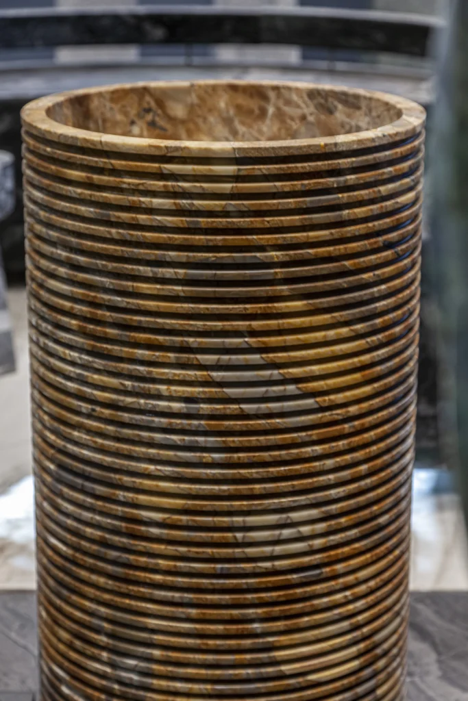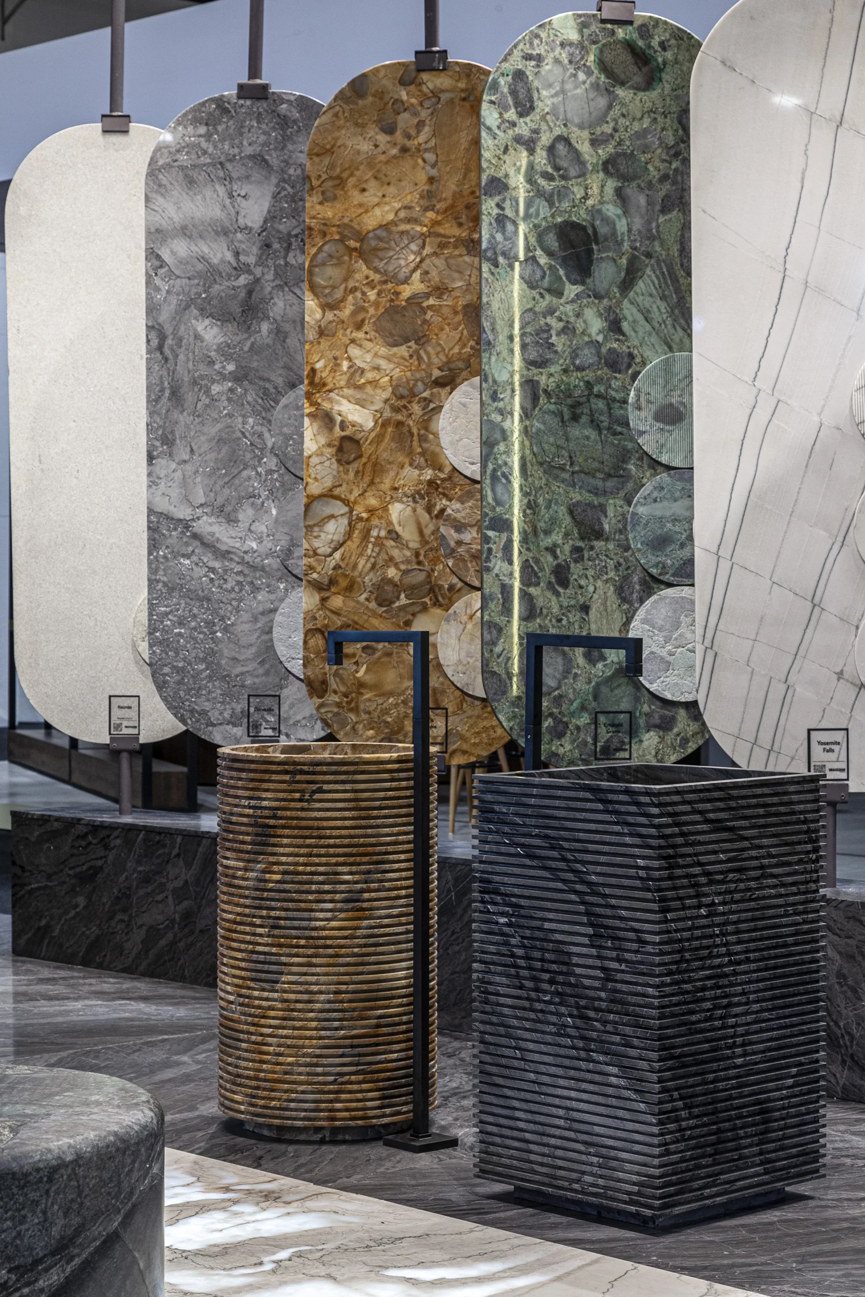 A composição destaca materiais como o Mármore Vittoria, o Quartzito Moulin Rouge e o Emerald Green, evidenciando a diversidade e a força da pedra brasileira. Bancadas caneladas, superfícies levigadas e volumes polidos criam um diálogo entre textura e luz, reforçando a versatilidade das rochas tanto em aplicações arquitetônicas quanto em objetos de design.