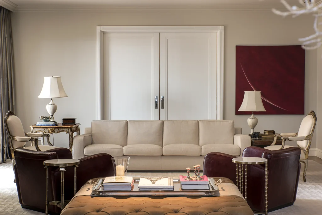 O ponto de maior impacto está na sala de jantar, onde o arquiteto sugeriu pintar as paredes de vermelho — uma decisão arrojada, prontamente acolhida pelo cliente. A cor imprime intensidade ao ambiente e estabelece um contraste elegante com a linguagem clássica do espaço, tornando-o um dos principais destaques do apartamento.