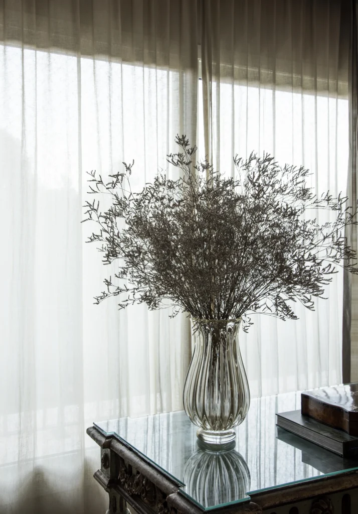 O mobiliário italiano reforça o caráter refinado do projeto. Na sala de jantar, as cadeiras giratórias Sebelloni, da marca De Padova, comercializadas pela Casual Móveis, acompanham a mesa com leveza e conforto, unindo design contemporâneo e excelência construtiva. O resultado é um ambiente marcante, que traduz a capacidade do projeto de conciliar tradição e inovação com naturalidade.