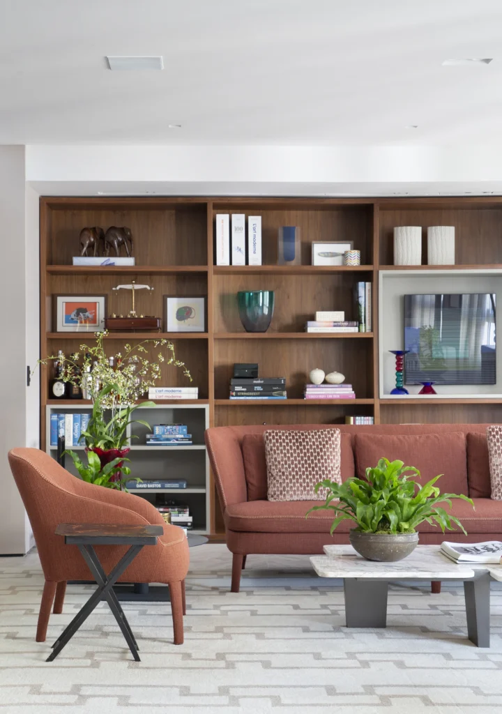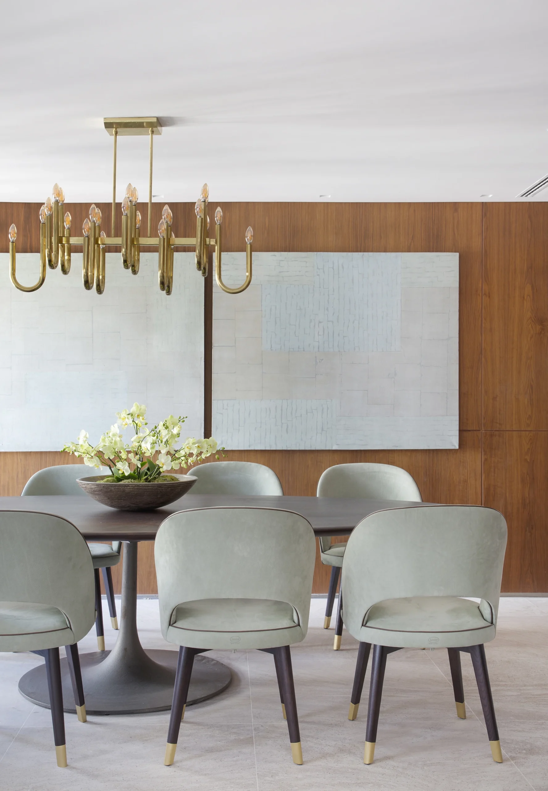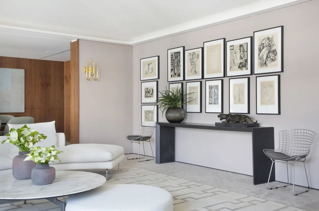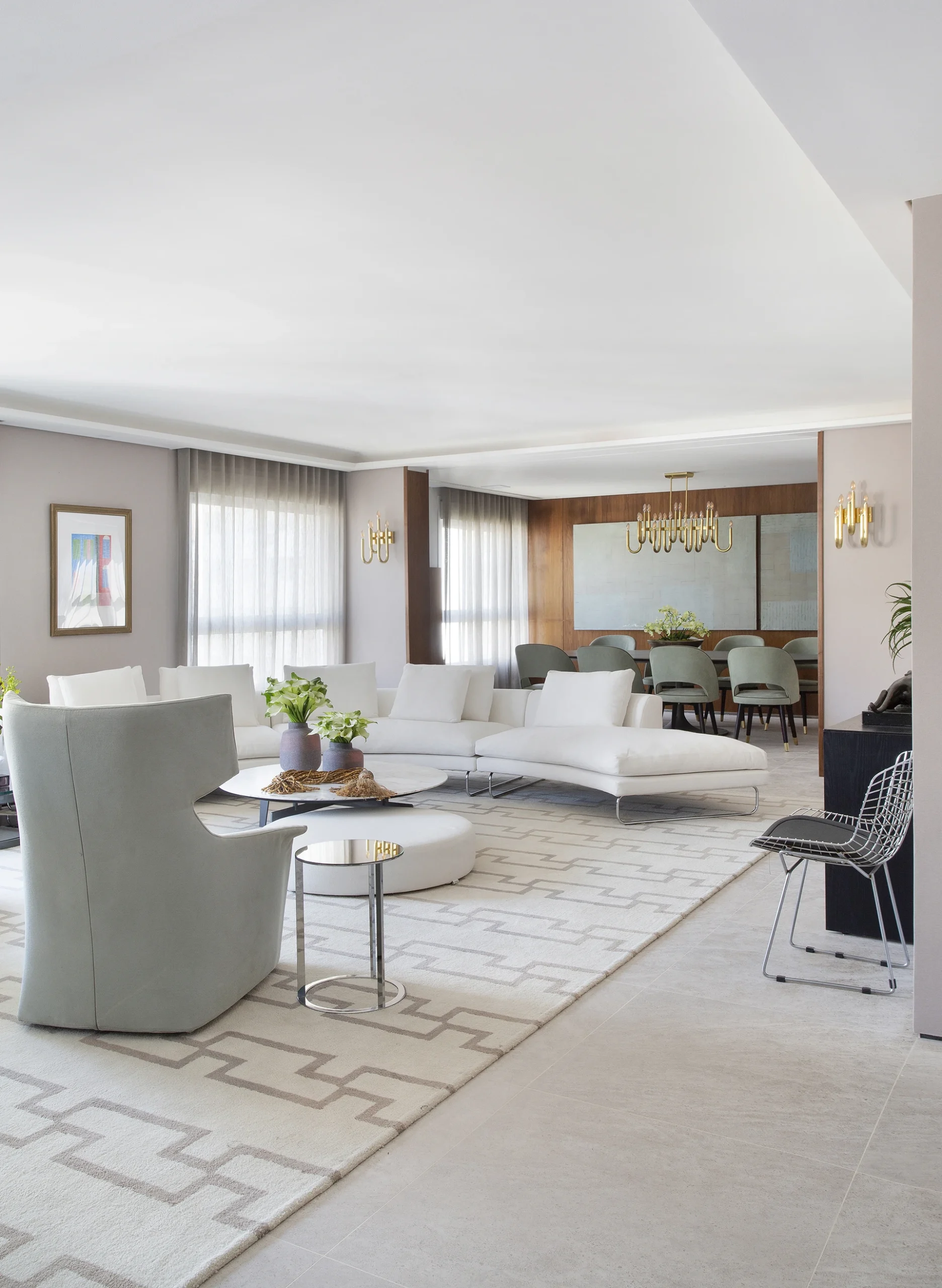 A decoração mescla peças novas com elementos do acervo anterior do cliente, como a mesa da copa com cadeiras da Baxter, o sofá da sala de TV da Poliform e as poltronas Pastilhas da Living Divani. As paredes da área social receberam papéis de parede da Celina Dias, enquanto o tapete sob medida da Santa Mônica, com impressionantes 4,5 x 12 metros, contribui para a sensação de unidade e conforto do living.
