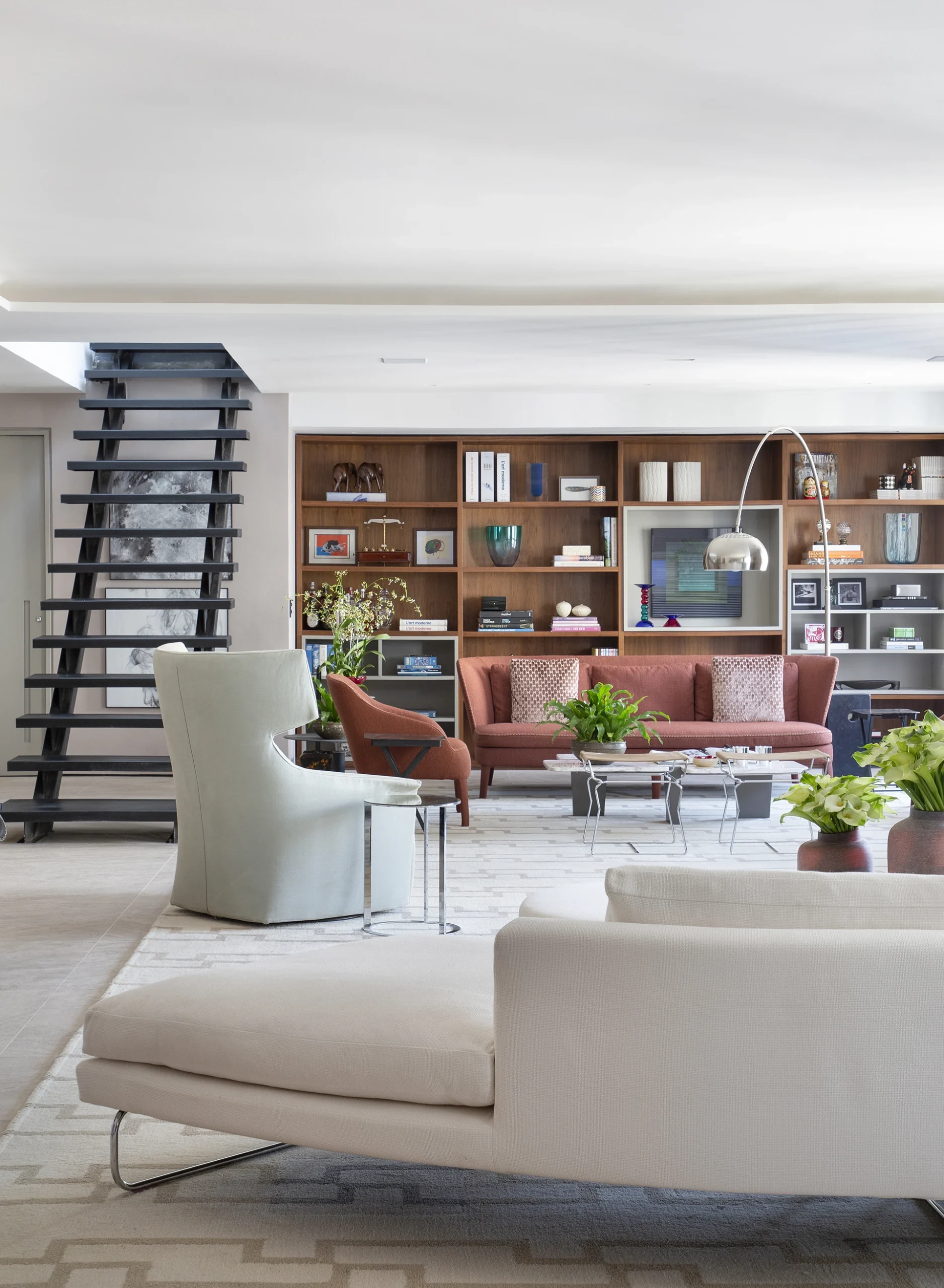 O conceito do projeto se apoia em uma paleta de tons leves e sóbrios, pensada para um homem contemporâneo que valoriza espaço, conforto e arte. Madeiras, tons terrosos e a abundante luz natural criam uma atmosfera acolhedora e sofisticada, especialmente no living, onde os sofás da 4 Mariani se destacam, assim como a escada preta, elemento de forte impacto visual. Todos os móveis foram cuidadosamente selecionados por David Bastos em conjunto com o cliente, respeitando seu gosto pessoal e reforçando a ideia de que cada projeto deve refletir a identidade de quem o habita. A marcenaria, os estofamentos e os móveis — todos de origem italiana — foram fornecidos pela Casual Móveis.