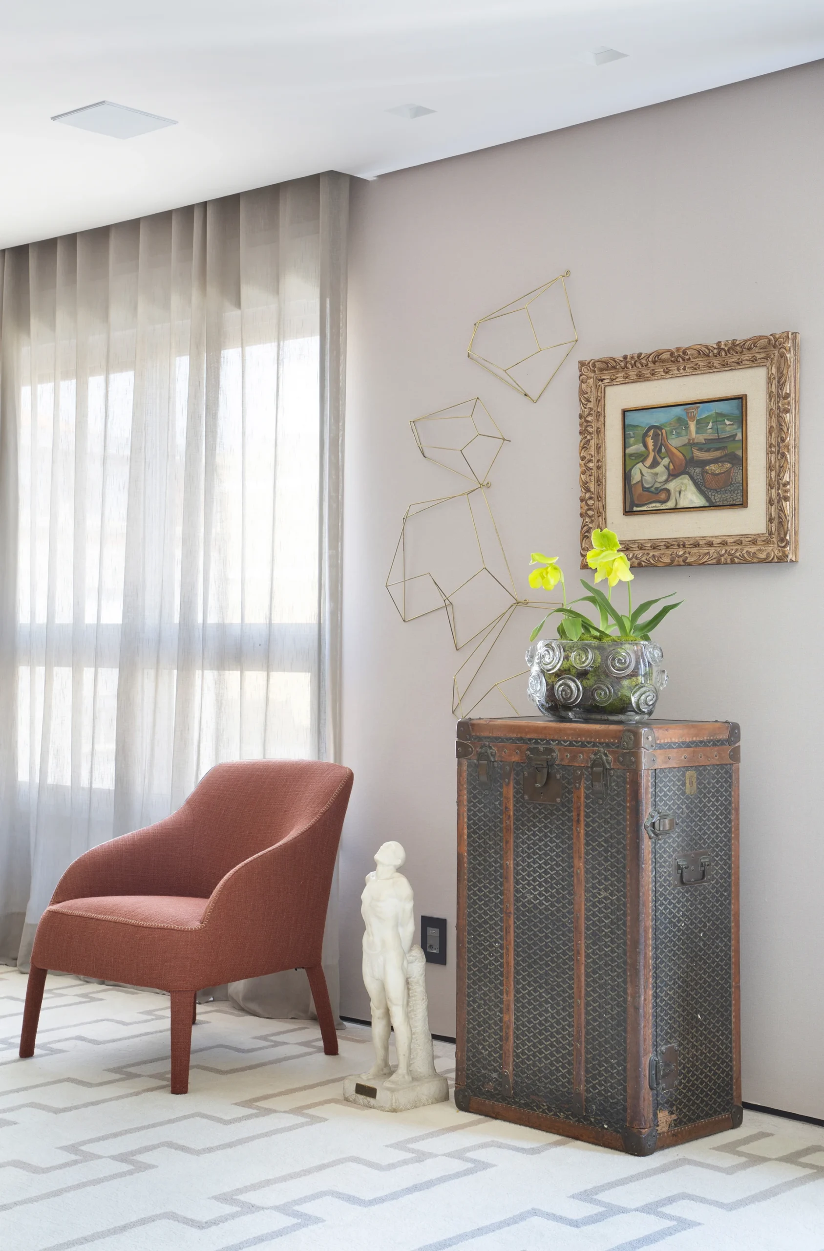 A arte ocupa papel central no projeto. Obras de Alfredo Volpi, Di Cavalcanti, Roberto Burle Marx e uma escultura de Carybé convivem com peças garimpadas pelo próprio cliente, como um baú vintage da Goyard e obras de autoria desconhecida, criando um conjunto plural e cheio de personalidade.