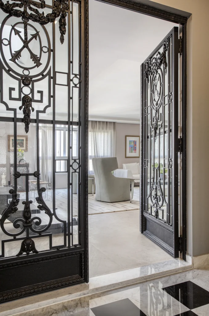 Logo na entrada, o apartamento revela sua história: a porta de ferro forjado original, restaurada, traz folhas e frutos de café, além do brasão da família do Barão do Café que construiu o edifício e viveu na cobertura, enquanto seus filhos ocupavam os andares inferiores. O piso em tabuleiro de dama preto e branco reforça o caráter clássico desse primeiro contato com o espaço.