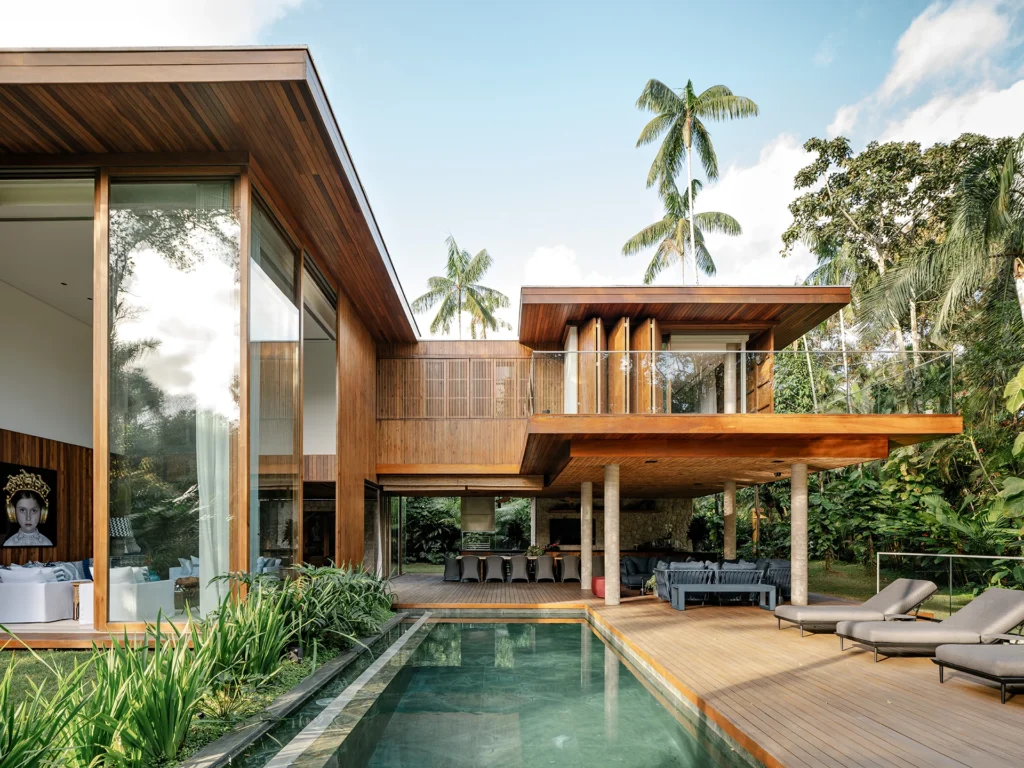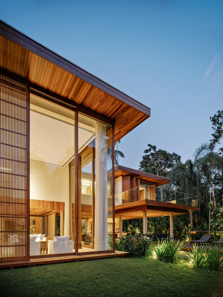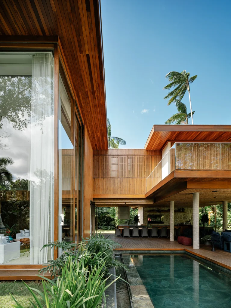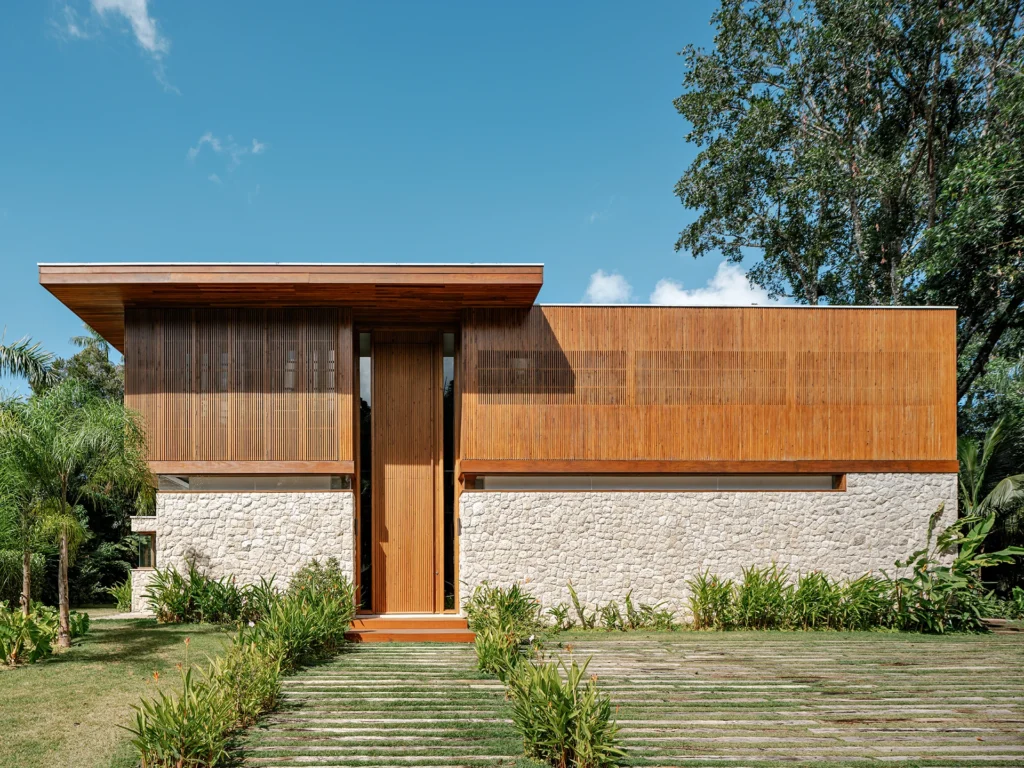 A estrutura foi executada em concreto armado convencional, com pilares, vigas e lajes que garantem vãos amplos e pé-direito generoso. Na fachada e nos espaços externos, os materiais aparecem de forma natural e equilibrada: pedra moledo nas áreas molhadas, na piscina e em pontos da fachada; madeira nos decks, beirais e forros; e painéis ripados em madeira de reflorestamento combinados a grandes planos de vidro, dissolvendo os limites entre interior e jardim.