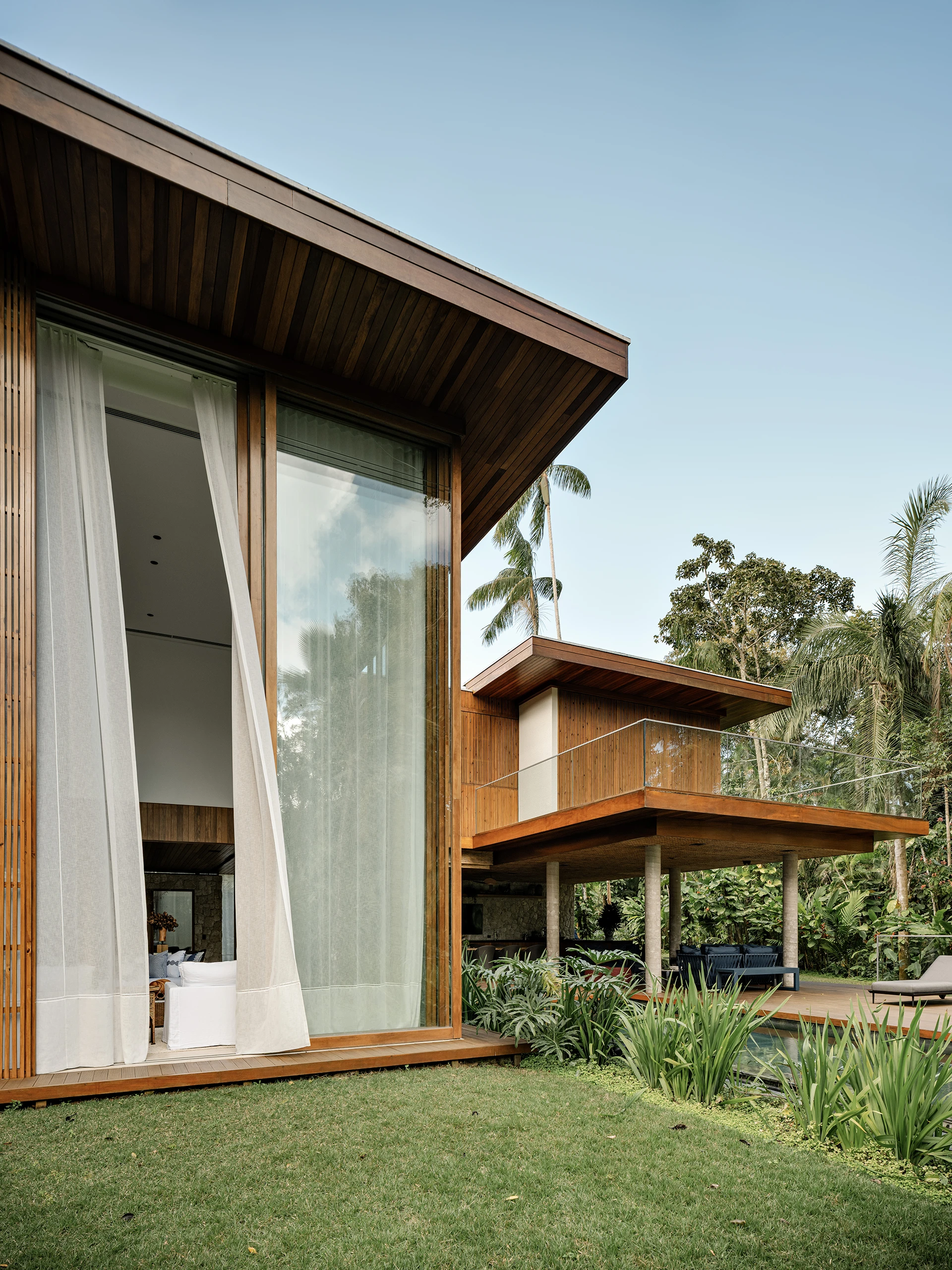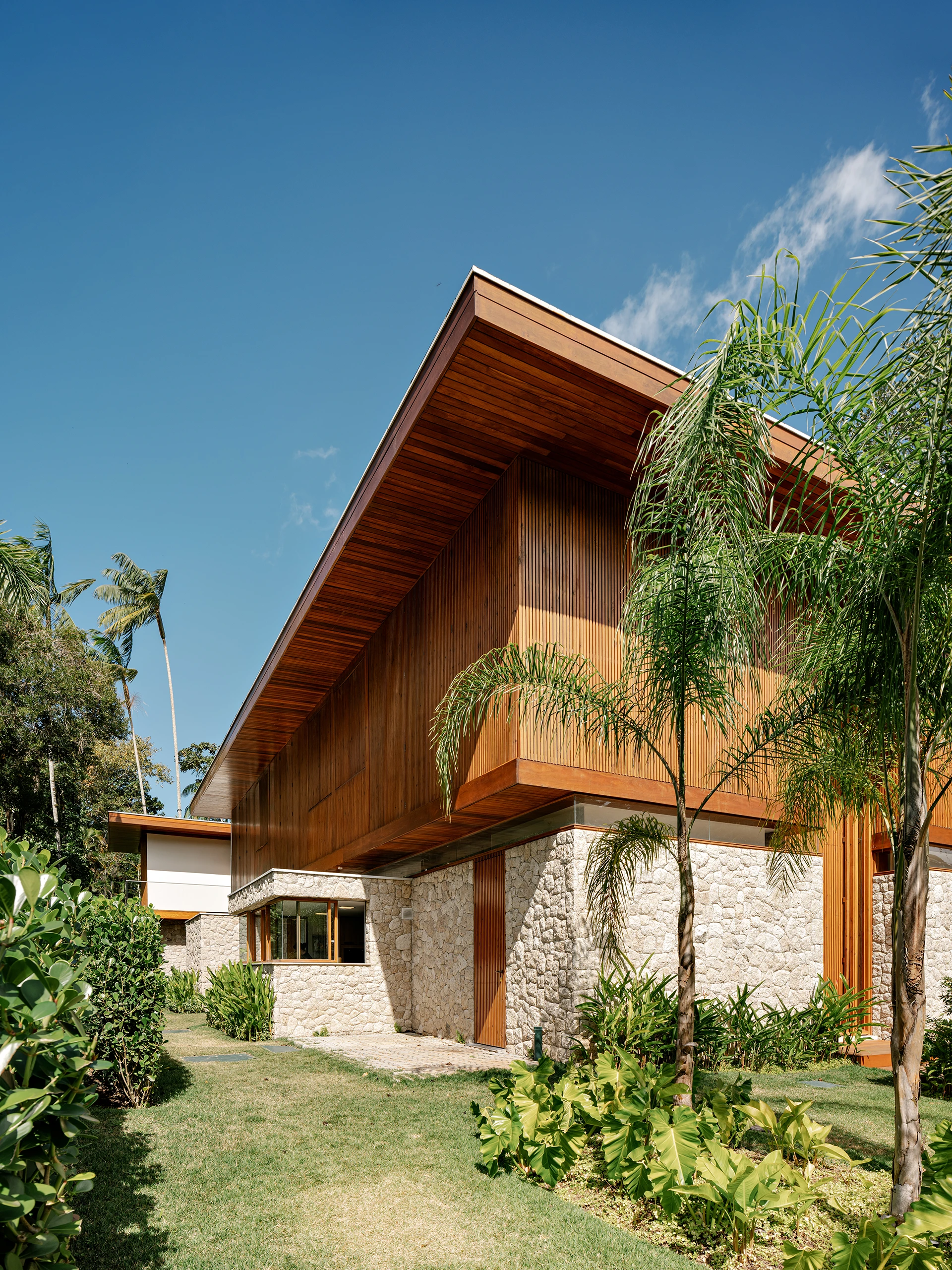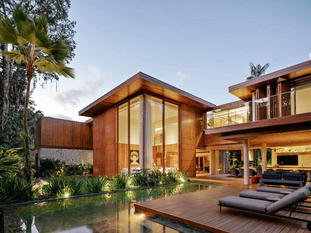 A estrutura foi executada em concreto armado convencional, com pilares, vigas e lajes que garantem vãos amplos e pé-direito generoso. Na fachada e nos espaços externos, os materiais aparecem de forma natural e equilibrada: pedra moledo nas áreas molhadas, na piscina e em pontos da fachada; madeira nos decks, beirais e forros; e painéis ripados em madeira de reflorestamento combinados a grandes planos de vidro, dissolvendo os limites entre interior e jardim.