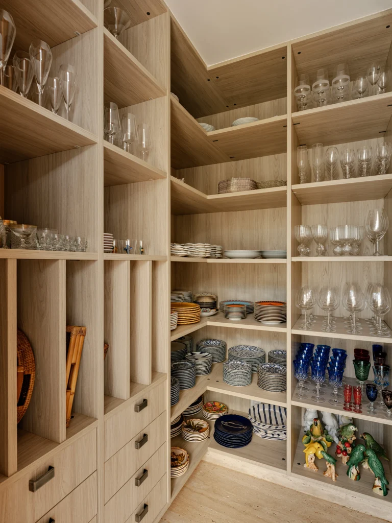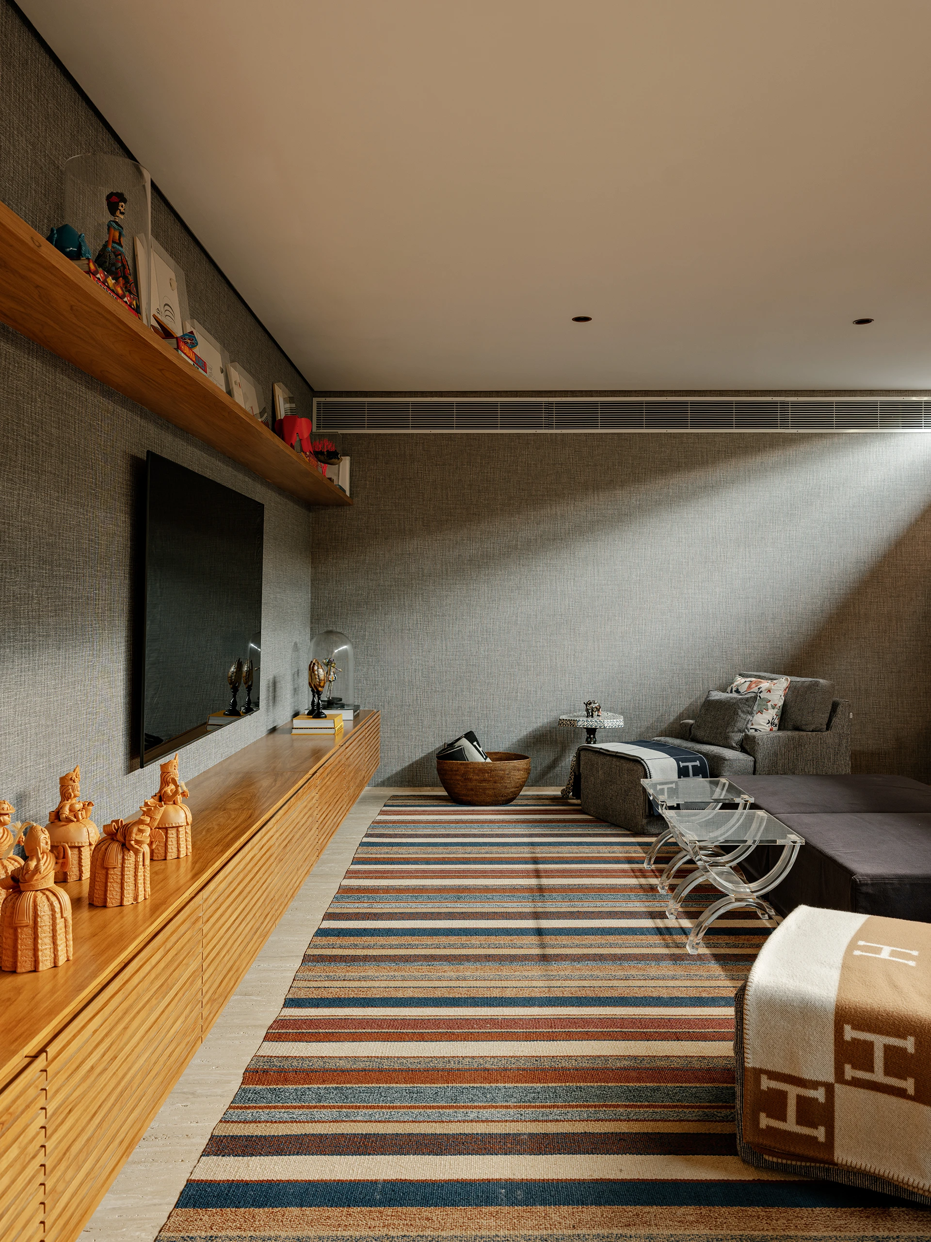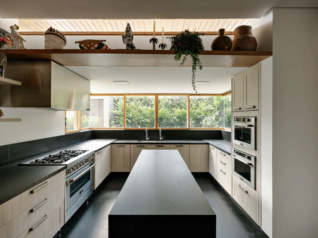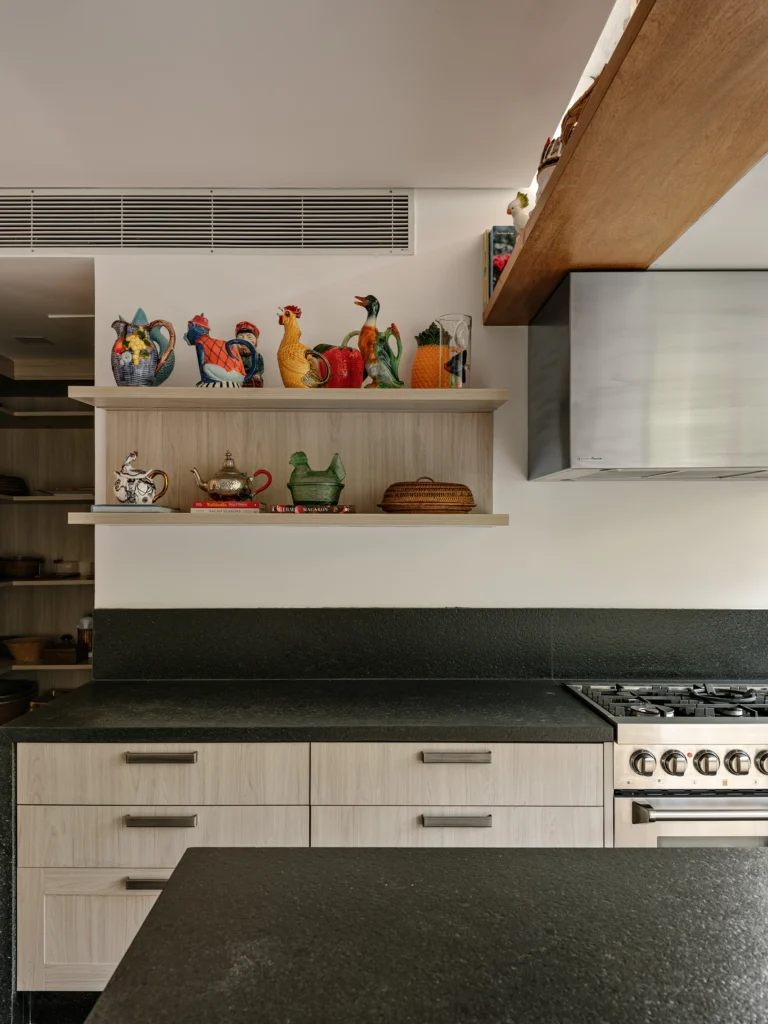 Entre os destaques artísticos estão a escultura de Armarinhos Teixeira e obras do acervo da cliente, além do quadro de Adriana Duque, que pontuam os ambientes com identidade e significado. No quarto do casal, as esquadrias camarão da Mado permitem abertura total para a varanda, enquanto o papel de parede em palha, os tapetes e os tecidos cuidadosamente selecionados reforçam a sensação de conforto e continuidade estética.