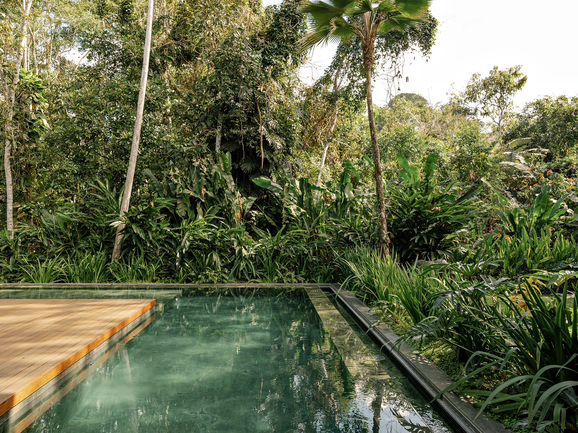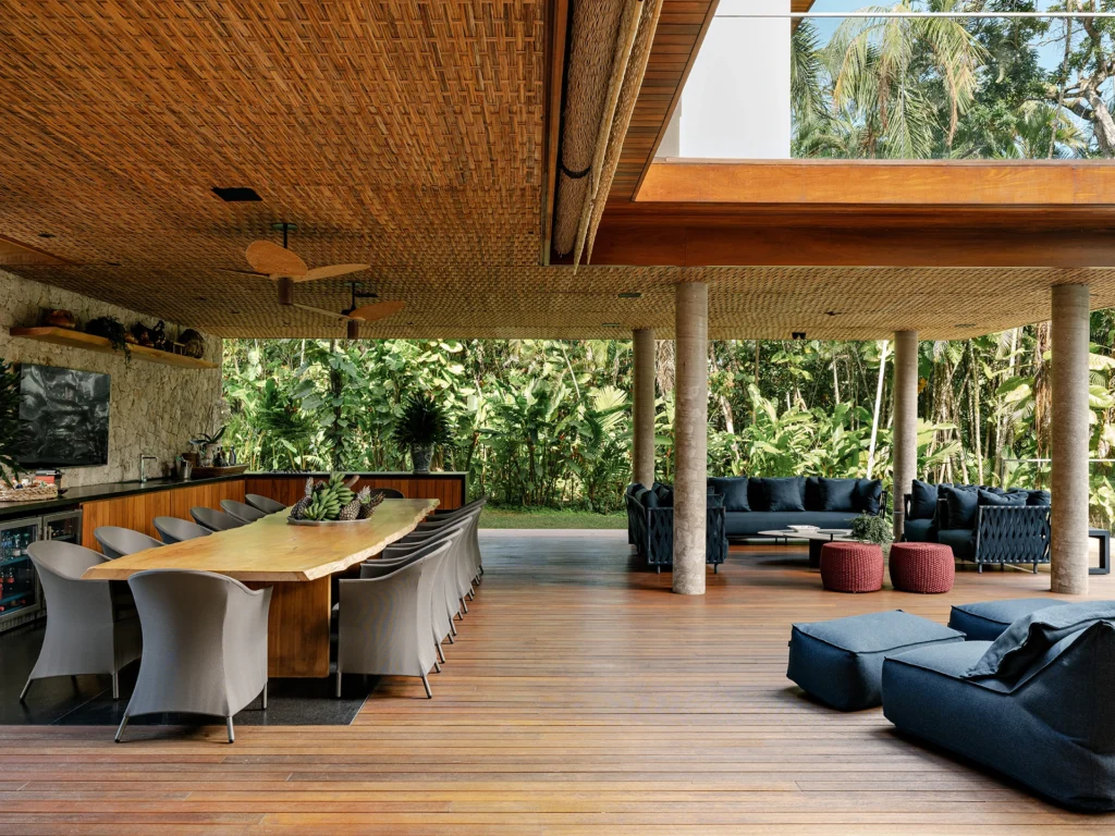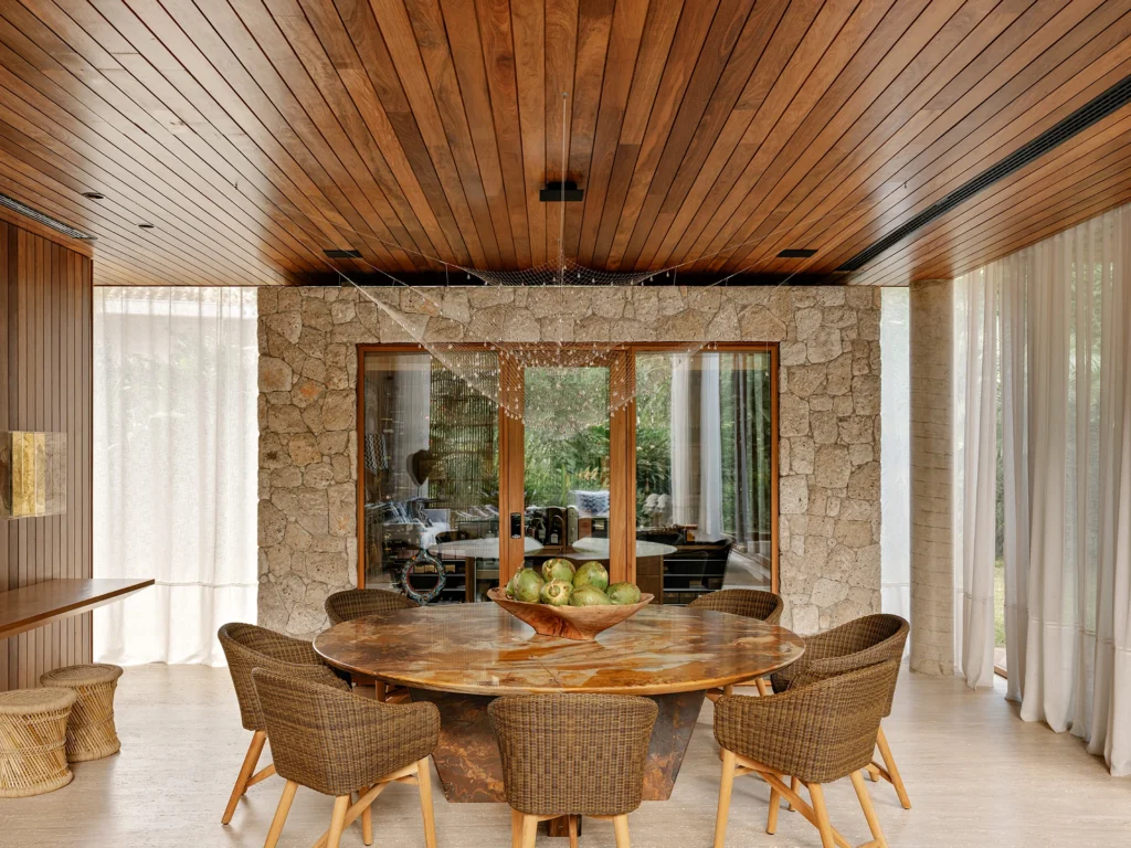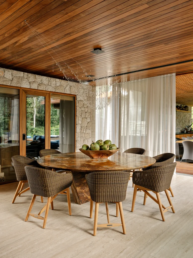 Na área gourmet, concebida como uma grande varanda sob a suíte master, a conexão com a natureza é total. Madeira, pedra, palha, cortinas de dendê e a generosa mesa de pequiá, com 5,50 metros de comprimento, definem o espaço, que se abre completamente para o jardim e a piscina. O deck em cumaru, da Hydrotech, e o revestimento da piscina em mármore verde Vitória Régia, da Brasigran, reforçam a integração entre arquitetura e paisagem.