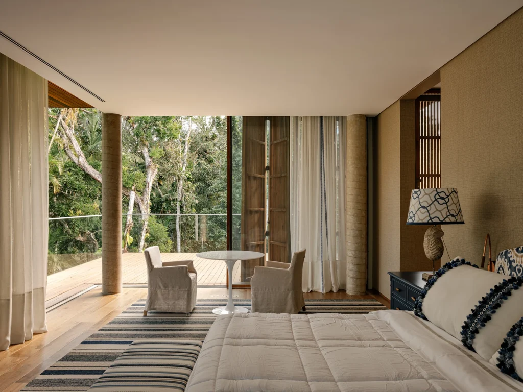 No pavimento superior, os dormitórios se organizam ao longo de uma galeria com vista para o pé-direito duplo e para diferentes pontos focais de paisagismo. Todos os quartos mantêm relação direta com o verde, assegurando privacidade, conforto térmico e iluminação natural abundante.