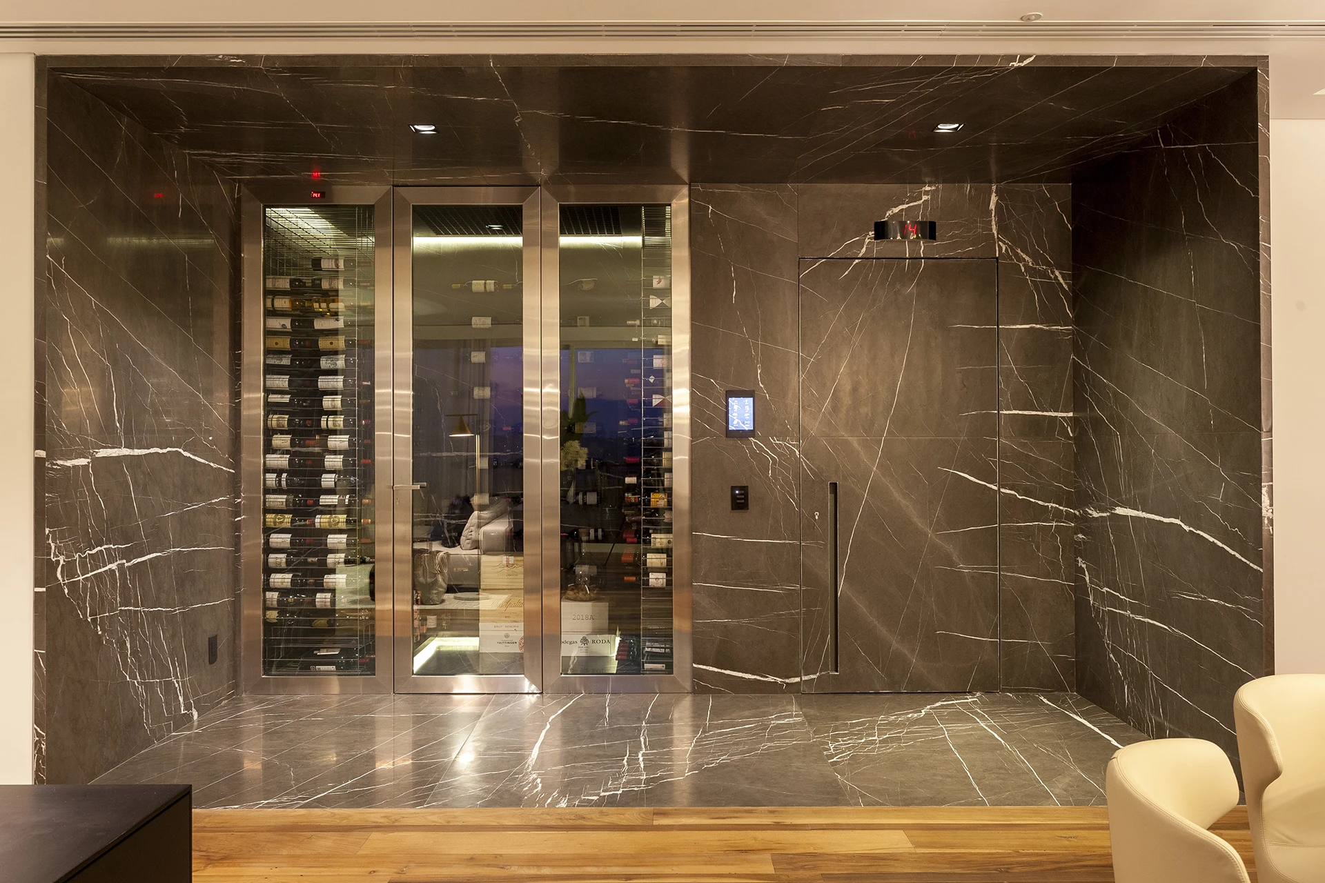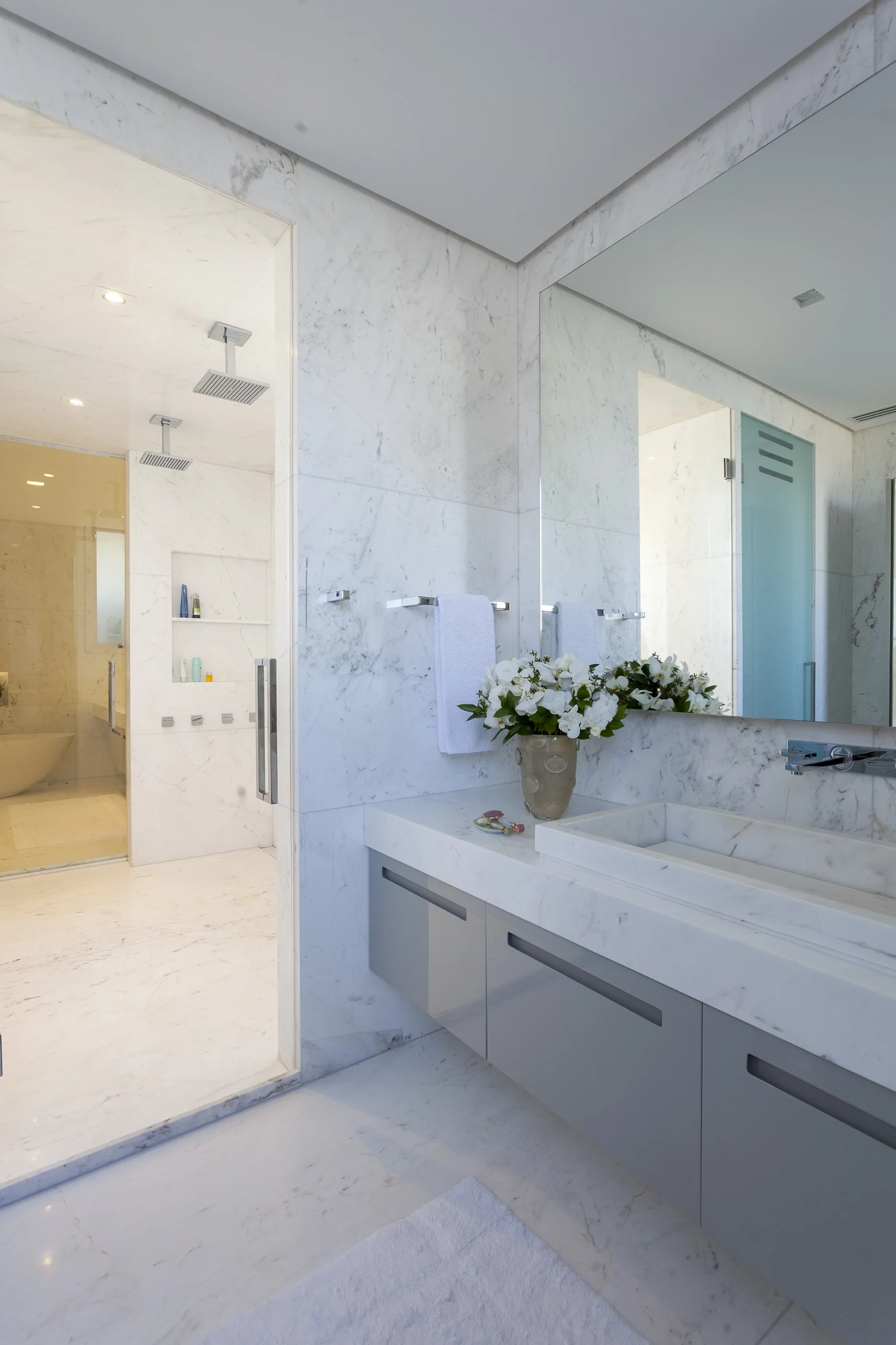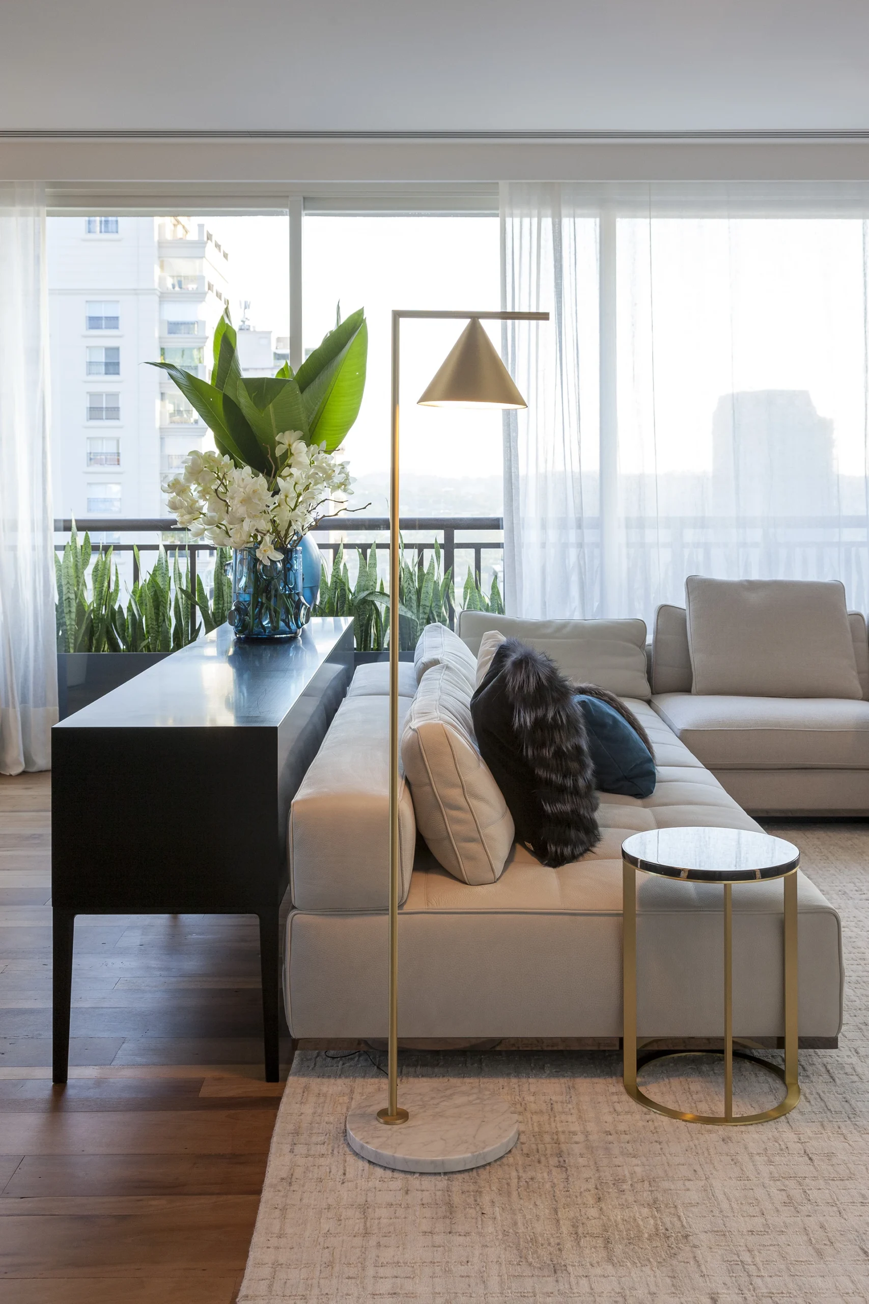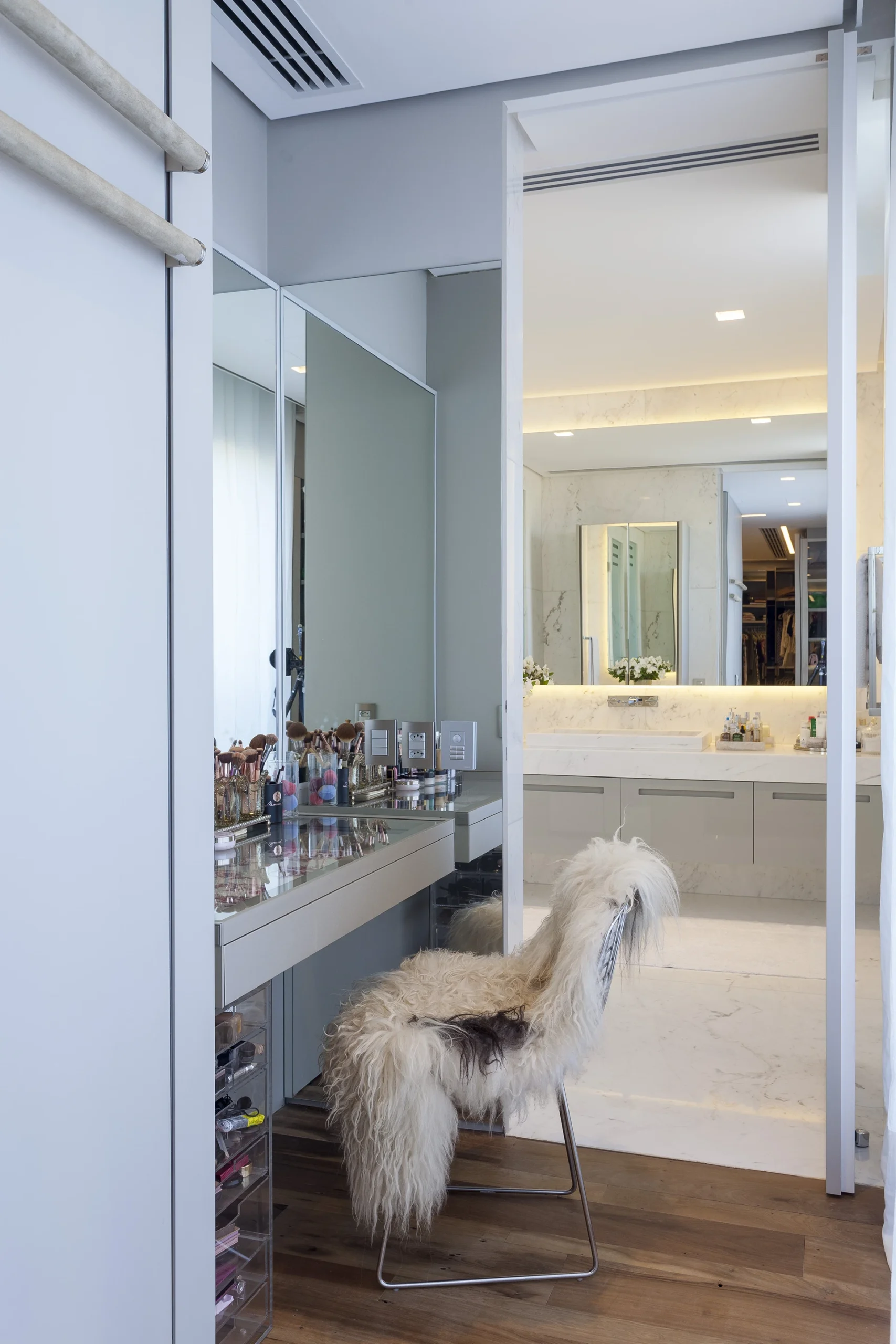 A inspiração norteadora foi a amplitude — ambientes grandes, ventilados e conectados visualmente. Esse conceito se materializa no living de paredes neutras e piso em madeira, solução que percorre praticamente todo o apartamento, conferindo unidade e aconchego. O projeto também se destaca pela adega posicionada em um cubo de mármore no hall de entrada, pelos jogos de espelho no lavabo e pelo uso sofisticado de mármores nos banhos.
