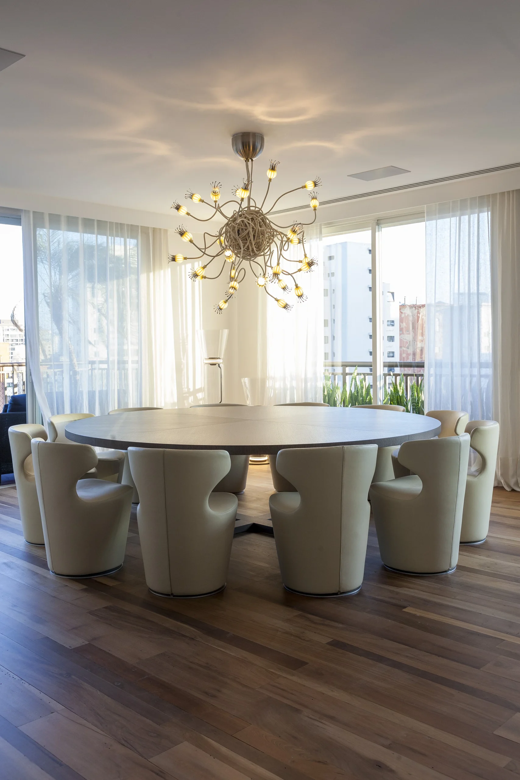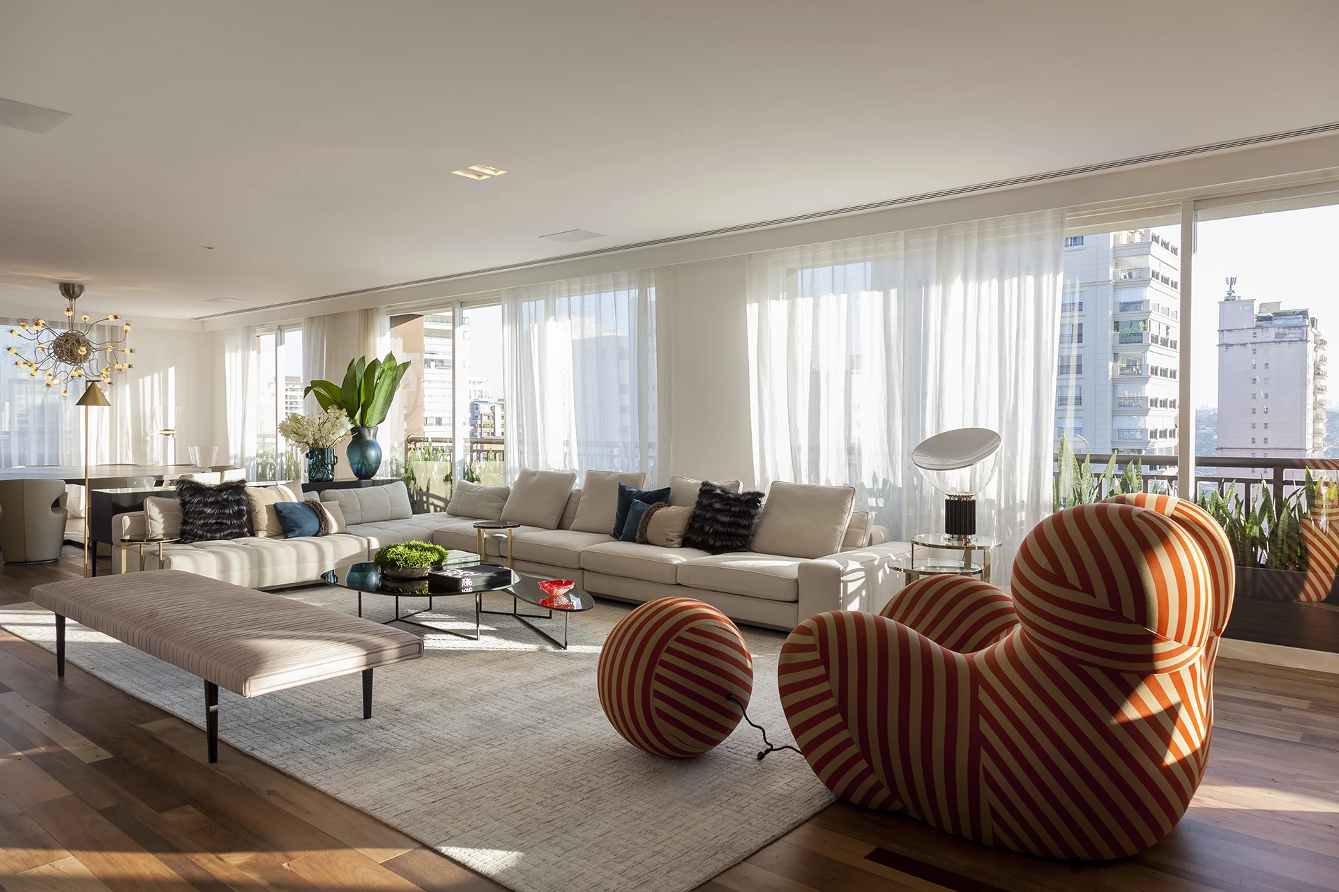 Neste apartamento de 780 m² em São Paulo, o desafio foi aproveitar ao máximo cada metro quadrado para atender ao desejo de um casal com uma filha de 15 anos, que adora receber. A reforma reorganizou a planta original e ampliou áreas estratégicas: dois dormitórios foram integrados para criar uma ampla suíte master, a cozinha ganhou metragem extra e parte do terraço foi transformada em um espaço gourmet totalmente integrado ao living, jantar e varanda.