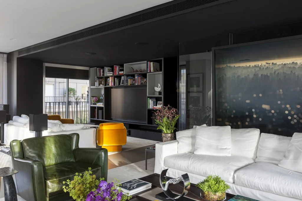 O conceito do projeto partiu da criação de ambientes integrados, com forte presença da iluminação natural, onde o mobiliário e as obras de arte assumem papel central na composição. Na área social, a paleta equilibra tons sóbrios e claros, com painéis em carvalho ebanizado contrastando com paredes em off-white, criando um pano de fundo elegante para peças icônicas de design e um acervo artístico expressivo.