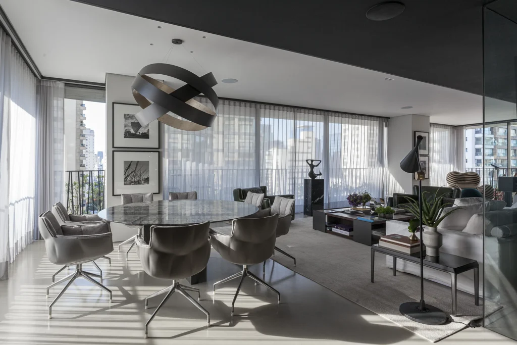 A curadoria do mobiliário privilegia o design contemporâneo internacional, com destaque para cadeiras assinadas por Patricia Urquiola, a icônica poltrona Donna, de Gaetano Pesce para a B&B Italia, além de poltronas em couro verde da Baxter e uma poltrona em tom laranja da Gallotti&Radice, que adiciona personalidade e cor ao ambiente. A mesa de jantar, desenhada pelo próprio escritório e executada pela Brasigran, reforça o caráter autoral do projeto.