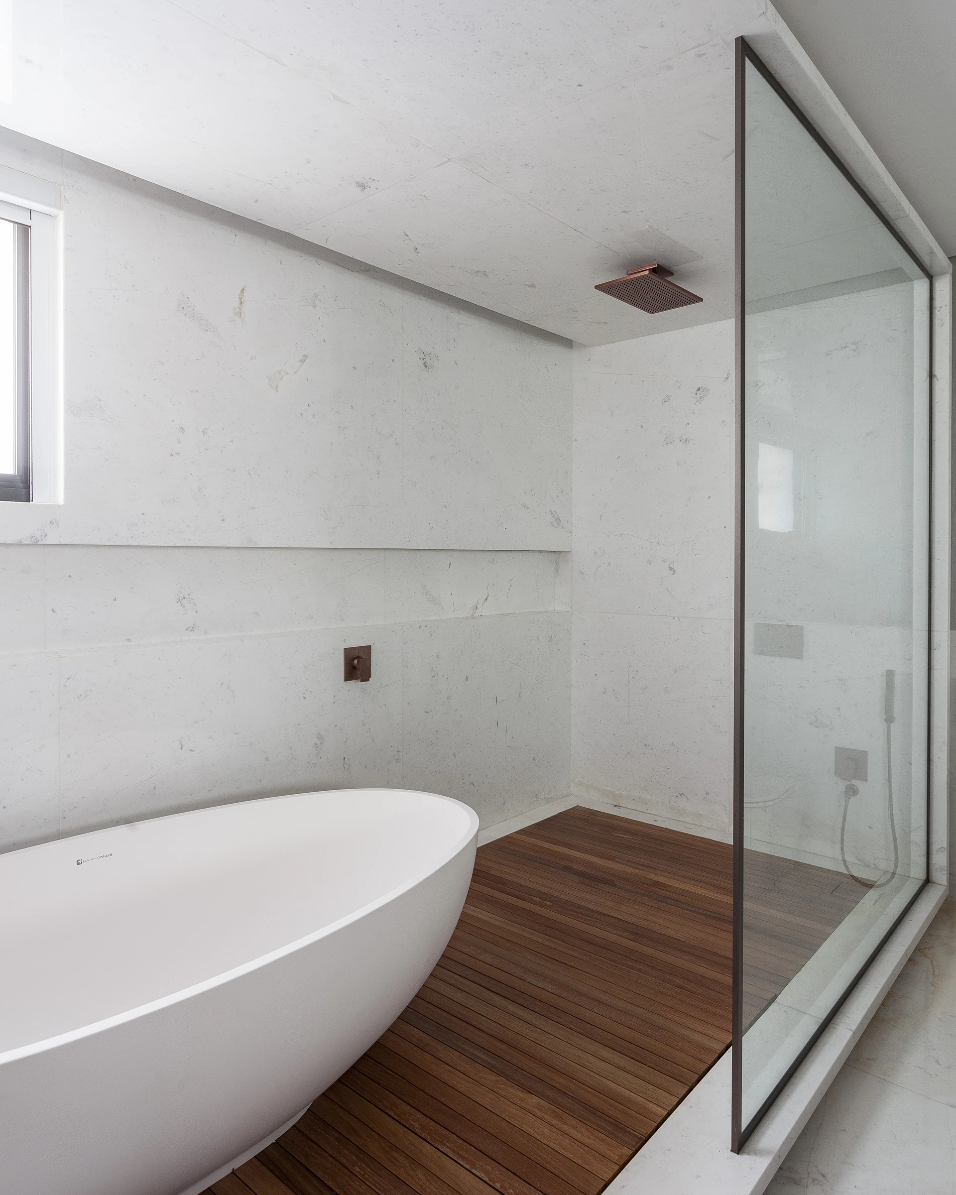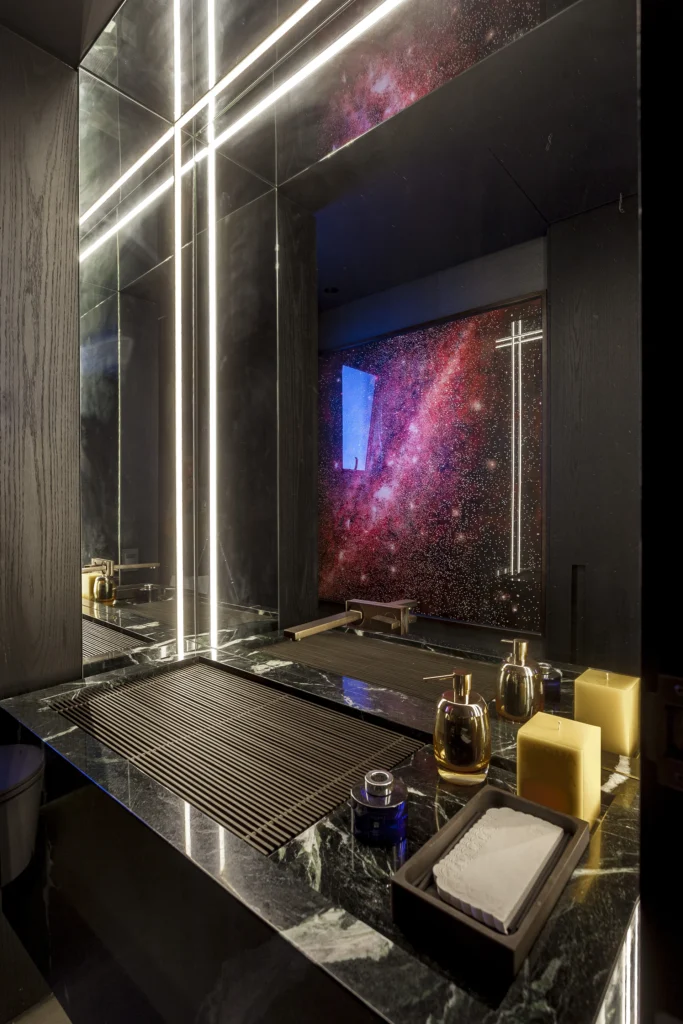 Um elemento de destaque é o hall de entrada, resolvido com uma caixa de vidro que equilibra transparência e privacidade, em contraponto à “caixa preta” em carvalho ebanizado que percorre as marcenarias e conecta visualmente os ambientes sociais. Essa solução sintetiza a essência do projeto: contraste, harmonia e poesia.