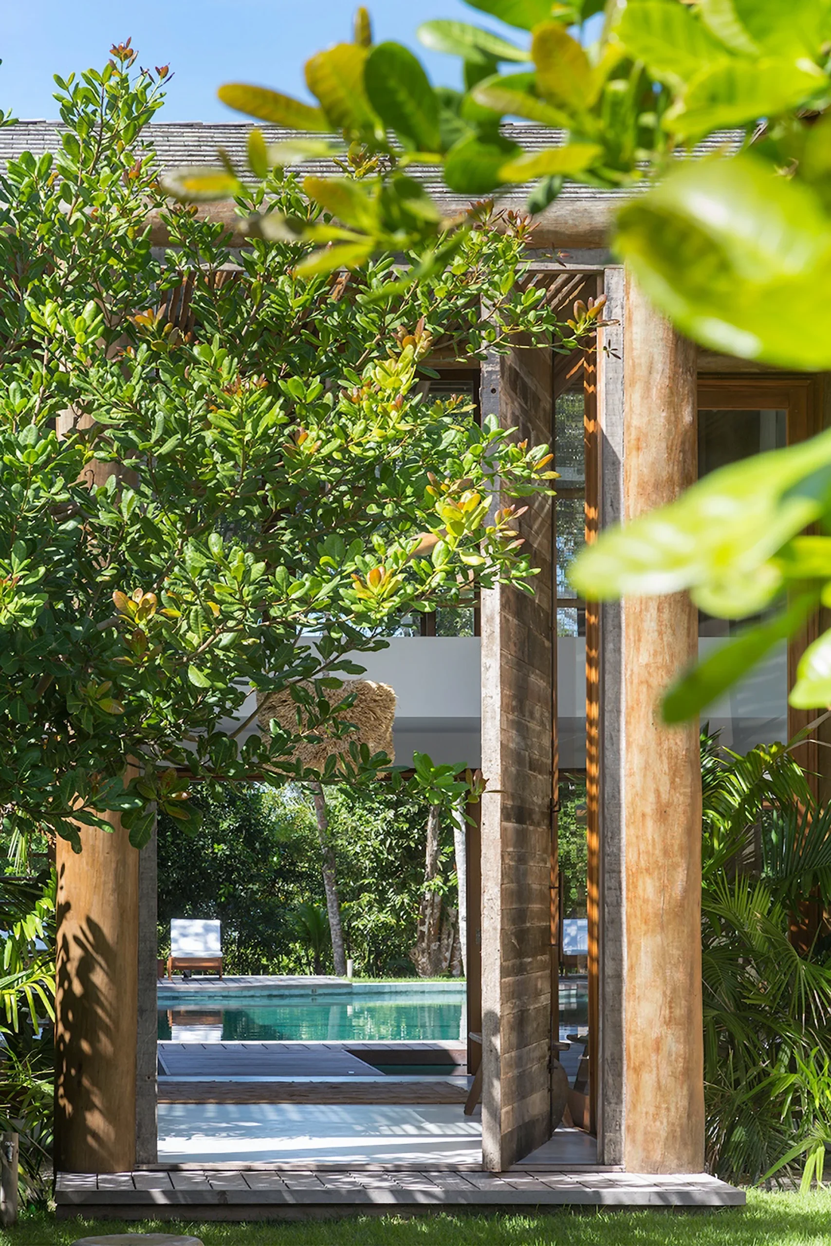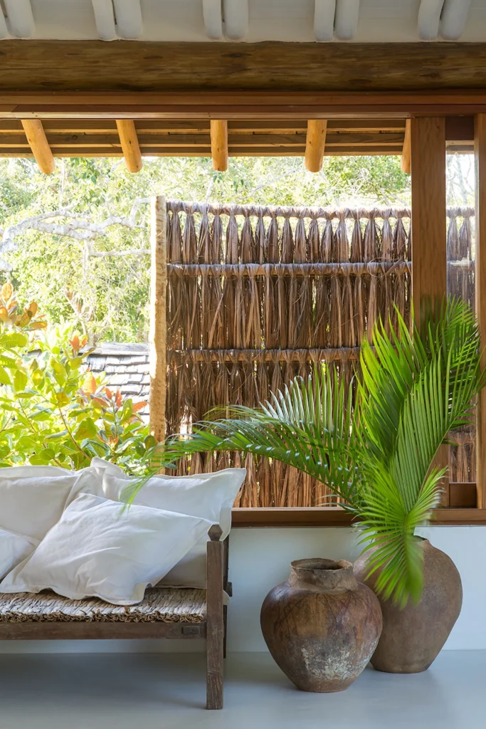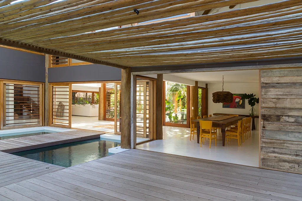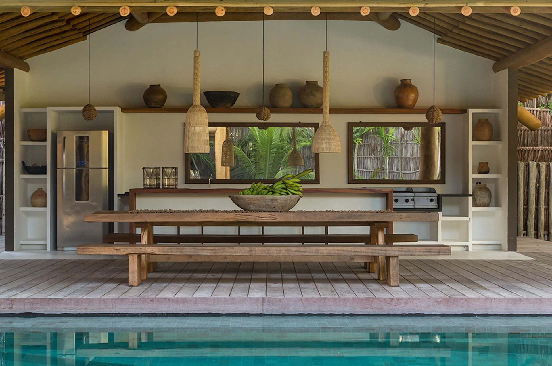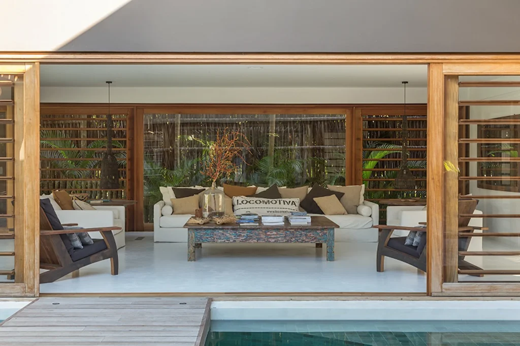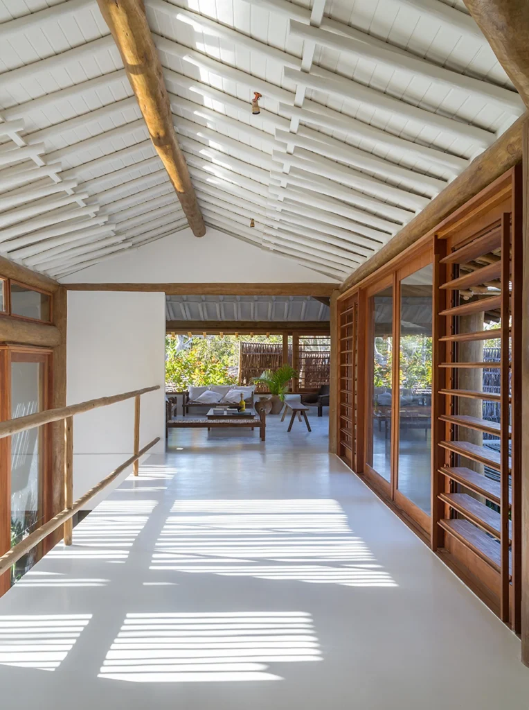 Grandes esquadrias garantem abundante iluminação natural, ventilação cruzada e conforto térmico, permitindo que a casa se abra completamente para o exterior. Os paletões, presentes em todos os ambientes, reforçam a linguagem construtiva típica de Trancoso e contribuem para a sensação de leveza e continuidade espacial.
