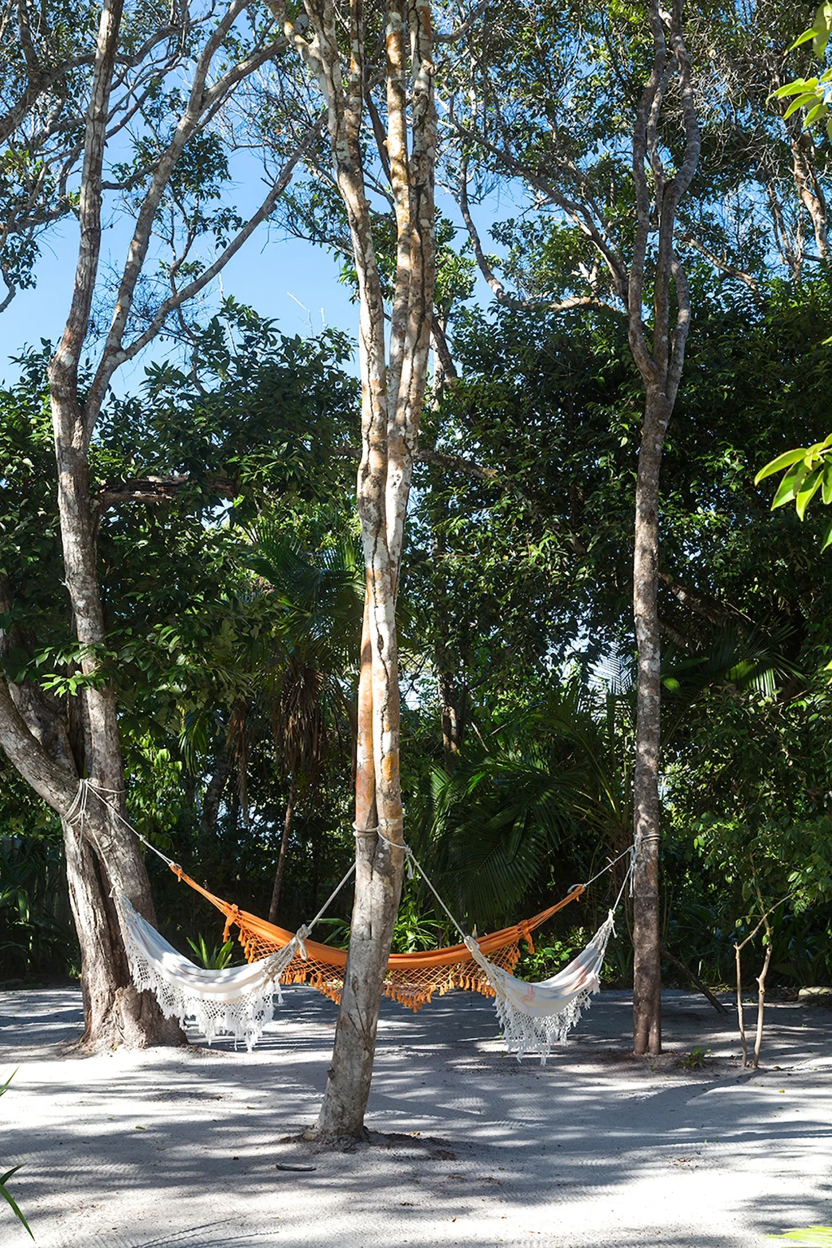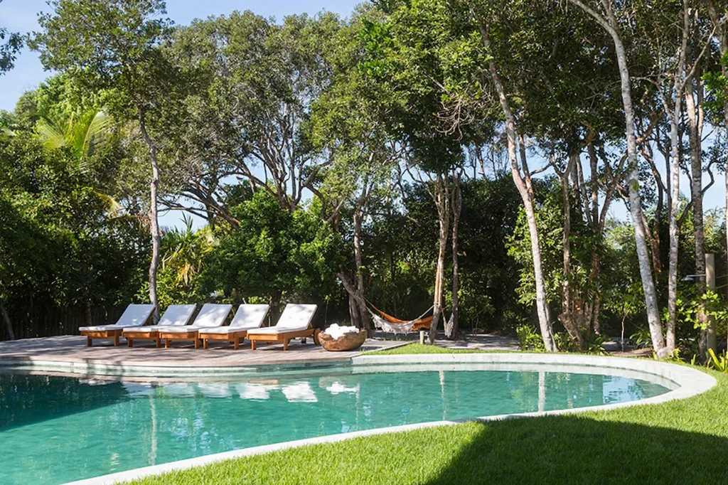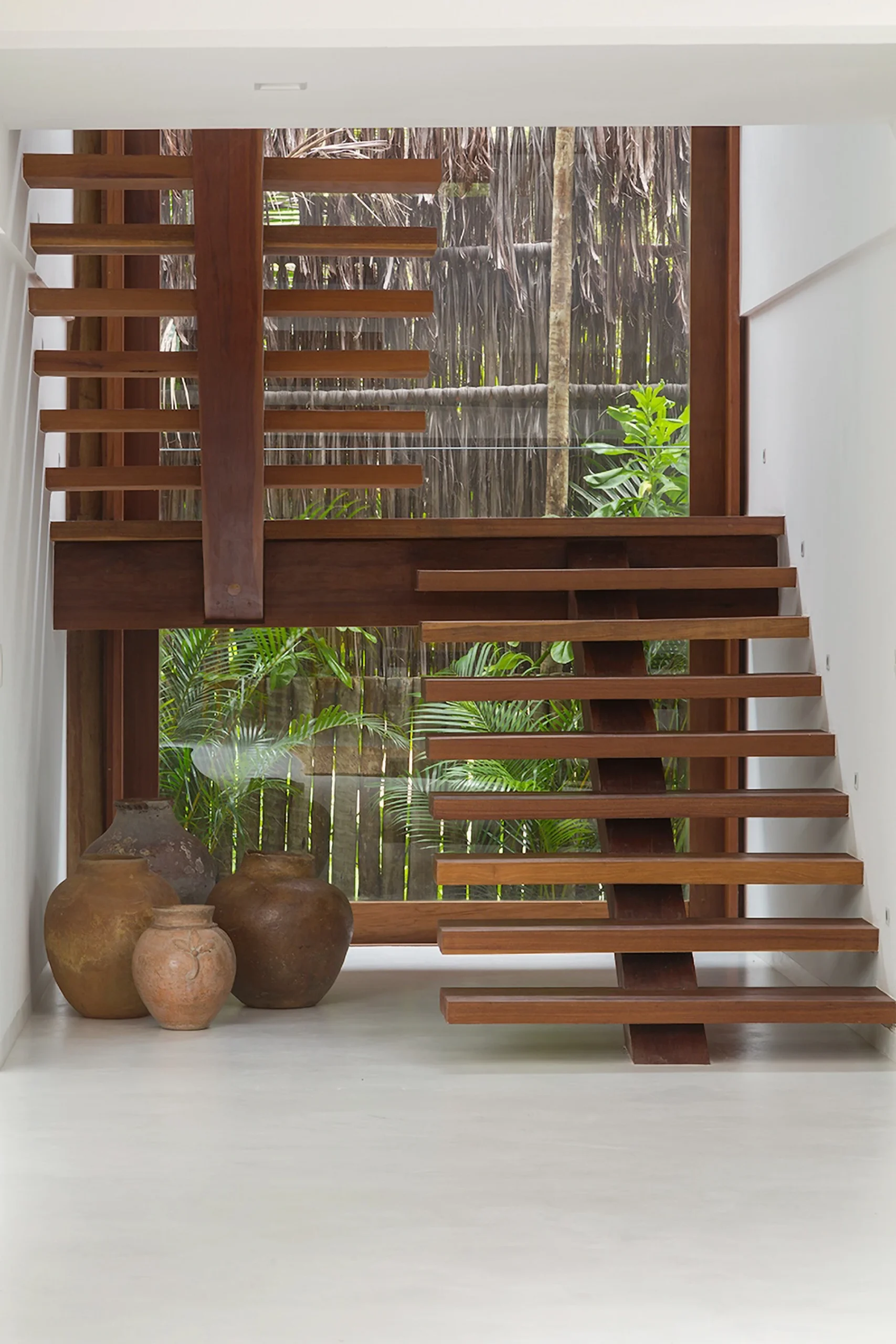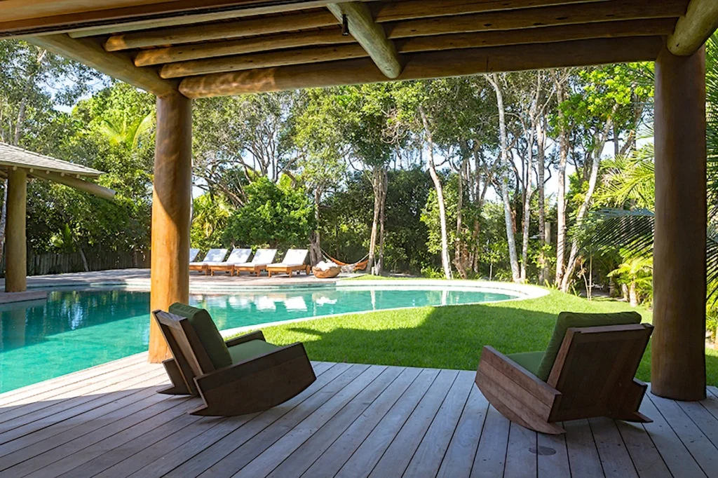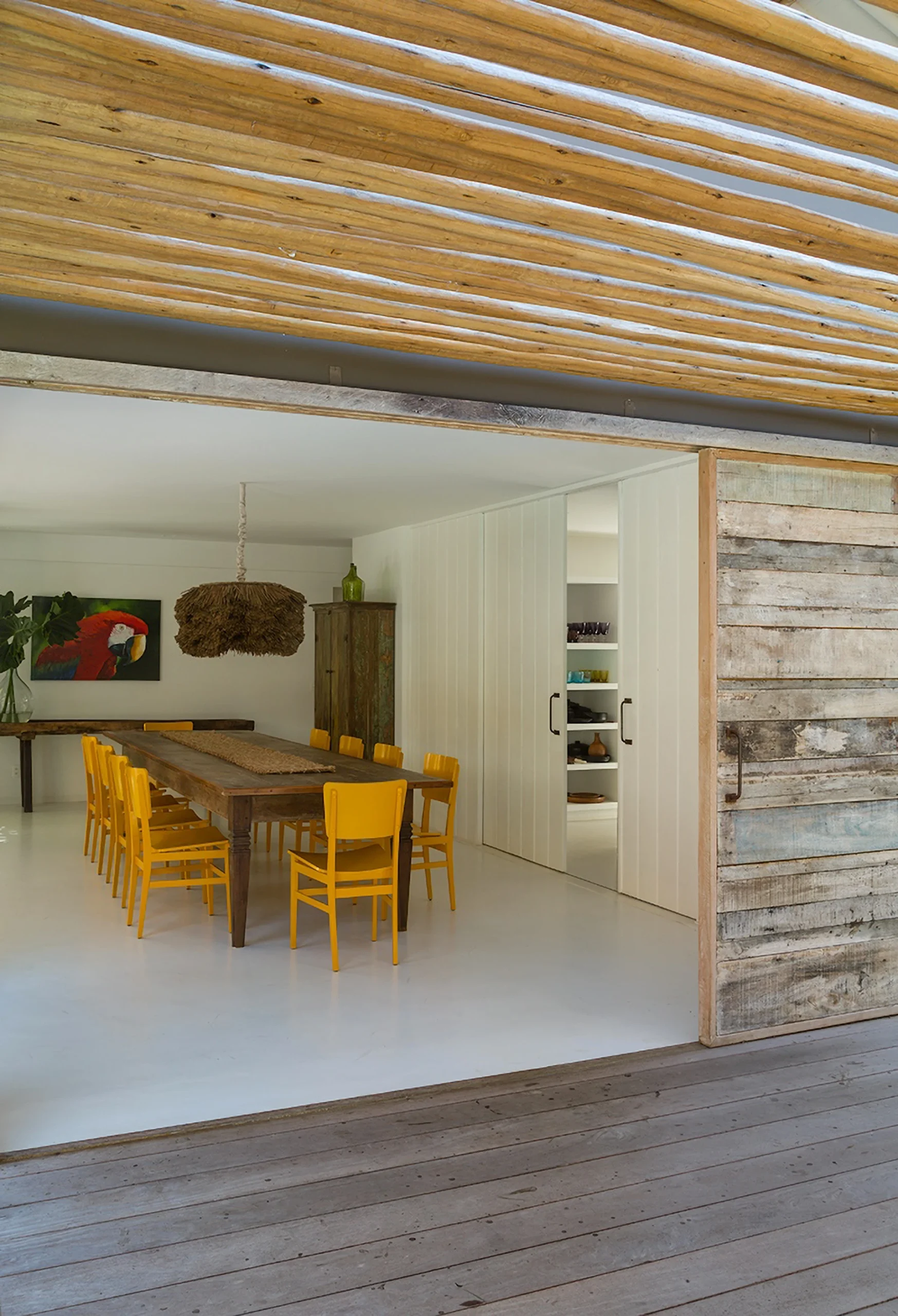 Grandes esquadrias garantem abundante iluminação natural, ventilação cruzada e conforto térmico, permitindo que a casa se abra completamente para o exterior. Os paletões, presentes em todos os ambientes, reforçam a linguagem construtiva típica de Trancoso e contribuem para a sensação de leveza e continuidade espacial.