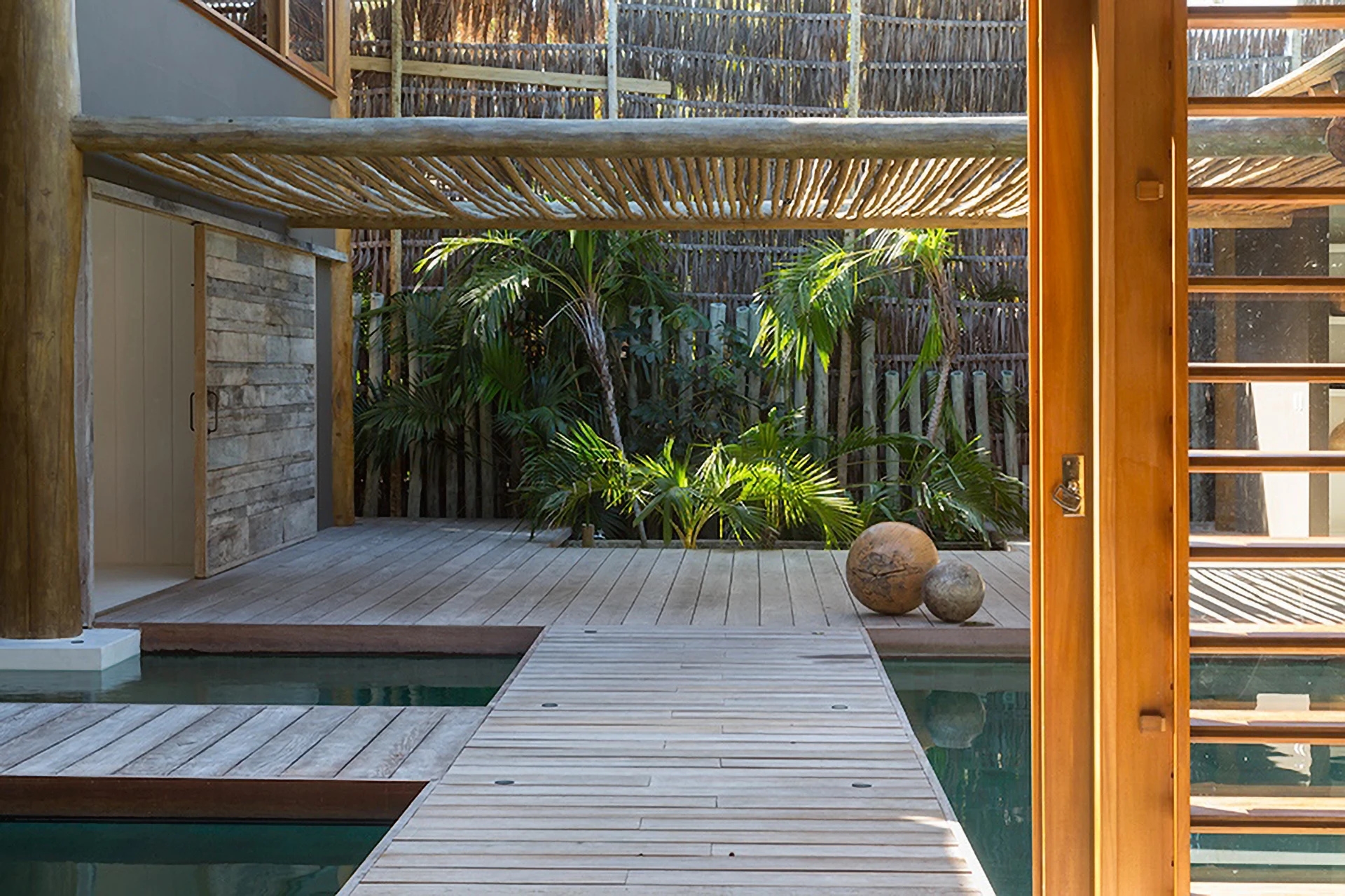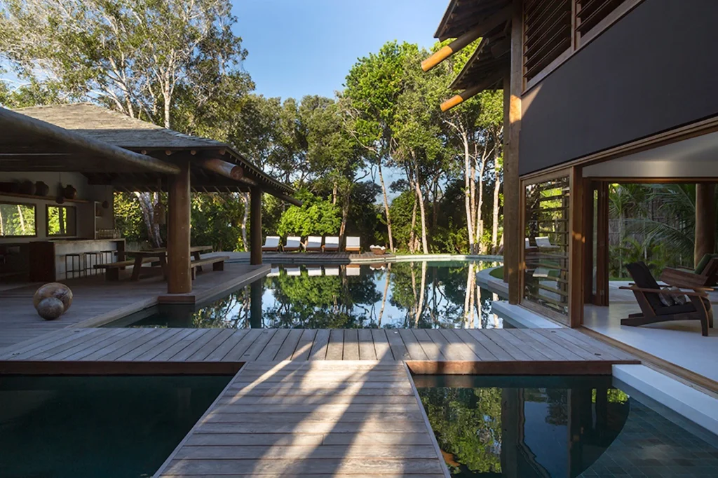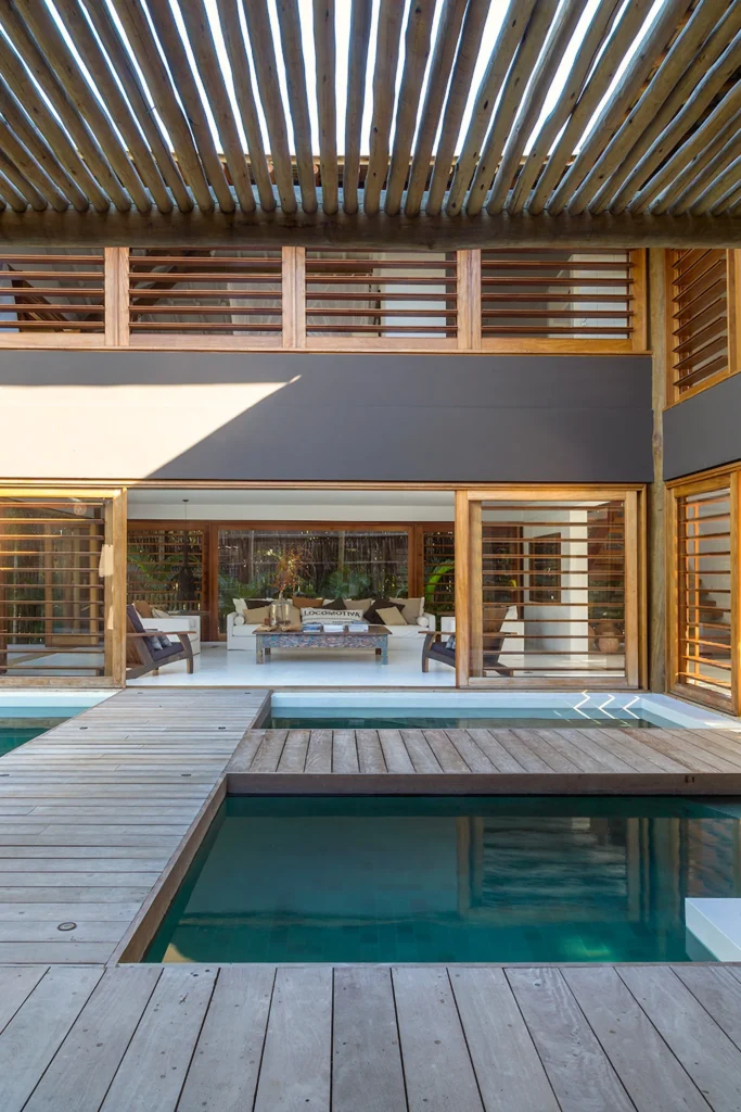 As passarelas em deck de madeira que atravessam a área da piscina criam percursos suspensos e sombreados, ampliando a relação entre arquitetura, água e jardim, além de trazer ainda mais frescor ao conjunto. Cada escolha construtiva — da materialidade à implantação — foi pensada para valorizar o clima, a luz e o modo de viver local.